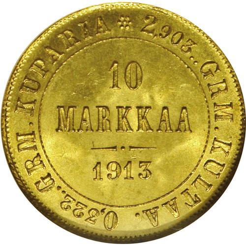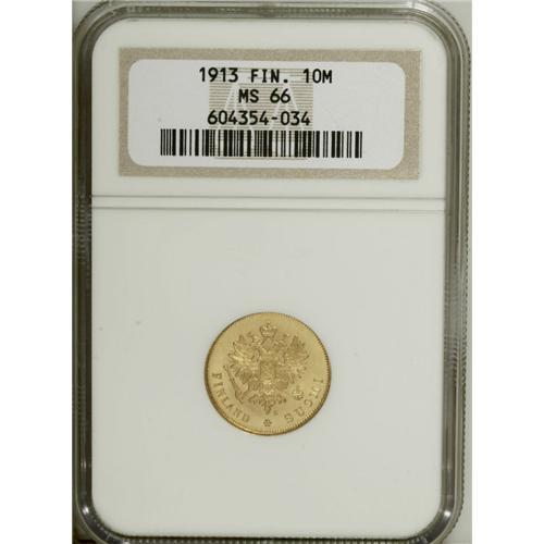 <B>Russian Duchy gold 10 Markkaa 1913, </B></I>KM8.2, MS66 NGC, brilliant with virtually flawless surfaces.<BR><BR><b>Shipping:</b> Coin/Currency (<a target="_blank" href="http://www.heritageauctions.com/common/shipping.php">view shipping information</a>)