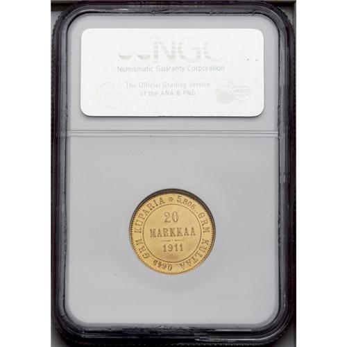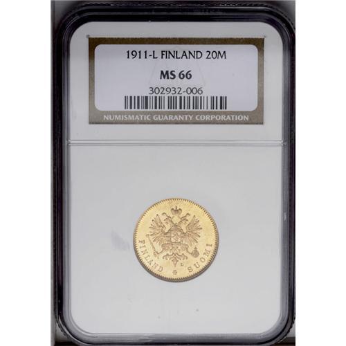 Russian Duchy gold 20 Markkaa 1911L, KM-9.2, MS66 NGC. Russian Duchy gold 20 Markkaa 1911L,