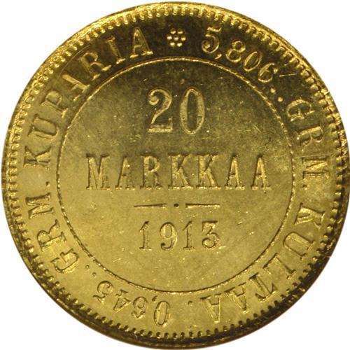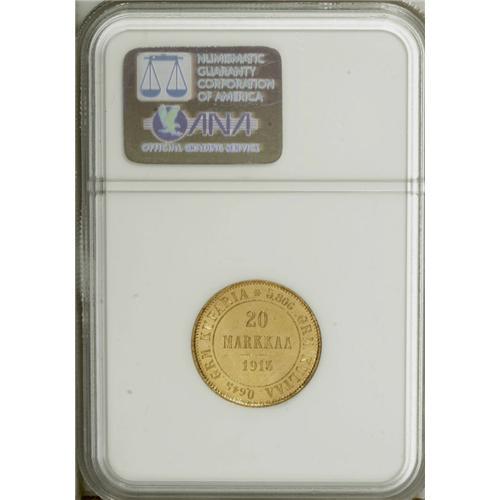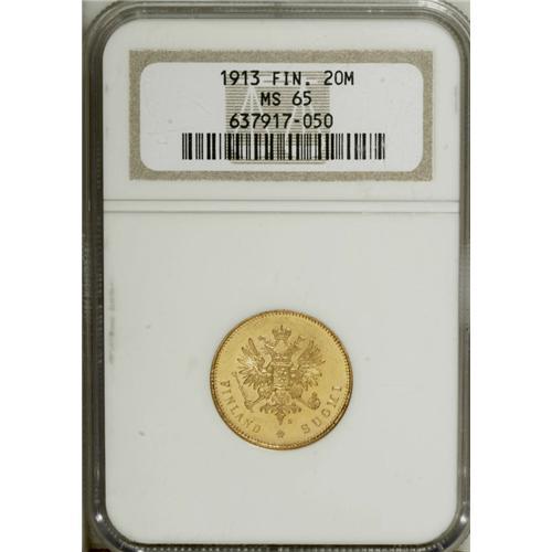 <B>Russian Duchy gold 20 Markkaa 1913, </B></I>KM9.2, MS65 NGC, fully brilliant with flashy surfaces.<BR><BR><b>Shipping:</b> Coin/Currency (<a target="_blank" href="http://www.heritageauctions.com/common/shipping.php">view shipping information</a>)