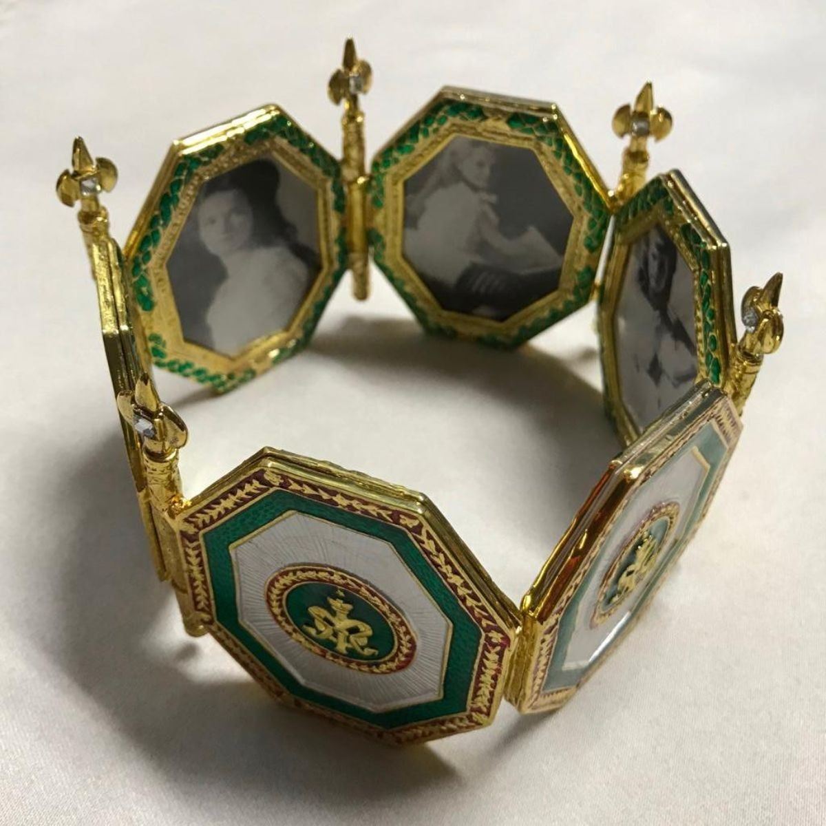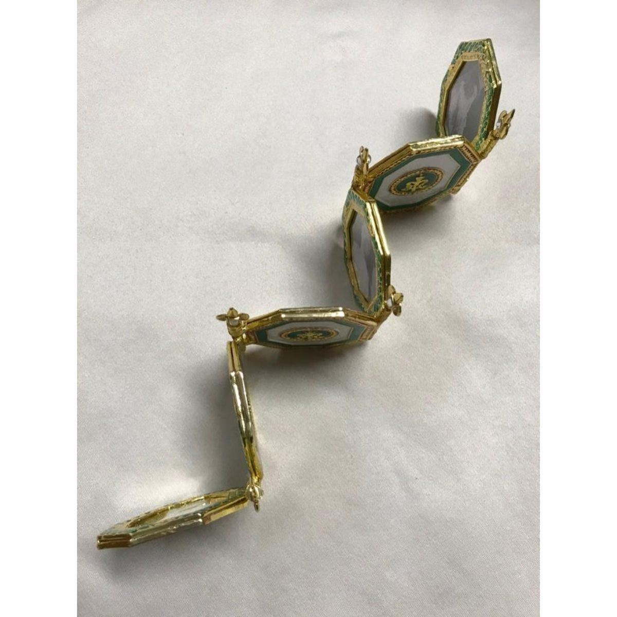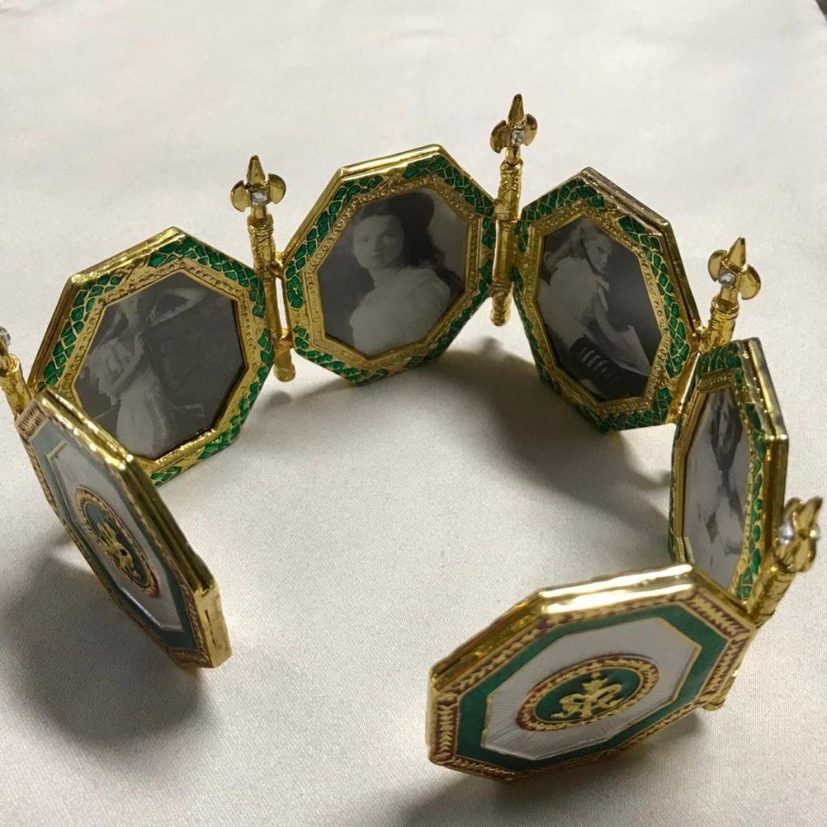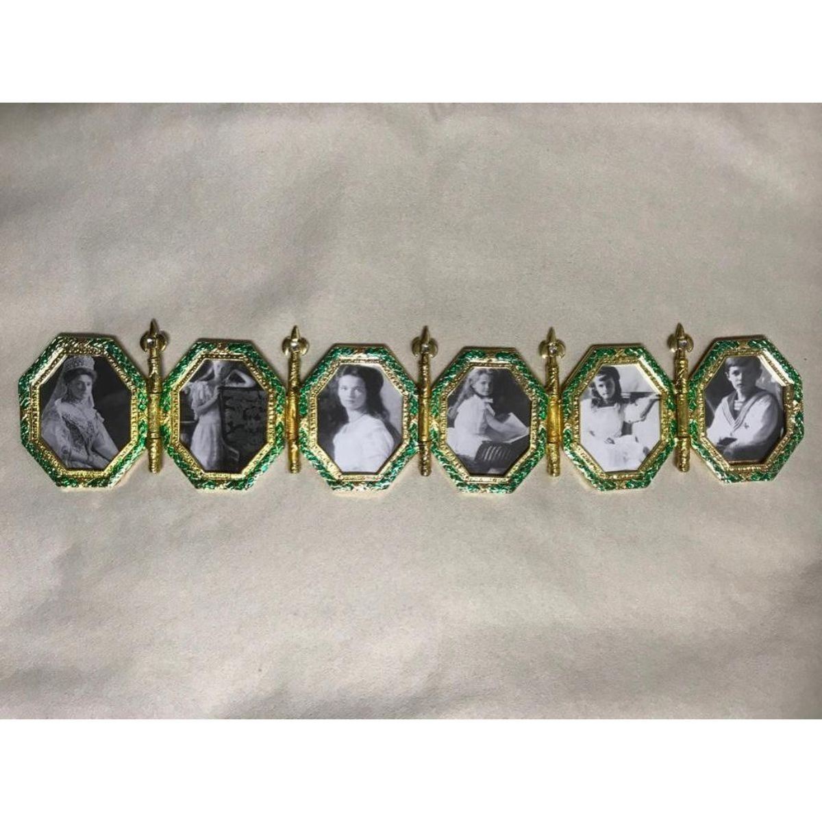 Enamel & gilt folding screen of small photo frames  ( 6 total ) created after the original 1912 design by Carl Faberge for the Russian Royal family. Enamel & gilt over pewter with embedded Austrian crystals. The frames stack one upon the other & fold inward or outward on hinges, the photos lift out to customize. 2 3/4" X 2 1/2" each frame size. All photos stretch out to be 13 1/4" L. 1 1/2" X 2" photo openings.Â