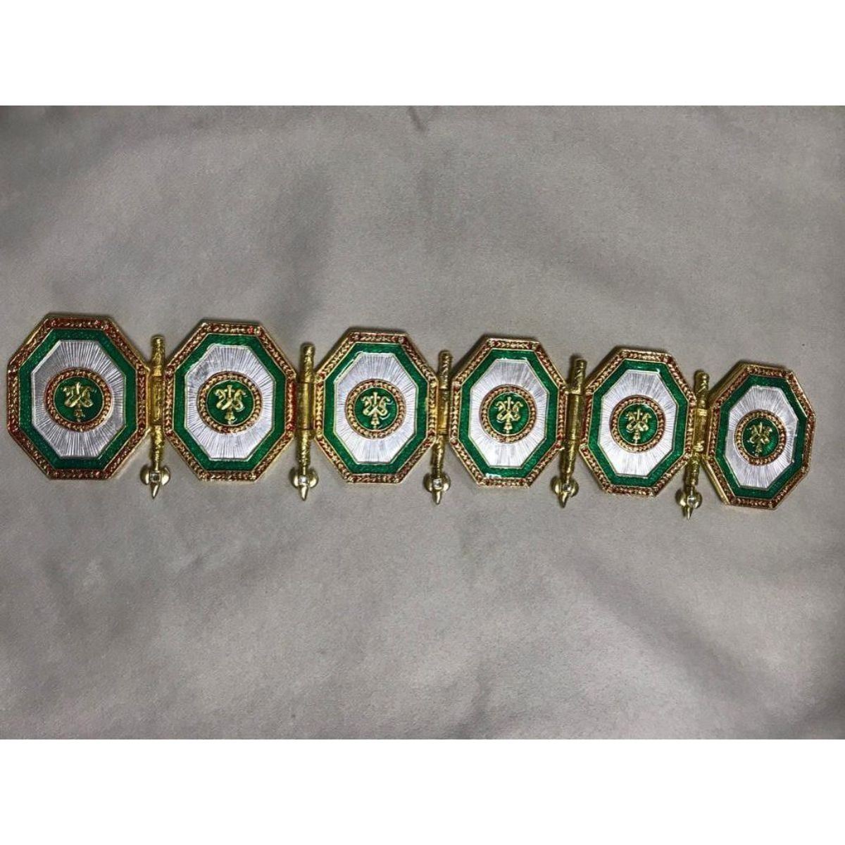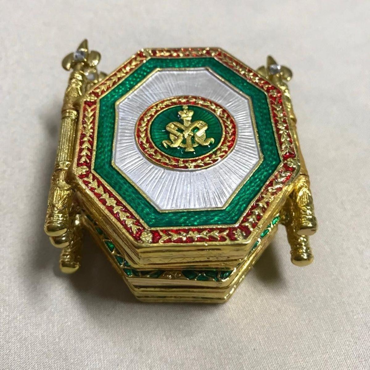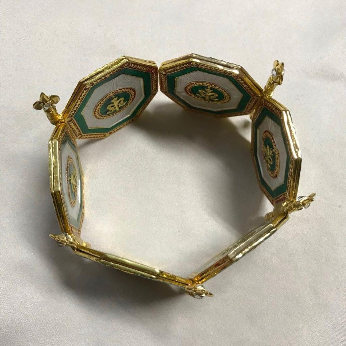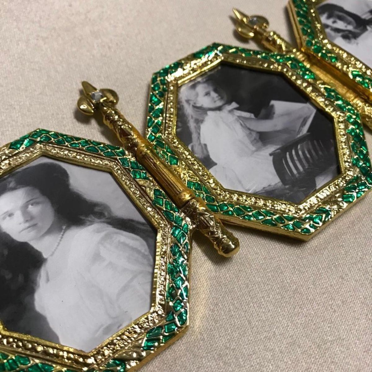 Enamel & gilt folding screen of small photo frames  ( 6 total ) created after the original 1912 design by Carl Faberge for the Russian Royal family. Enamel & gilt over pewter with embedded Austrian crystals. The frames stack one upon the other & fold inward or outward on hinges, the photos lift out to customize. 2 3/4" X 2 1/2" each frame size. All photos stretch out to be 13 1/4" L. 1 1/2" X 2" photo openings.Â