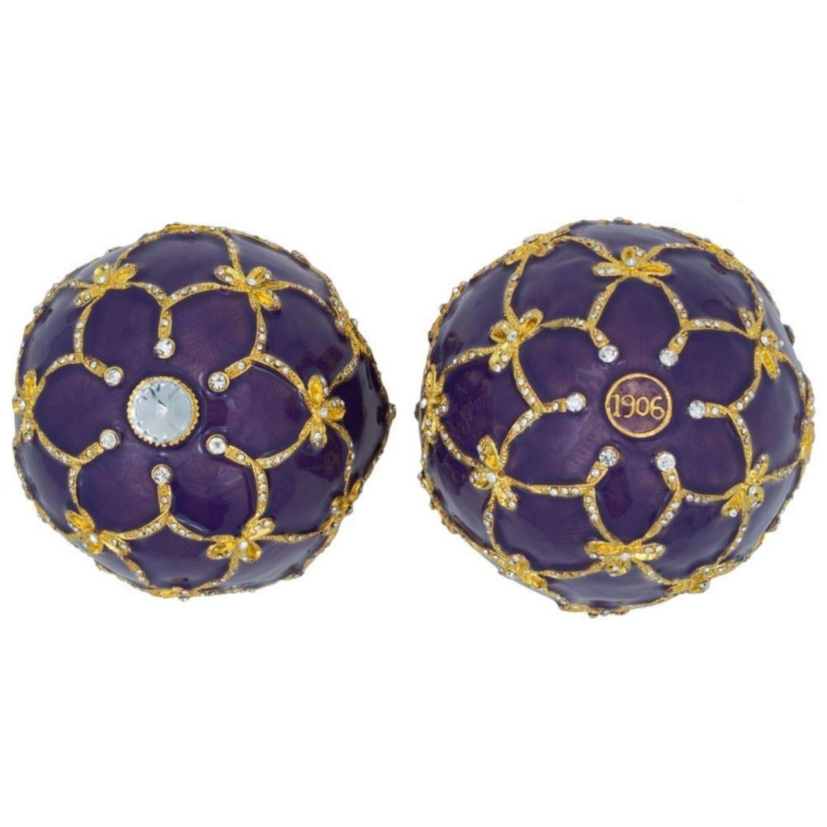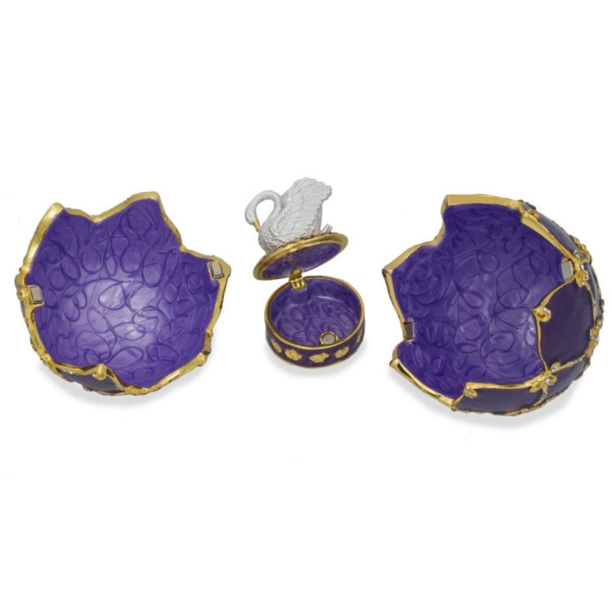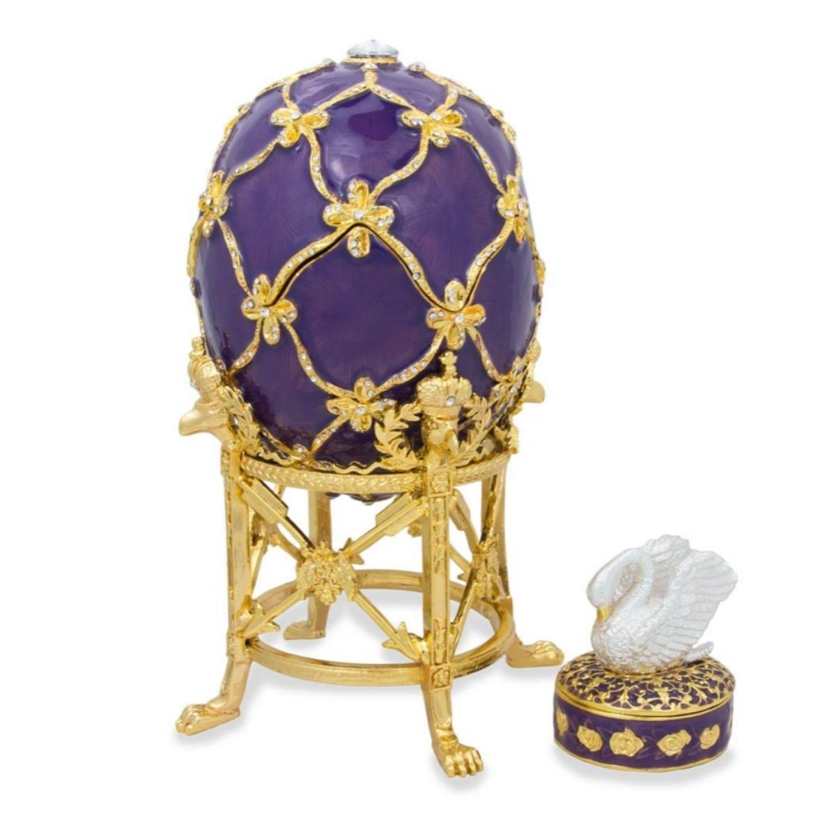 After Faberge's 1906 Swan Trinket Box Egg, Russian enamel & gilt over pewter, with embedded Austrian crystals. The replica egg lifts off the gilt stand & opens at center, with magnetic closure, to reveal a tiny interior trinket box, adorned with a swan on top, for storing trinkets or jewels. 4" H egg ( 6" H with stand, 3" D. Comes with gift box. History of the original Swan Egg - The Swan Egg was ordered in 1906 by Tsar Nicholas II, and presented to the Dowager Empress Maria Feodorovna on Easter that year for her 40th wedding anniversary. It was made of mauve enamel, with gold trim. On the exterior, a twisted ribbon trellis design of rose-cut diamonds, as well as a portrait diamond on the top inscribed - 1906. Another portrait diamond on the other end once held the Imperial monograph. The surprise that came inside the egg was a miniature gold and silver swan on a lake of aquamarine. Â