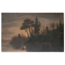 Artist: Unsigned. Subject/Title: Night scene of a river view of the rear of the Taj Mahal. Date Created: 19th century. Medium: oil on canvas. ...