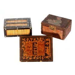 Three early 20th century boxes: an Italian inlaid box, a Japanese folk art box, and an Indian quill box. The largest box measures 2 1/2 inches high x