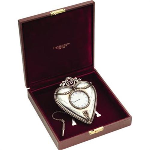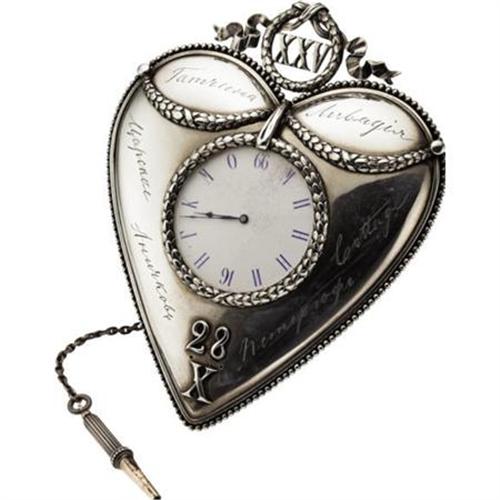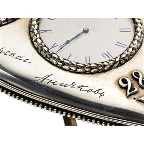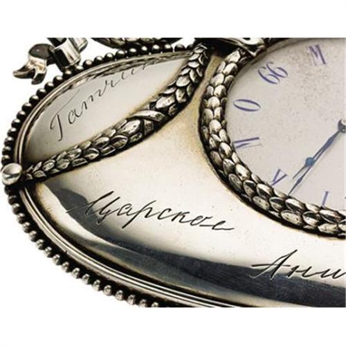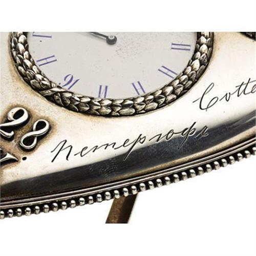 <B>Rare Imperial Russian Fabergé Alexander III 25th Wedding Anniversary Presentation Desk Clock</B></I><BR><I>Workmaster Ivan Rappaport, St. Petersburg, circa 1891, signed IP, and Fabergé in Cyrillic</B></I><BR><BR>The heart-shaped silver clock engraved in Cyrillic script with the names of the Tsar's Imperial residences <I>Gatchina, Livadia, Tsarskoe (Selo), Anichkov, Peterhof, </B></I> and <I>Cottage</B></I>,<I> </B></I>the top applied with Roman numerals <I>XXV </B></I>within an openwork<I> </B></I>ribbon-tied laurelleaf wreath, the base, <I>28 X (October), </B></I>enclosing a round white enamel dial with blue chapters, the years <I>(18)66</B></I> and <I>(18)91</B></I> as twelve o'clock and six o'clock respectively, the numerals one to five replaced by Cyrillic letters <I>M I N N I </B></I> spelling the Emperor's favorite name for the Empress, with the balance of the chapters represented by the first Cyrillic letter of each of their children's names: <I>N G K M O</B></I>, for Nicholas, George, Xenia, Michael, and Olga, within a raised laurel border, the silver strut forming the Tsar's initial <I>A, </B></I>the 8-day movement signed by Moser, with attached key on chain-5 1/2 in. high<BR><BR><I>Alexander III and Maria Fedorovna</B></I><BR><BR>The last Tsar to carry out his full reign, Alexander III ruled Russia from 1881 to 1894. Alexander acceded to the throne on March 14, 1881, a day after the assassination of his father, Emperor Alexander II, by a terrorist's bomb. Having inherited the Romanov crown in turbulent circumstances, Alexander III ruled his empire with an iron hand. Yet although he reversed some of his more liberal predecessor's reforms, he was not a blind reactionary. Alexander's thirteen-year reign witnessed the beginnings of industrialization, healthy state finances, and the start of the Trans-Siberian Railway. More important, the Emperor also restored his realm's stature as a great power after humiliating military and diplomatic defeats in the previous decades. Dubbed the "Tsar Peacemaker" (<I>tsar mirotvorets</B></I>), Alexander was the only Romanov monarch for well over a century not to have seen his soldiers at war.<BR><BR>With a powerful six-foot physique, stern blue-gray eyes, and a full, black beard, Alexander III fully personified the mighty Russian autocracy. His strength was such that he entertained his guests by bending horseshoes and iron pokers. When at one state dinner the Austrian Ambassador hinted that his emperor might mobilize two or three army corps on Russia's border to resolve a quarrel in the Balkans, Alexander calmly picked up a silver fork, tied it into a knot and placed it on the startled diplomat's plate, adding, "This is how I will deal with your corps." A man of simple tastes, the tsar preferred the amusements of the hunt and the parlor to the more lavish pleasures of the St Petersburg court. Remarkably for a highborn Russian, Alexander was also utterly devoted to his wife, the Empress Maria Fedorovna.<BR><BR>Born Princess Dagmar of Denmark, the future Tsarina had been intended for Alexander's older brother, Grand Duke Nicholas Alexandrovich. However, the Tsarevich fell mortally ill, and on his deathbed is said to have placed his fiancée's hand in his brother's, commanding him to love her. Now the heir to the throne, Alexander III carried out the will, and the two were wed on November 9, 1866. By all accounts, the imperial couple enjoyed a harmonious and loving marriage. Maria presented her husband with five children, including the future Tsar Nicholas II.<BR><BR>The Empress was very careful not openly to interfere in politics. At the same time, she was the only person in Russia the Tsar allowed to influence his rule. It was partly at her urging that Alexander concluded the military alliance with the French Republic in 1894, a step that transformed European diplomacy.<BR><BR>Maria Fedorovna was much loved by her adopted subjects. The petite, dark-haired monarch was blessed with an out-going, gay temperament and easily made friends in St. Petersburg's notoriously venomous <I>haute monde</B></I>. Unlike her austere husband, Marie adored the glittering nightlife of the Imperial capital. By tradition, any ball she attended began with a lively mazurka, her favorite dance. Although she typically had a handsome young guards officer as her partner, her private life was irreproachable. <BR><BR>Despite his frugal ways, Alexander never stinted in presenting jewelry to his adored consort. Among the Empress's favorites was an imposing necklace with no less than nine strands of large pearls, all perfect in color and shape, held together with diamond fleur-de-lis clasps. <BR><BR>On the same silver wedding anniversary, the Imperial couple received from various relatives another silver clock by Fabergé that was massive, sculptural, and imposing. This understated Fabergé timepiece, privately commissioned by the Emperor for his wife symbolized their enduring love on a far more personal level.<BR><BR><I>Fabergé workmaster Julius Rappaport</B></I><BR><BR>Julius Rappaport (1851-1917) joined the House of Fabergé around 1890 and became Head Silver Workmaster of the St. Petersburg workshop. An excellent silversmith specializing in silver-mounted items in the classical style, the Imperial family entrusted Rappaport with the most important commissions. At the 1900 Paris World Exhibition, Rappaport won the Grand Prize for his famous miniature recreations of the Imperial regalia. Along with headworkmaster Michael Perchin and his successor, Henrik Wigström, Rappaport was the only Fabergé workmaster in St. Petersburg to produce clocks for the Imperial Family.<BR><BR>Provenance: <BR>Presented by Tsar Alexander III (r. 1881-1894) to his wife Maria Fedorovna on the occasion of their Silver Wedding Anniversary celebrated on October 28, 1891.<BR><BR>Purchased from A la Vieille Russie<BR><BR><BR><BR><BR><BR><BR><BR><BR><BR><BR><b>Shipping:</b> Requires 3rd Party Shipping 