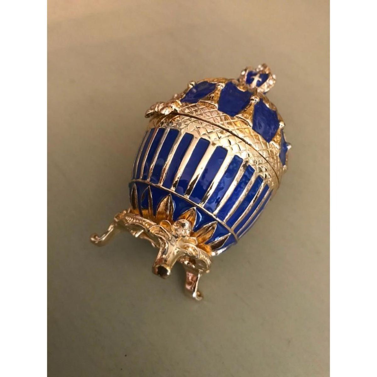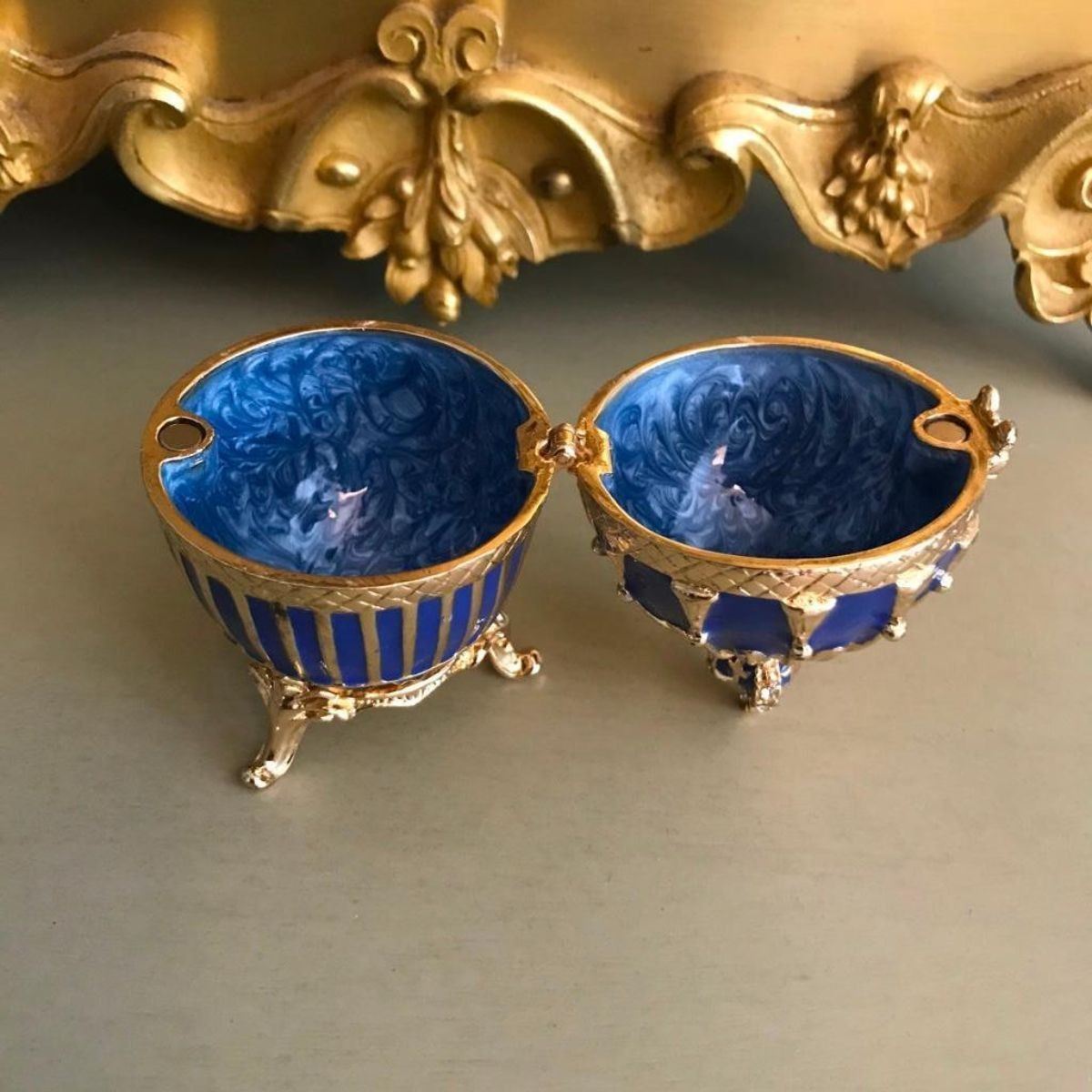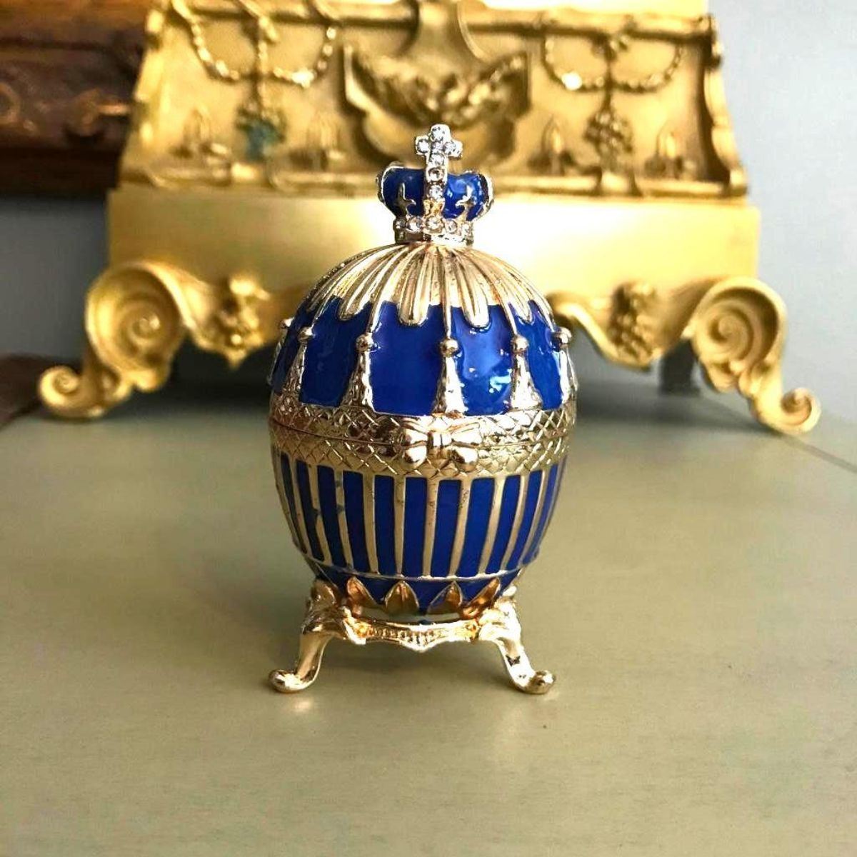 Russian trinket jewel box egg, inspired by the original 1885 Royal Blue Ribbed egg by Carl Faberge, created for the Russian Royal family. Hand-painted enamel & gilt over pewter with embedded Austrian crystals, permanently attached to a gilt footed stand, with a tiny crown at top. Top lifts on a hinge to reveal a hidden swirled enamel compartment for trinkets of jewels, with magnetic closure. 3 1/4" H X 1 3/4" D. Comes with gift box.