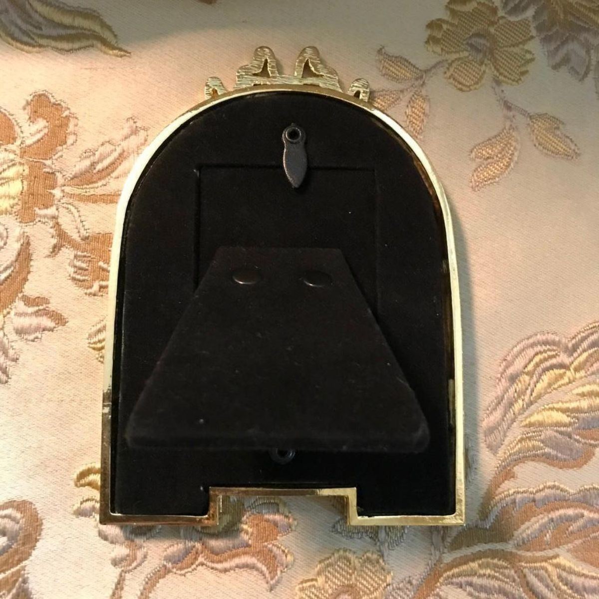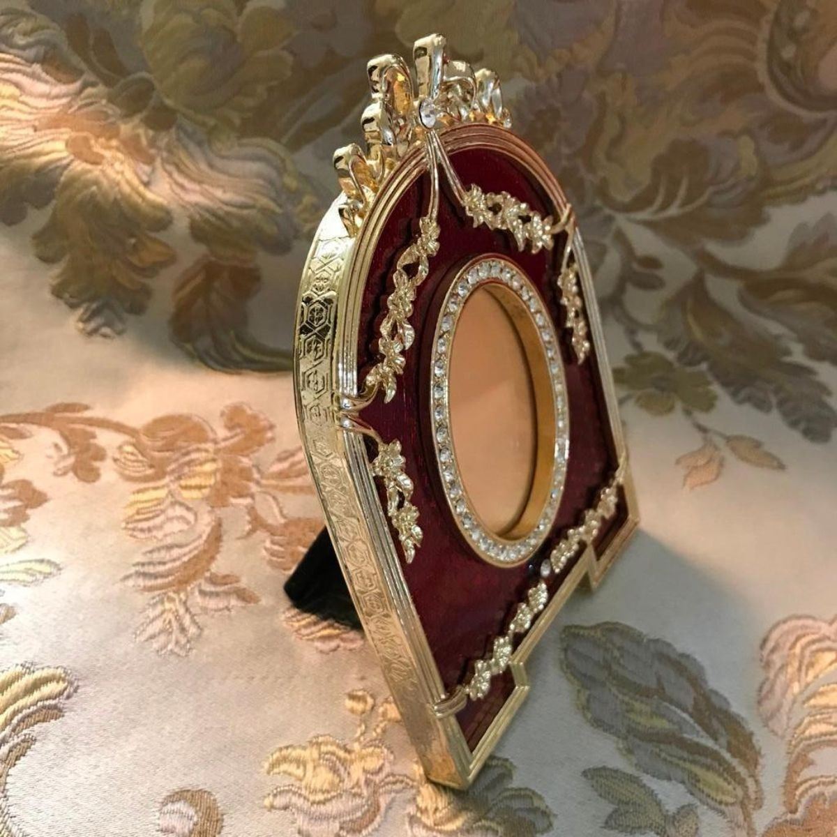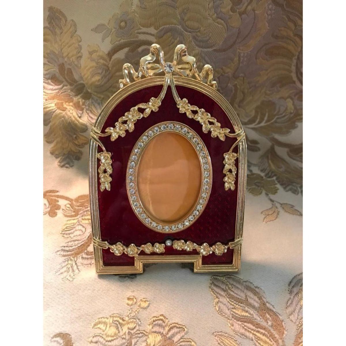 Russian Faberge-style photo frame, guilloche enamel & gilt over pewter, with inset crystals. Beautiful floral swags & top ribbon ornament. 5" H X 3 1/2" W. 1 1/2" X 2" oval photo opening. Comes with gift box.Â
