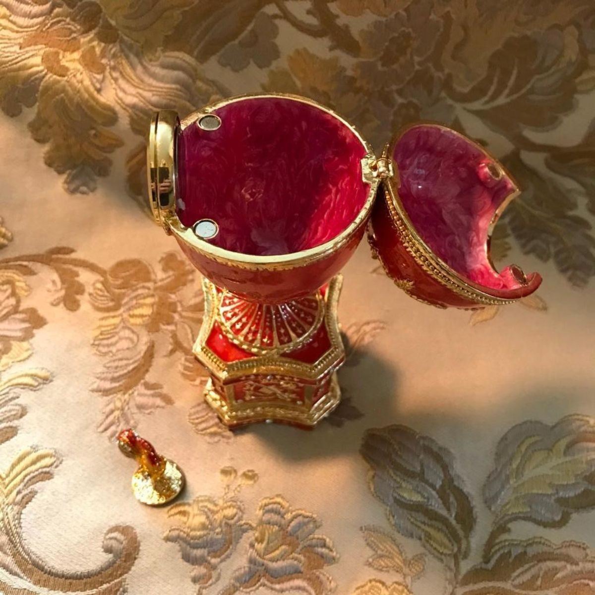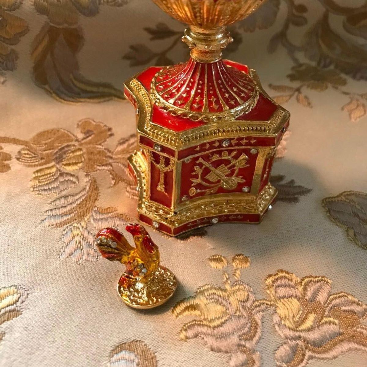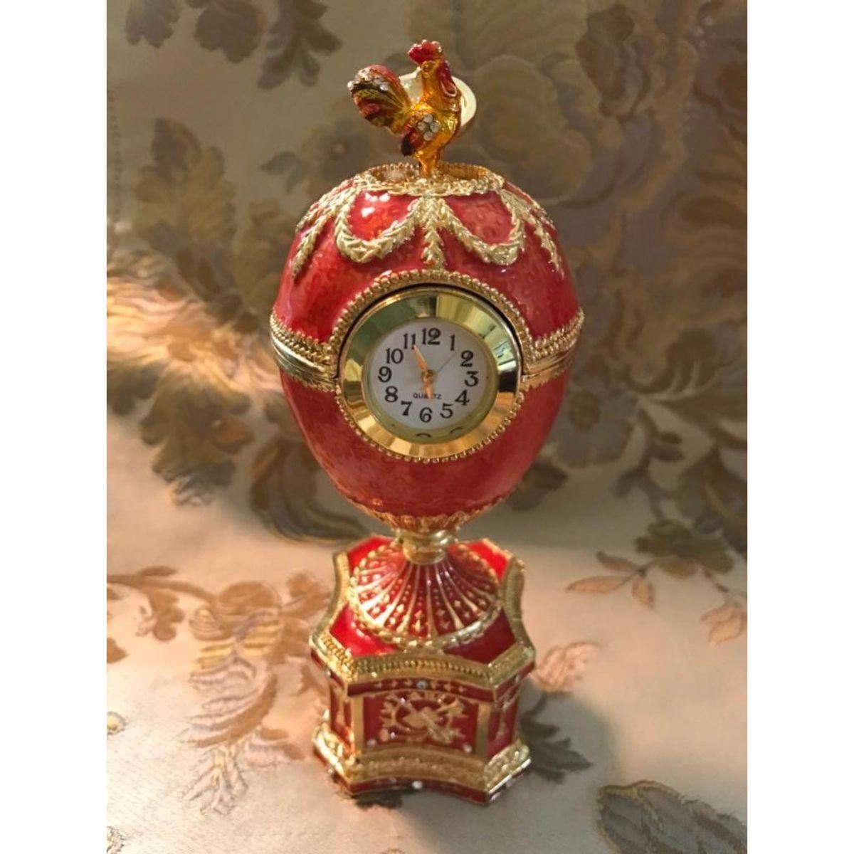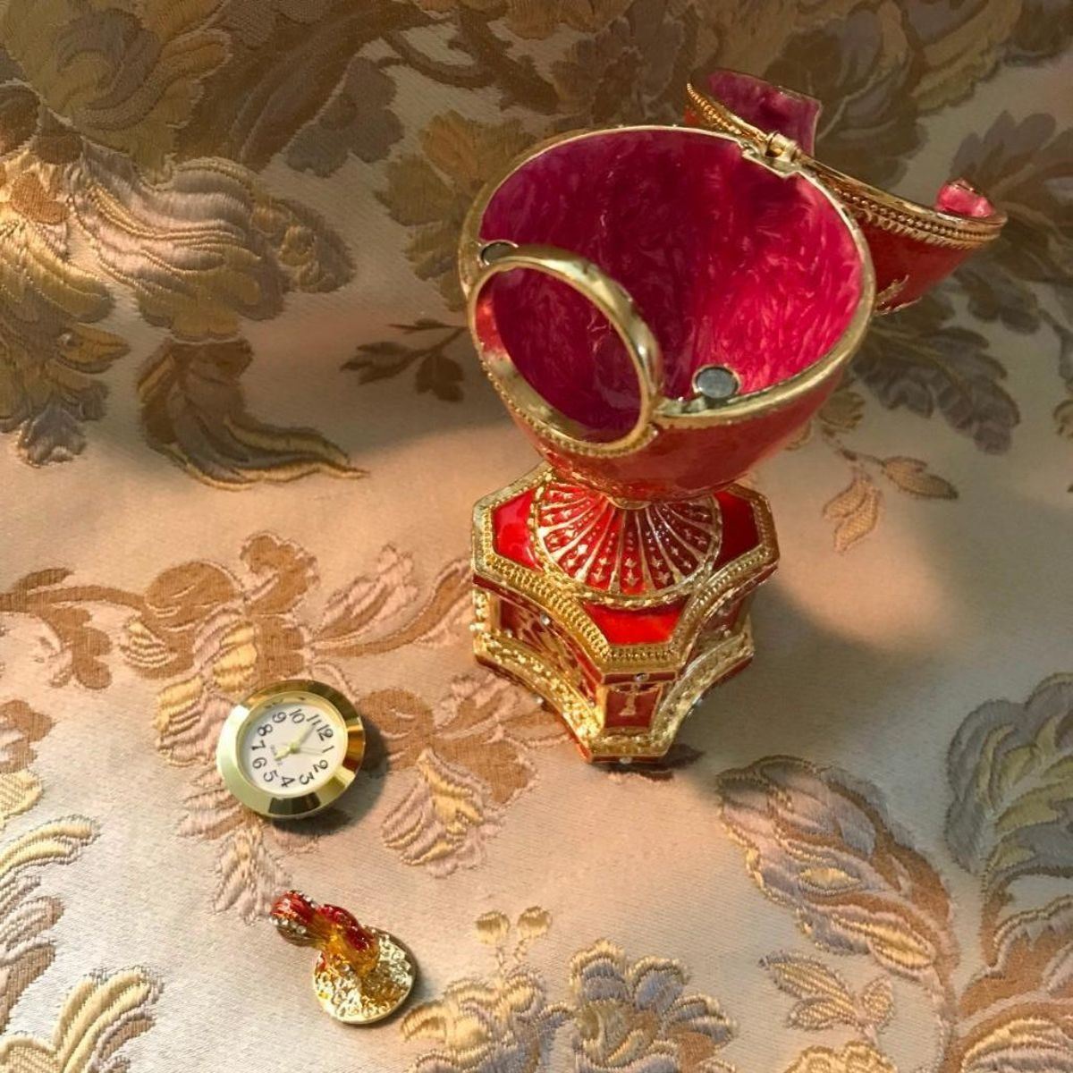 Russian Faberge-style ornamental egg on stand, trinket jewel box, with removable quartz clock & detachable top ornament ( with magnet )  in the form of a tiny chanticleer rooster. Hand-crafted enamel & gilt over pewter with inset crystals, made after the original 1904 Kelch Chanticleer Royal Russian Egg by Faberge. Comes with gift box. 6" H X 2 1/4" W.