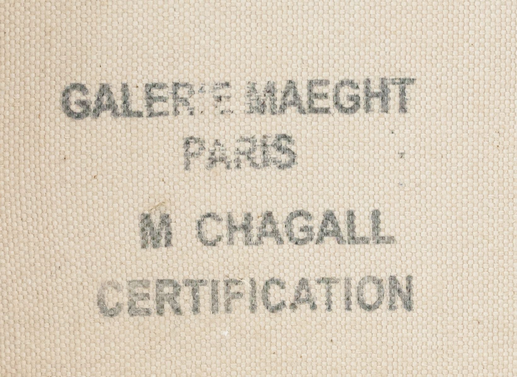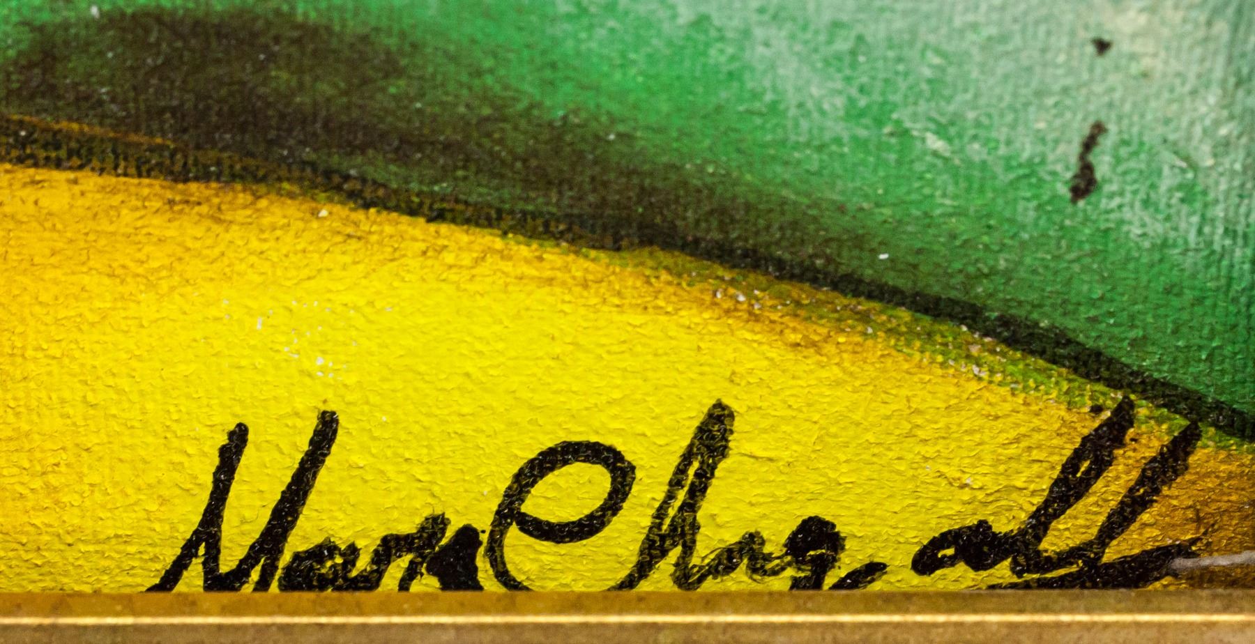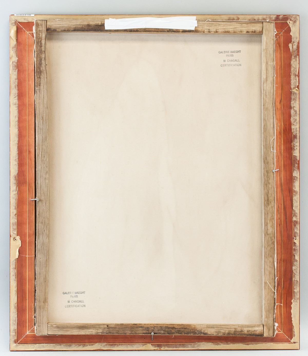 Oil on canvas, framed. Featuring surrealist composition with two faces, one animal and one human, staring at each other. Signed "Marc Chagall" in the bottom right corner. Stamped with "GALERIE MAEGHT PARIS M CHAGALL CERTIFICATION" on verso. 61 x 51 cm (24 x 20 in), Frame: 75 x 65 cm (29.5 x 25.5 in).