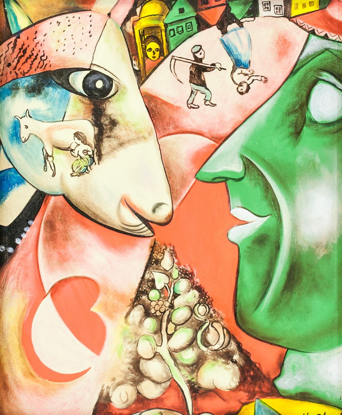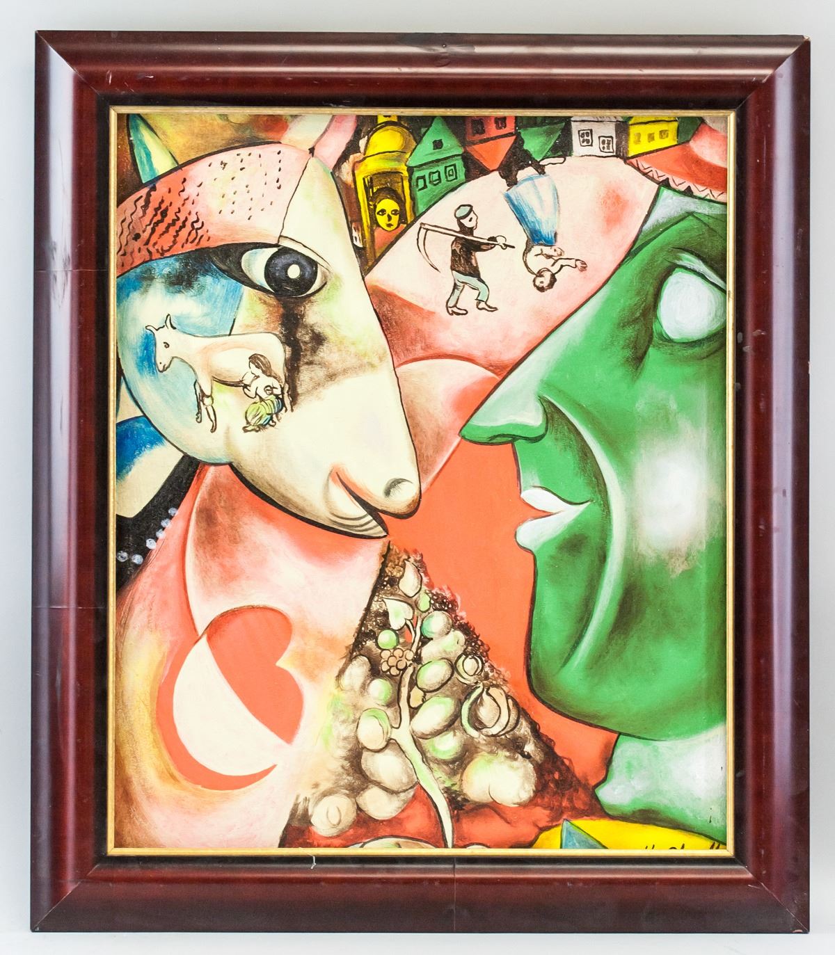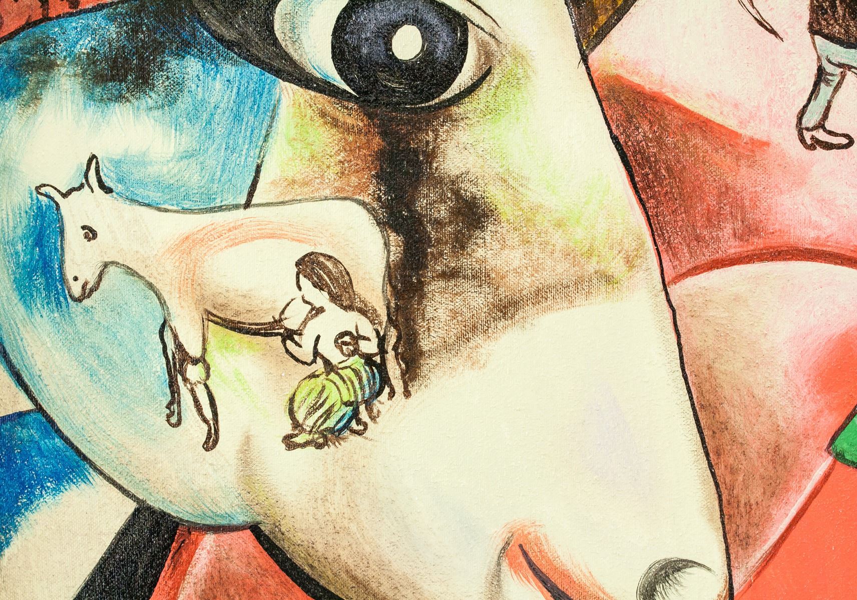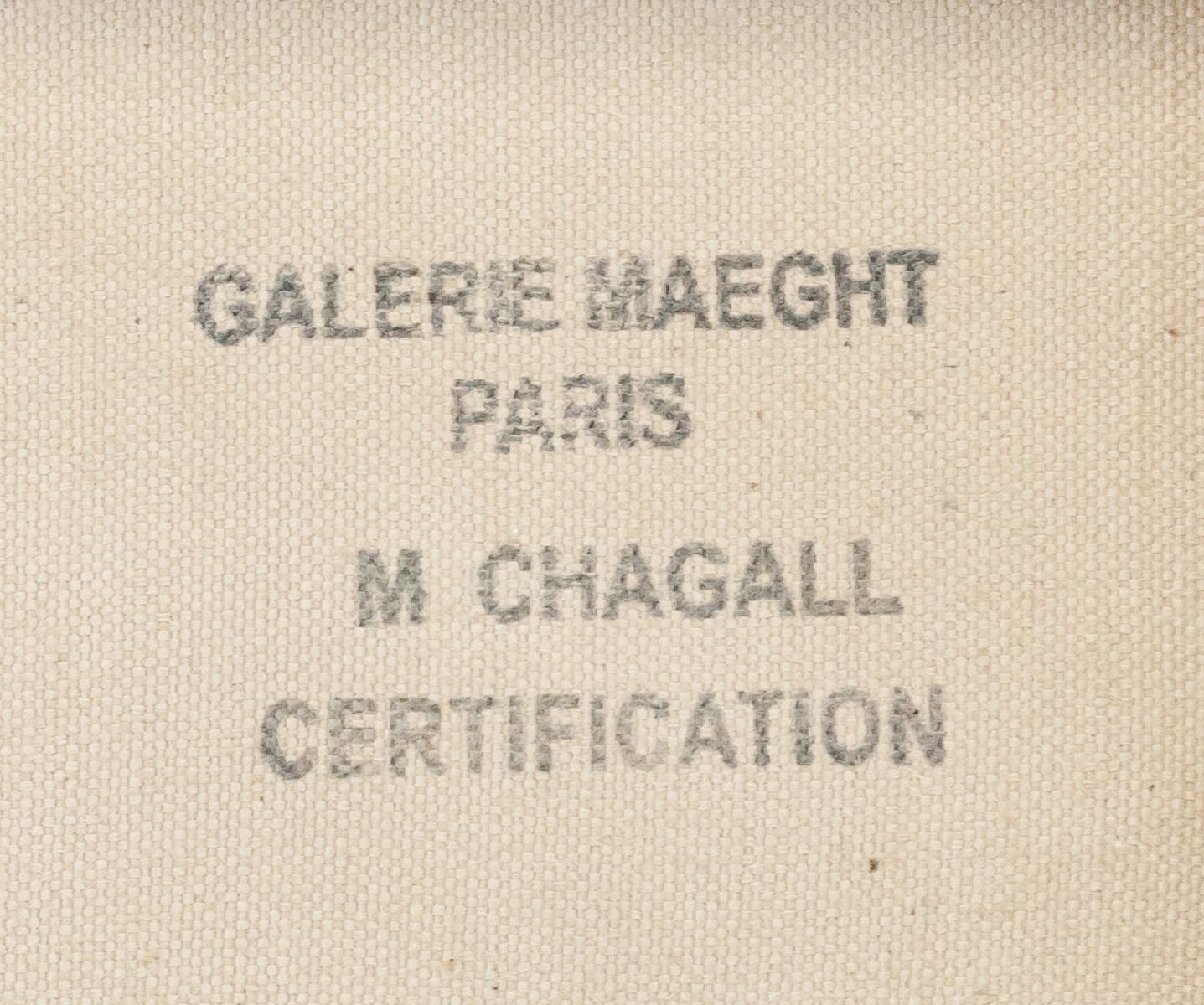 Oil on canvas, framed. Featuring surrealist composition with two faces, one animal and one human, staring at each other. Signed "Marc Chagall" in the bottom right corner. Stamped with "GALERIE MAEGHT PARIS M CHAGALL CERTIFICATION" on verso. 61 x 51 cm (24 x 20 in), Frame: 75 x 65 cm (29.5 x 25.5 in).