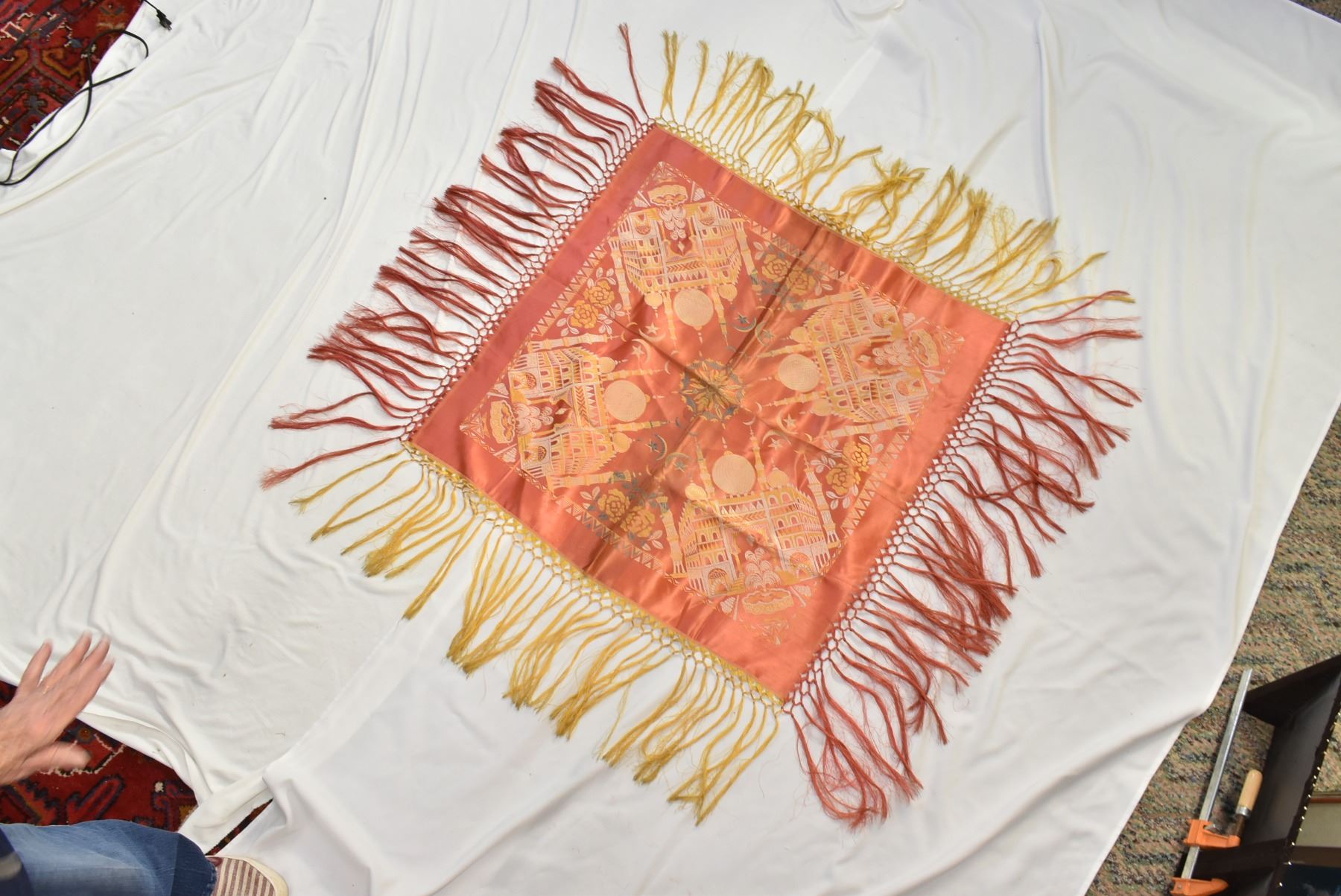 Russian Fringed Silk Shawl, measures 32''W x 32''L which does not include the fringe, fringe measures 10.5''L, beautiful colors