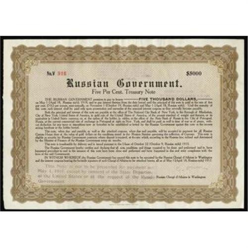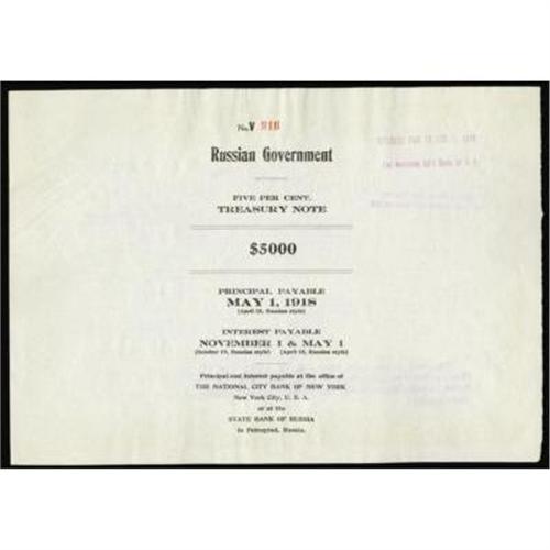 <style type="text/css"> body, td, th { font-family: Arial, Helvetica, sans-serif; font-size: 12px; color: #482424; margin: 0px; padding: 0px; } #header { background-image: url(http://www.bowersandmerena.com/ebay/images/template_v3_01.gif); clear: both; background-color: #590303; border-top-width: 2px; border-top-style: solid; border-top-color: #B38C4F; } #header #header_wrapper { height: 75px; clear: both; width: 800px; margin-right: auto; margin-left: auto; background-image: url(http://www.bowersandmerena.com/ebay/images/template_v3_03.gif); background-repeat: no-repeat; background-position: right; color: #F3EDCC; } #header #header_wrapper #header_logo { float: left; height: 75px; width: 444px; background-image: url(http://www.bowersandmerena.com/ebay/images/template_v3_02.gif); background-repeat: no-repeat; font-size: 10px; text-transform: capitalize; color: #B38C4F; } #header #header_wrapper #header_right { float: left; height: 75px; width: 356px; text-align: right; } #header #header_wrapper #header_right #headerLoginBtn { margin-bottom: 30px; } #header #header_wrapper #header_right input#txtSearch { color: #B49056; border: 1px solid #B49056; width: 175px; padding-top: 3px; padding-right: 3px; padding-bottom: 4px; padding-left: 3px; } #nav { height: 37px; background-image: url(http://www.bowersandmerena.com/ebay/images/template_v3_05.gif); clear: both; } #nav #nav_wrapper { height: 35px; width: 800px; margin-right: auto; margin-left: auto; border-left-width: 1px; border-left-style: solid; border-left-color: #B38C4F; } #nav #nav_wrapper a { padding-right: 15px; padding-left: 15px; border-right-width: 1px; border-right-style: solid; border-right-color: #B38C4F; height: 25px; padding-top: 10px; display: block; float: left; text-decoration: none; font-weight: bold; color: #5D0303; } #nav #nav_wrapper a:hover { color: #B38C4F; } #nav #nav_wrapper #search { float: right; padding-top: 7px; } #nav #nav_wrapper #search #txtSearch { font-family: Arial, Helvetica, sans-serif; font-size: 10px; text-transform: uppercase; color: #D2AE75; border: 1px solid #B38C4F; padding: 3px; } #content_bgd { background-image: url(http://www.bowersandmerena.com/ebay/images/template_v3_09.gif); background-repeat: repeat-y; background-position: center; padding-top: 15px; padding-bottom: 15px; background-color: #FBFBDB; } #content_wrapper { clear: both; height: auto; width: 800px; margin-right: auto; margin-left: auto; } .LotDetailWhite { line-height:normal; font-size:13px; font-family: arial,helvetica,sans-serif; color: White; font-weight: bold; } .LotDetailInformation { line-height:normal; font-size: 13px; font-family: arial,helvetica,sans-serif; } .LotDetailMessage { line-height:normal; font-size: 13px; font-family: arial,helvetica,sans-serif; color: red; } } tr.HeaderAuctionTitle td { color: #000000; font-weight: bold; padding: 2px; background-image: url(http://www.bowersandmerena.com/ebay/images/template_v3_05.gif); background-repeat: repeat-x; border-bottom-width: 1px; border-bottom-style: solid; border-bottom-color: #B38C4F; } table.AuctionSummary a, table.AuctionSummary a:link, table.AuctionSummary a:visited { color: #0000FF; text-decoration: none; } } td.tableHeaderLeft { border-left-width: 1px; border-left-style: solid; border-left-color: #B38C4F; } td.tableHeaderRight { border-right-width: 1px; border-right-style: solid; border-right-color: #B38C4F; } td.tableCellMiddle { border-left-width: 1px; border-left-style: solid; border-left-color: #B38C4F; border-right-width: 1px; border-right-style: solid; border-right-color: #B38C4F; padding: 5px; } tr.footer td { border-top-width: 1px; border-top-style: solid; border-top-color: #B38C4F; } </style> </head> <body> <div id="header"> <div id="header_wrapper"> <div id="header_logo"> </div> <div id="header_right"> </div> </div> </div> <div id="nav"> <div id="nav_wrapper"> <a href="http://www.bowersandmerena.com">Our eBayLive Auctions</a> <a href="#PaymentInfo">Payment Information</a> <a href="#ShippingInfo">Shipping Information</a> <a href="#About">About Bowers and Merena</a> </div> </div> <div id="content_bgd"> <div id="content_wrapper"> <table width="100%" border="0" cellpadding="5" cellspacing="0" class="AuctionSummary"> <tbody> <tr class="HeaderAuctionTitle" style="height: 25px;"> <td align="left" class="tableHeaderLeft" > </td> <td align="center" class="tableHeaderRight"> <span style="font-size: large;">Lot #2477. Russia. Russian Government 5% Treasury Note Issued.</span> </td> </tr> <tr> <td colspan="3" class="tableCellMiddle"> May 1, 1917. $5000. 5% Gold Bond. P-Unlisted. Issued and uncancelled Treasury Note or Bond. Brown border and undertint. Signed by the Russian Charge D'Affaires in Washington. Purple overprints on the upper middle and the lower left referring to the note not to be presented for payment until May 1, 1919. ABNC. VF-XF condition with lower left margin just touching left border. Rare Russian Fiscal Item. This bond helped finance the Kerenski Government's fight against Germany. We declared war on Germany in April 1917 and these notes are dated May 1, 1917. These are U.S. dollar bonds payable in Gold that can be considered a U.S. Government Issue as well as a Russian Bond Issue, since they all have "U.S. State Department" hand stamps on them and were issued by National City Bank with U.S. Government limitations on when they could be redeemed.