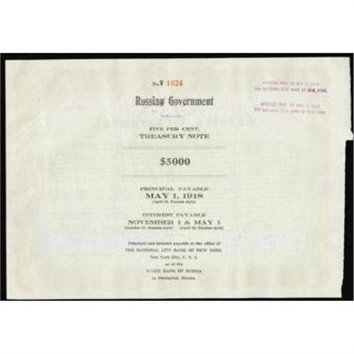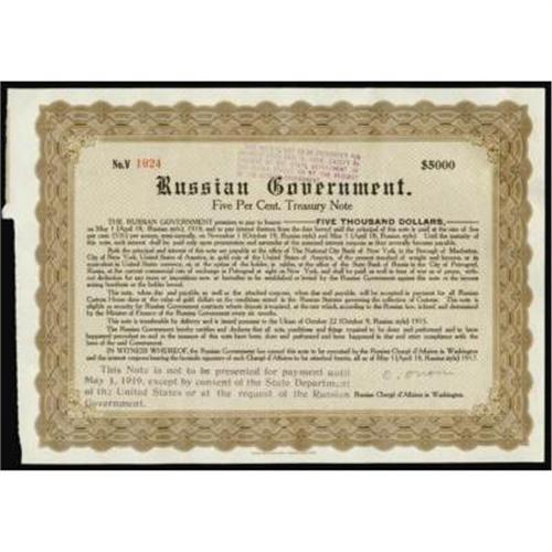 <style type="text/css"> body, td, th { font-family: Arial, Helvetica, sans-serif; font-size: 12px; color: #482424; margin: 0px; padding: 0px; } #header { background-image: url(http://www.bowersandmerena.com/ebay/images/template_v3_01.gif); clear: both; background-color: #590303; border-top-width: 2px; border-top-style: solid; border-top-color: #B38C4F; } #header #header_wrapper { height: 75px; clear: both; width: 800px; margin-right: auto; margin-left: auto; background-image: url(http://www.bowersandmerena.com/ebay/images/template_v3_03.gif); background-repeat: no-repeat; background-position: right; color: #F3EDCC; } #header #header_wrapper #header_logo { float: left; height: 75px; width: 444px; background-image: url(http://www.bowersandmerena.com/ebay/images/template_v3_02.gif); background-repeat: no-repeat; font-size: 10px; text-transform: capitalize; color: #B38C4F; } #header #header_wrapper #header_right { float: left; height: 75px; width: 356px; text-align: right; } #header #header_wrapper #header_right #headerLoginBtn { margin-bottom: 30px; } #header #header_wrapper #header_right input#txtSearch { color: #B49056; border: 1px solid #B49056; width: 175px; padding-top: 3px; padding-right: 3px; padding-bottom: 4px; padding-left: 3px; } #nav { height: 37px; background-image: url(http://www.bowersandmerena.com/ebay/images/template_v3_05.gif); clear: both; } #nav #nav_wrapper { height: 35px; width: 800px; margin-right: auto; margin-left: auto; border-left-width: 1px; border-left-style: solid; border-left-color: #B38C4F; } #nav #nav_wrapper a { padding-right: 15px; padding-left: 15px; border-right-width: 1px; border-right-style: solid; border-right-color: #B38C4F; height: 25px; padding-top: 10px; display: block; float: left; text-decoration: none; font-weight: bold; color: #5D0303; } #nav #nav_wrapper a:hover { color: #B38C4F; } #nav #nav_wrapper #search { float: right; padding-top: 7px; } #nav #nav_wrapper #search #txtSearch { font-family: Arial, Helvetica, sans-serif; font-size: 10px; text-transform: uppercase; color: #D2AE75; border: 1px solid #B38C4F; padding: 3px; } #content_bgd { background-image: url(http://www.bowersandmerena.com/ebay/images/template_v3_09.gif); background-repeat: repeat-y; background-position: center; padding-top: 15px; padding-bottom: 15px; background-color: #FBFBDB; } #content_wrapper { clear: both; height: auto; width: 800px; margin-right: auto; margin-left: auto; } .LotDetailWhite { line-height:normal; font-size:13px; font-family: arial,helvetica,sans-serif; color: White; font-weight: bold; } .LotDetailInformation { line-height:normal; font-size: 13px; font-family: arial,helvetica,sans-serif; } .LotDetailMessage { line-height:normal; font-size: 13px; font-family: arial,helvetica,sans-serif; color: red; } } tr.HeaderAuctionTitle td { color: #000000; font-weight: bold; padding: 2px; background-image: url(http://www.bowersandmerena.com/ebay/images/template_v3_05.gif); background-repeat: repeat-x; border-bottom-width: 1px; border-bottom-style: solid; border-bottom-color: #B38C4F; } table.AuctionSummary a, table.AuctionSummary a:link, table.AuctionSummary a:visited { color: #0000FF; text-decoration: none; } } td.tableHeaderLeft { border-left-width: 1px; border-left-style: solid; border-left-color: #B38C4F; } td.tableHeaderRight { border-right-width: 1px; border-right-style: solid; border-right-color: #B38C4F; } td.tableCellMiddle { border-left-width: 1px; border-left-style: solid; border-left-color: #B38C4F; border-right-width: 1px; border-right-style: solid; border-right-color: #B38C4F; padding: 5px; } tr.footer td { border-top-width: 1px; border-top-style: solid; border-top-color: #B38C4F; } </style> </head> <body> <div id="header"> <div id="header_wrapper"> <div id="header_logo"> </div> <div id="header_right"> </div> </div> </div> <div id="nav"> <div id="nav_wrapper"> <a href="http://www.bowersandmerena.com">Our eBayLive Auctions</a> <a href="#PaymentInfo">Payment Information</a> <a href="#ShippingInfo">Shipping Information</a> <a href="#About">About Bowers and Merena</a> </div> </div> <div id="content_bgd"> <div id="content_wrapper"> <table width="100%" border="0" cellpadding="5" cellspacing="0" class="AuctionSummary"> <tbody> <tr class="HeaderAuctionTitle" style="height: 25px;"> <td align="left" class="tableHeaderLeft" > </td> <td align="center" class="tableHeaderRight"> <span style="font-size: large;">Lot #2478. Russia. Russian Government 5% Treasury Note Issued.</span> </td> </tr> <tr> <td colspan="3" class="tableCellMiddle"> May 1, 1917. $5000. 5% Gold Bond. P-Unlisted. Issued and uncancelled Treasury Note or Bond. Brown border and undertint. Signed by the Russian Charge D'Affaires in Washington. Purple overprints on the upper middle and the lower left referring to the note not to be presented for payment until May 1, 1919. ABNC. VF-XF condition with lower left margin just touching left border. Rare Russian Fiscal Item. This bond helped finance the Kerenski Government's fight against Germany. We declared war on Germany in April 1917 and these notes are dated May 1, 1917. These are U.S. dollar bonds payable in Gold that can be considered a U.S. Government Issue as well as a Russian Bond Issue, since they all have "U.S. State Department" hand stamps on them and were issued by National City Bank with U.S. Government limitations on when they could be redeemed.