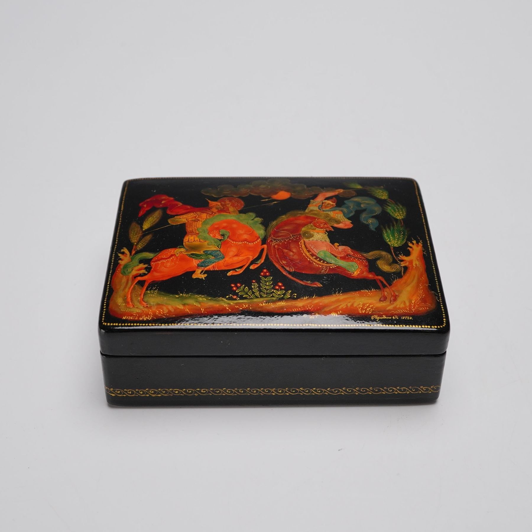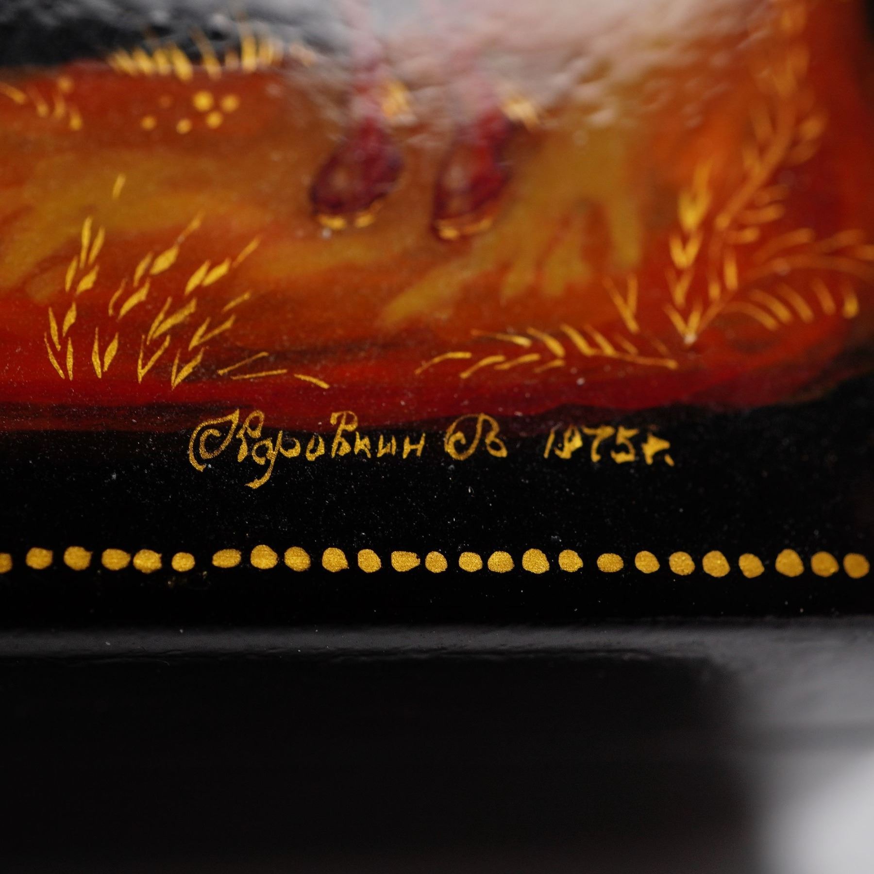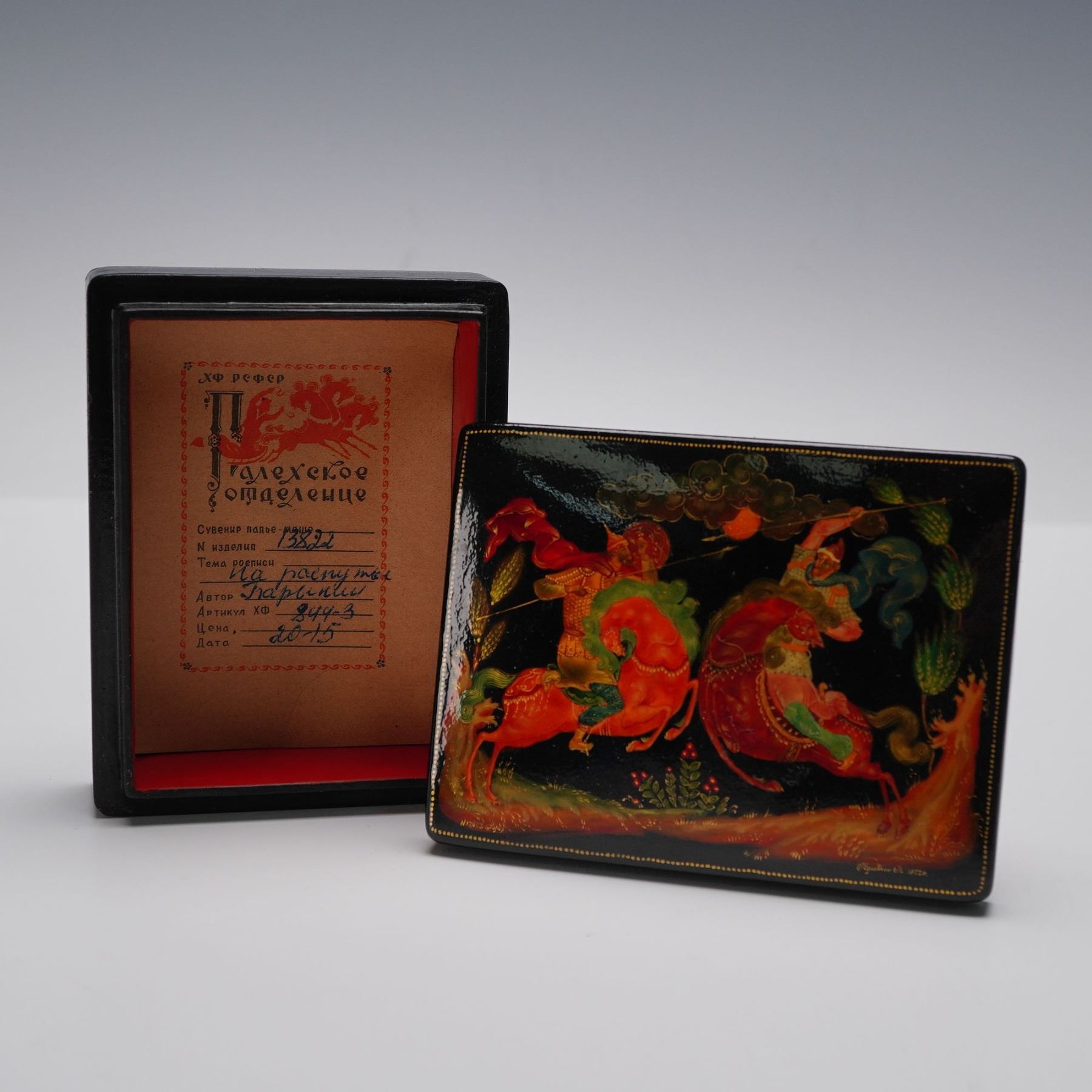 Finely hand-painted Russian black lacquer box depicting a dynamic battle scene with two mounted warriors in vivid hues of red, gold, and green against a dark background. The piece exhibits the signature style of the Palekh School, known for its miniature paintings on papier-mache boxes with exquisite detail and gold highlights. Signed and dated by the artist V. Karpukhin, 1975, in Cyrillic to the lower right. The underside bears the gold inscription "Made in USSR" and the interior retains its original red lacquer lining and certificate label. A remarkable example of Soviet-era Palekh artistry, capturing both folkloric and historical themes. N13623.