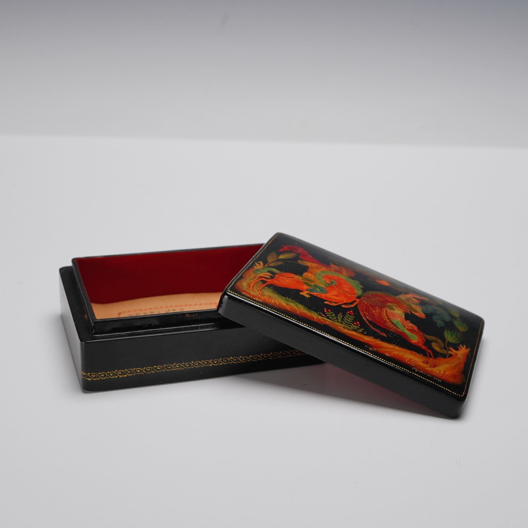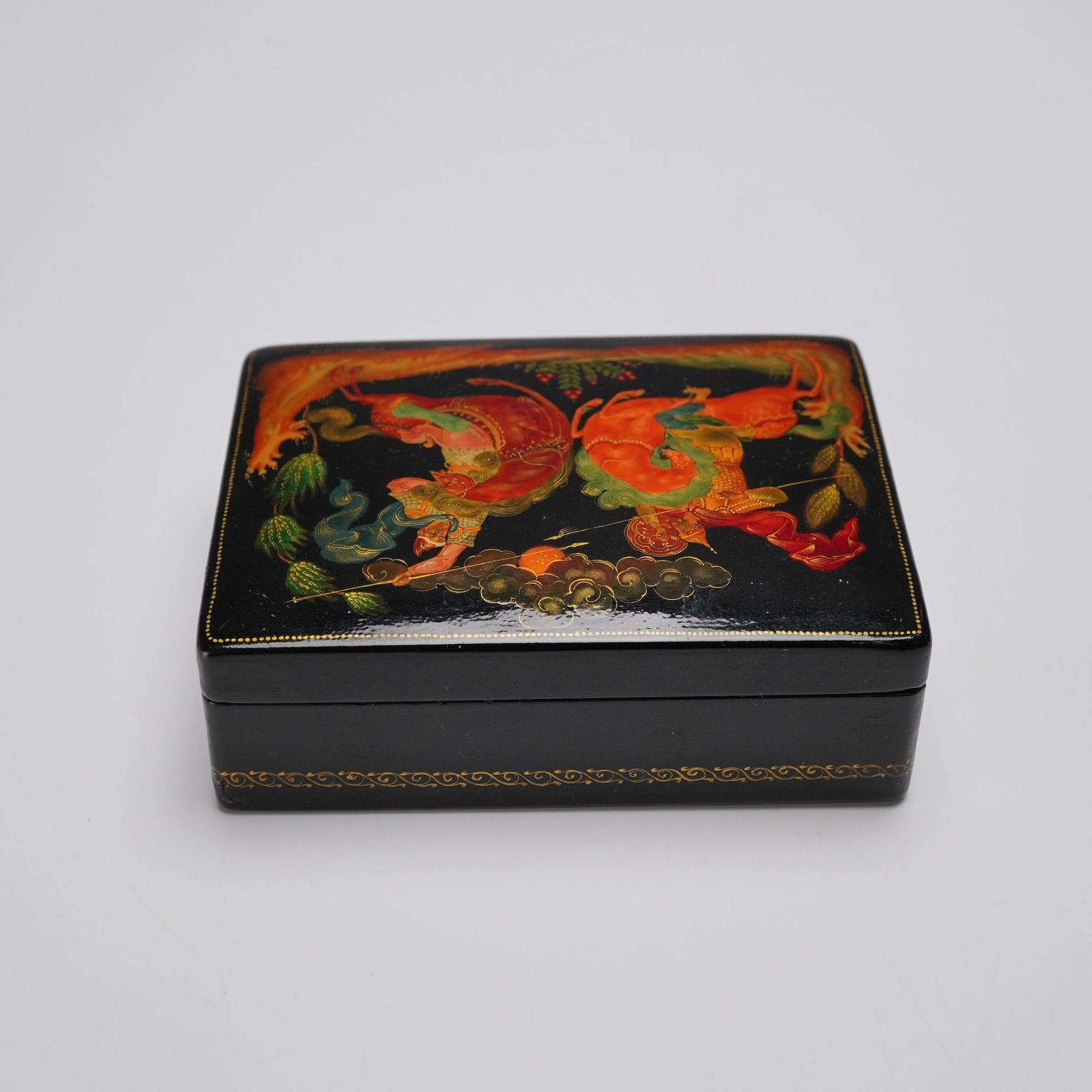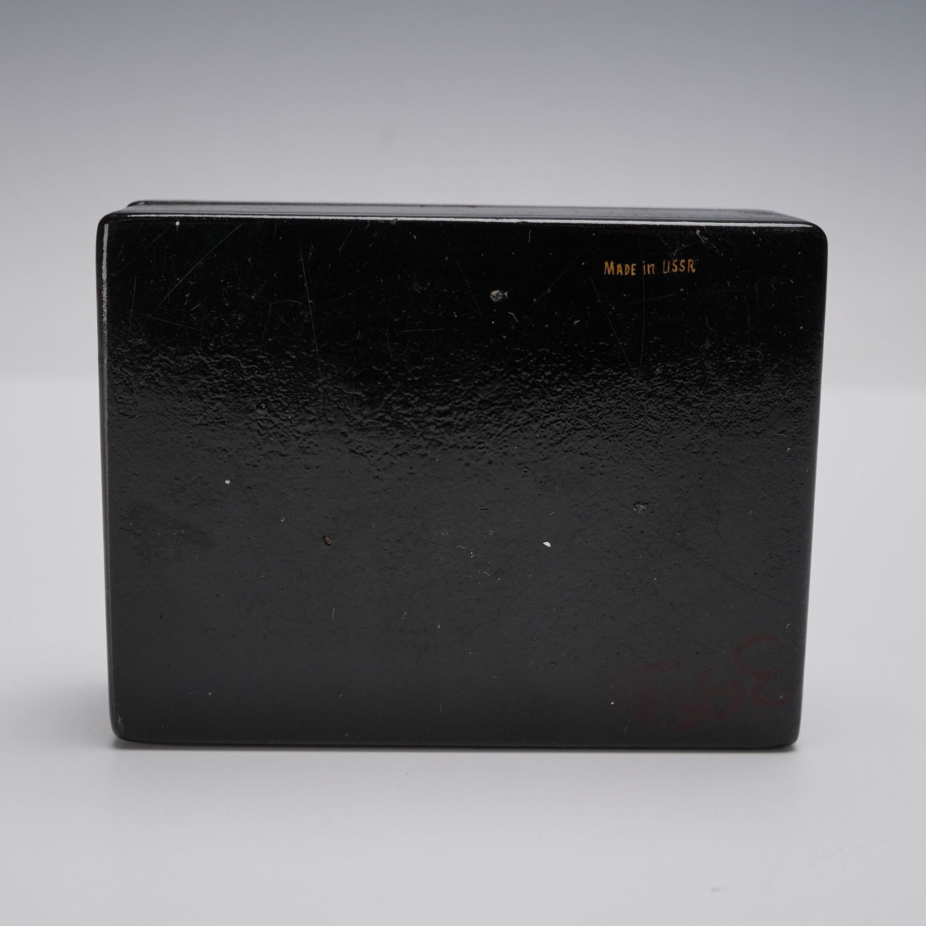 Finely hand-painted Russian black lacquer box depicting a dynamic battle scene with two mounted warriors in vivid hues of red, gold, and green against a dark background. The piece exhibits the signature style of the Palekh School, known for its miniature paintings on papier-mache boxes with exquisite detail and gold highlights. Signed and dated by the artist V. Karpukhin, 1975, in Cyrillic to the lower right. The underside bears the gold inscription "Made in USSR" and the interior retains its original red lacquer lining and certificate label. A remarkable example of Soviet-era Palekh artistry, capturing both folkloric and historical themes. N13623.