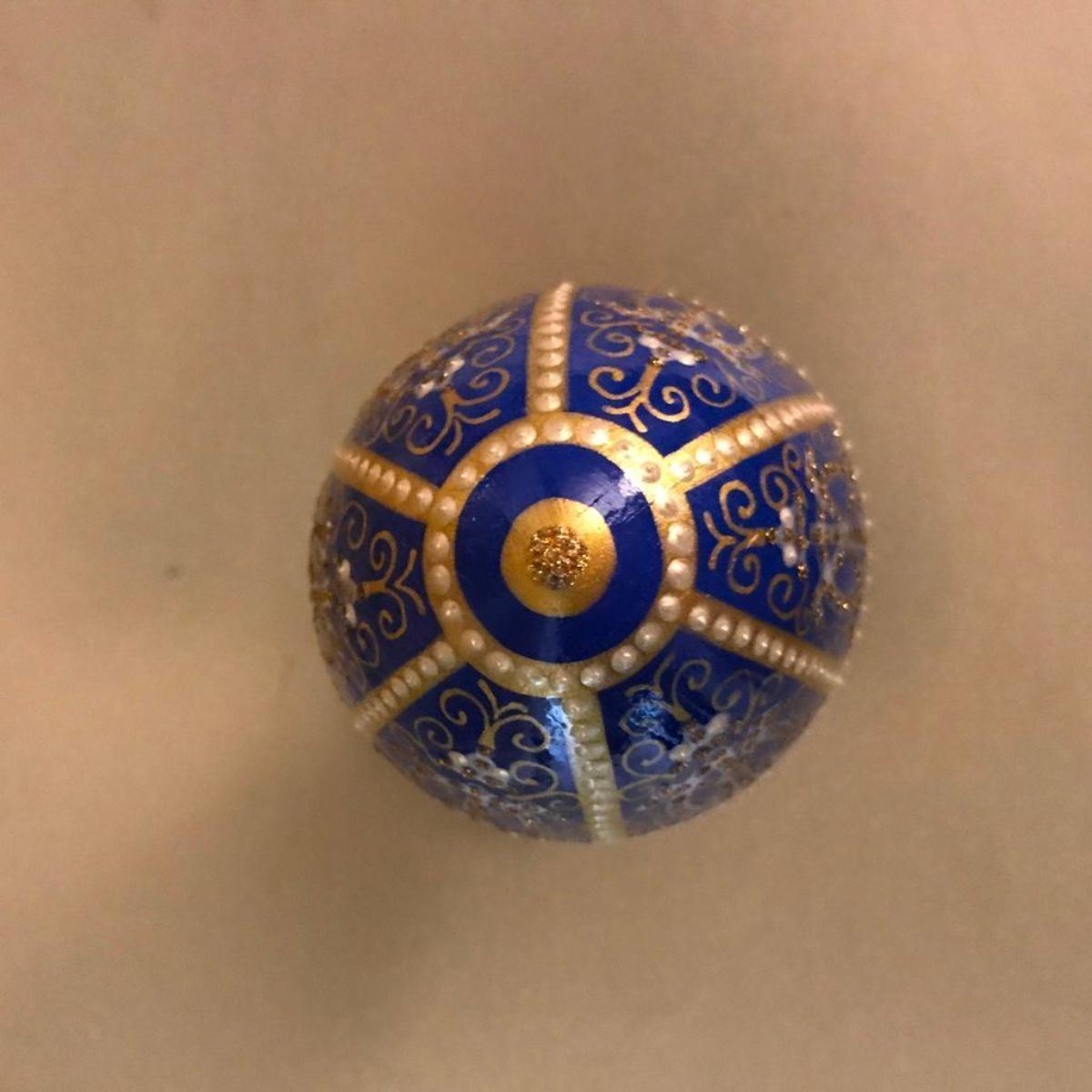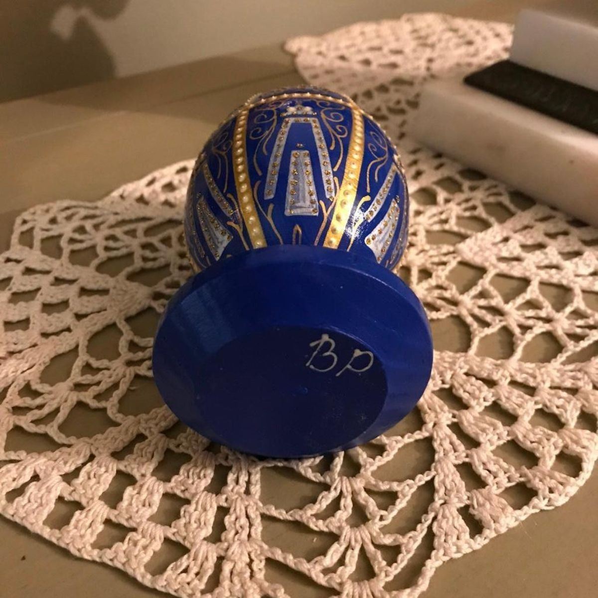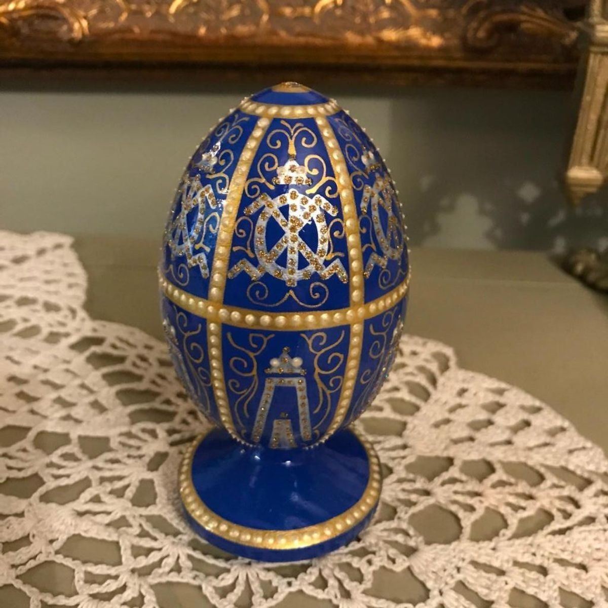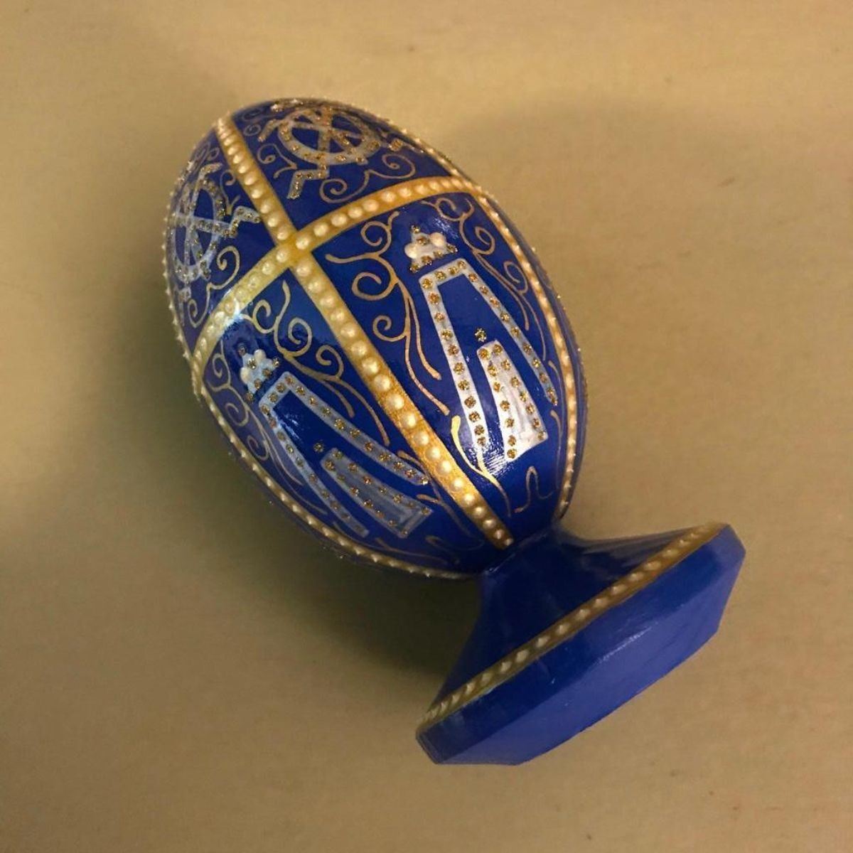 Russian wooden egg ornament, hand-painted with royal blue enamel & gold gilt stippling, after the original 1896 Twelve Monograms Royal Wooden Egg by Faberge. Signed on the bottom, initials of the artist. 4 3/4" H X 2 1/2" D.
