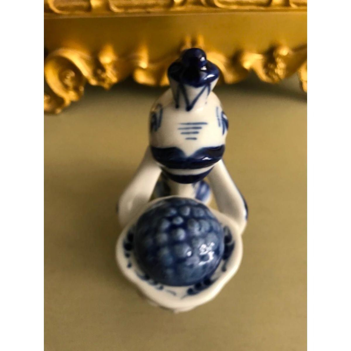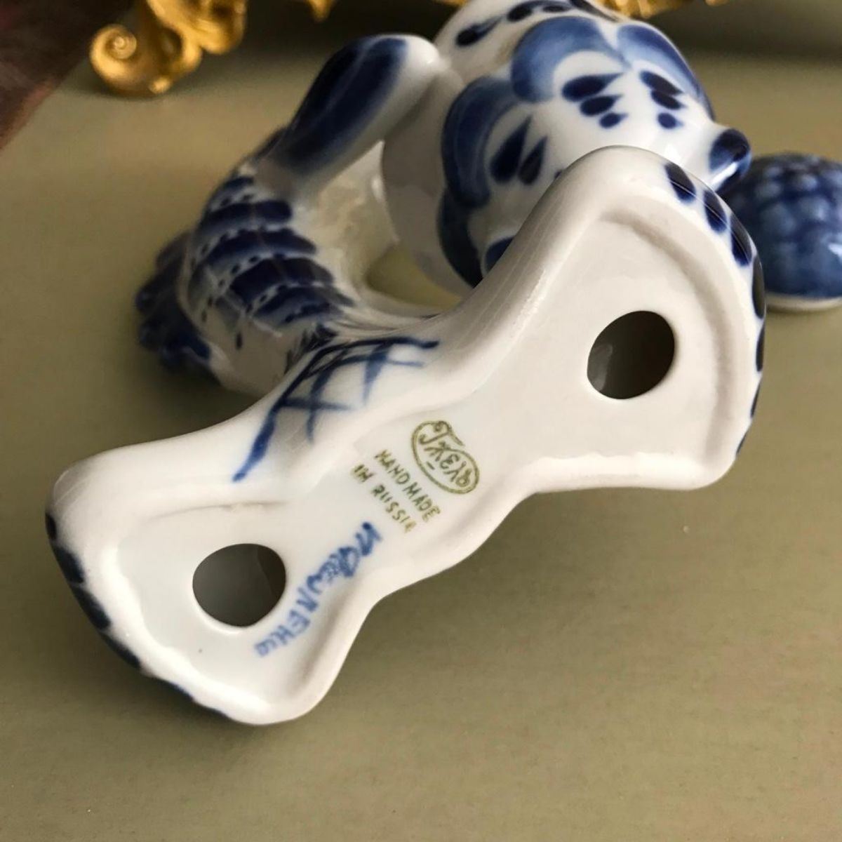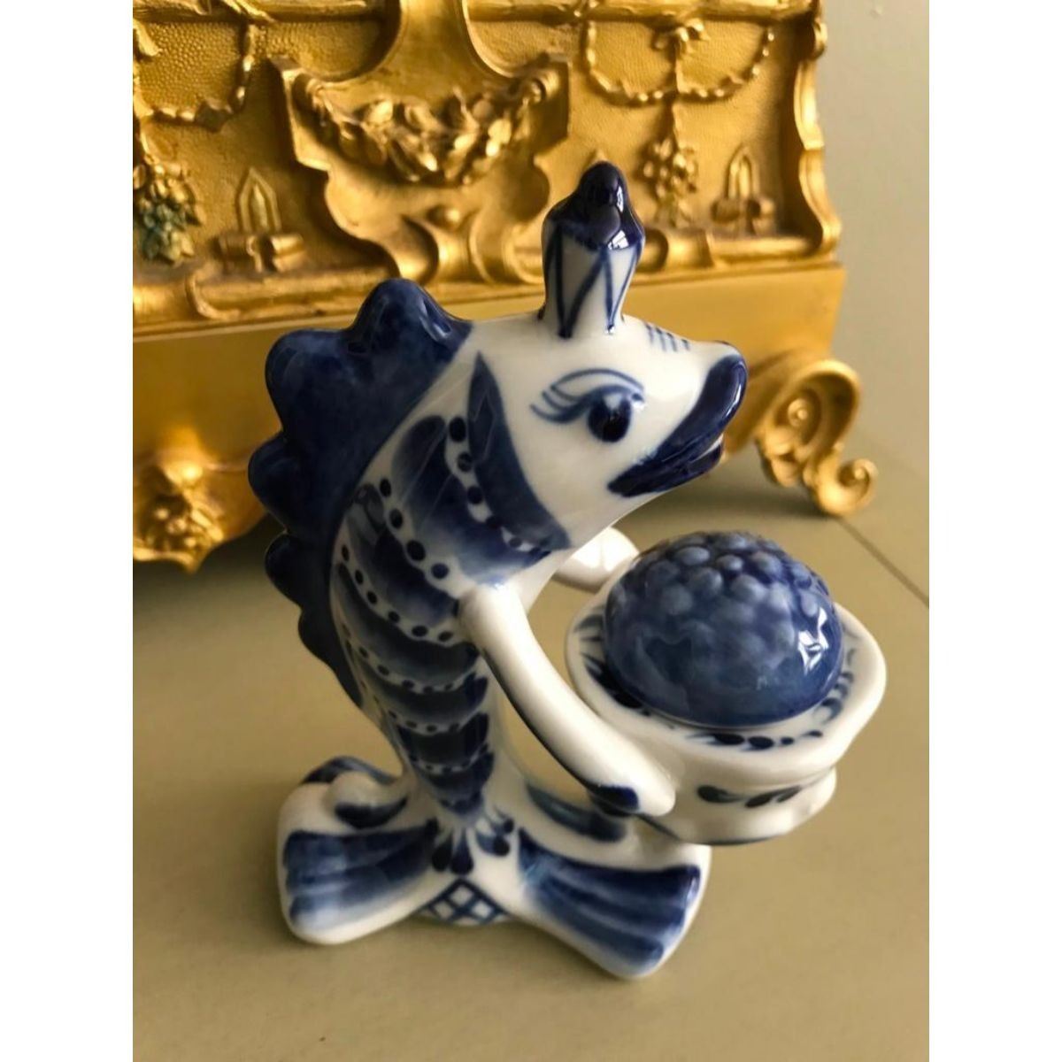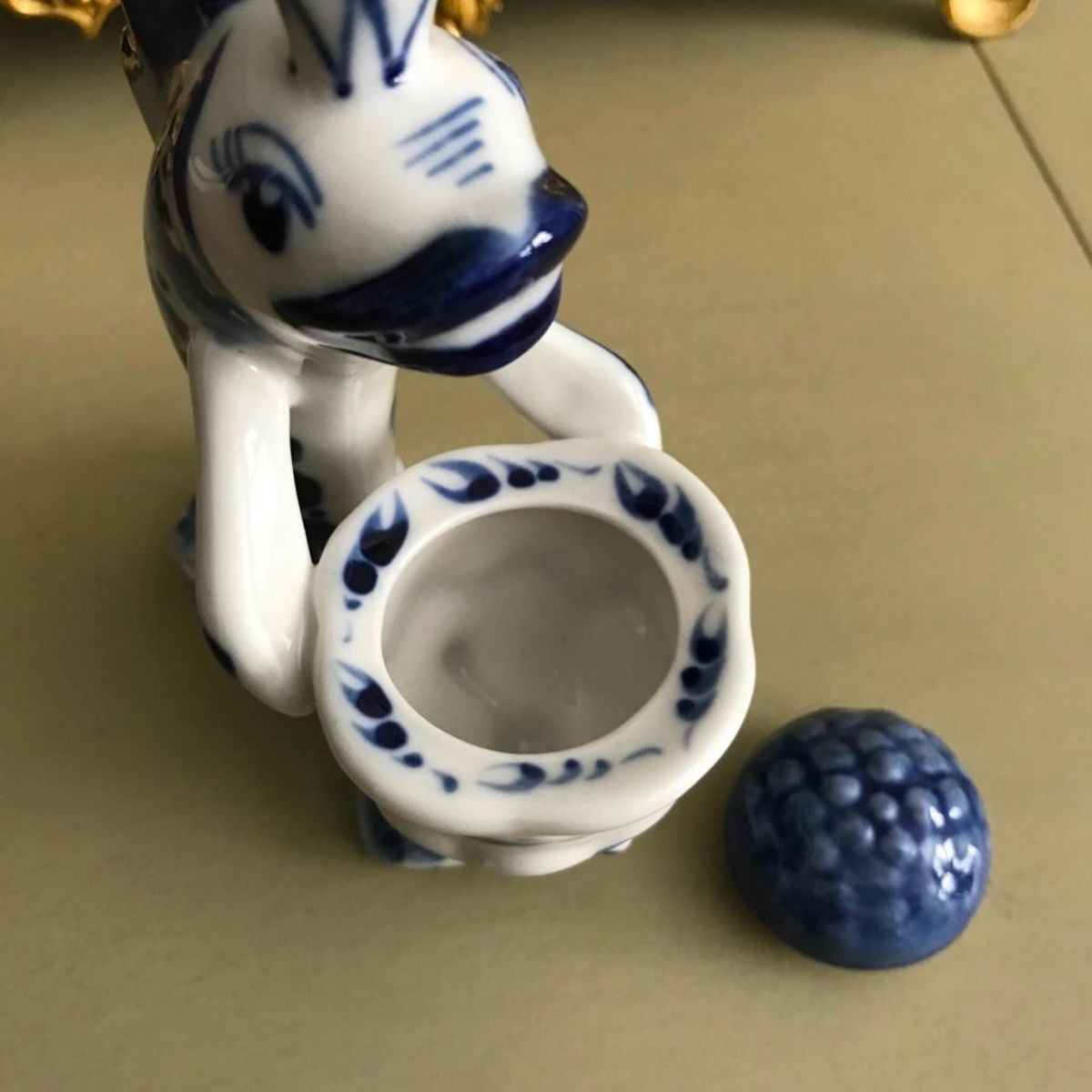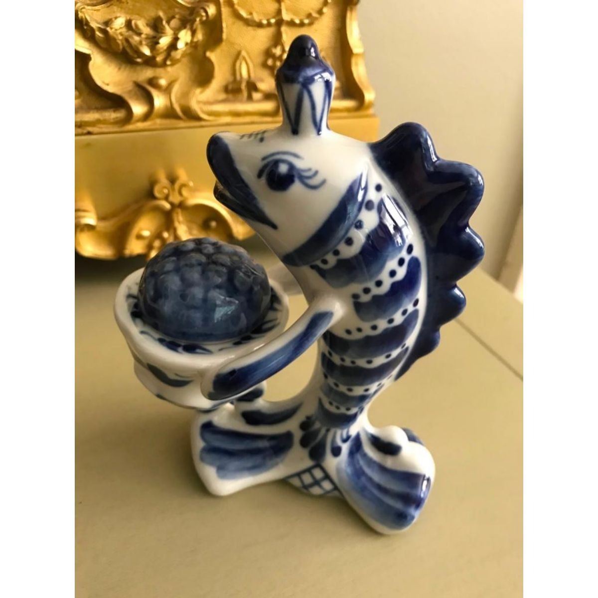 Russian Gzhel hand-painted porcelain standing fish form salt or black caviar server. To round lid lifts up to reveal small bowl. Beautiful & unique serving piece. 5 1/2" H X 2 1/2" W.Â