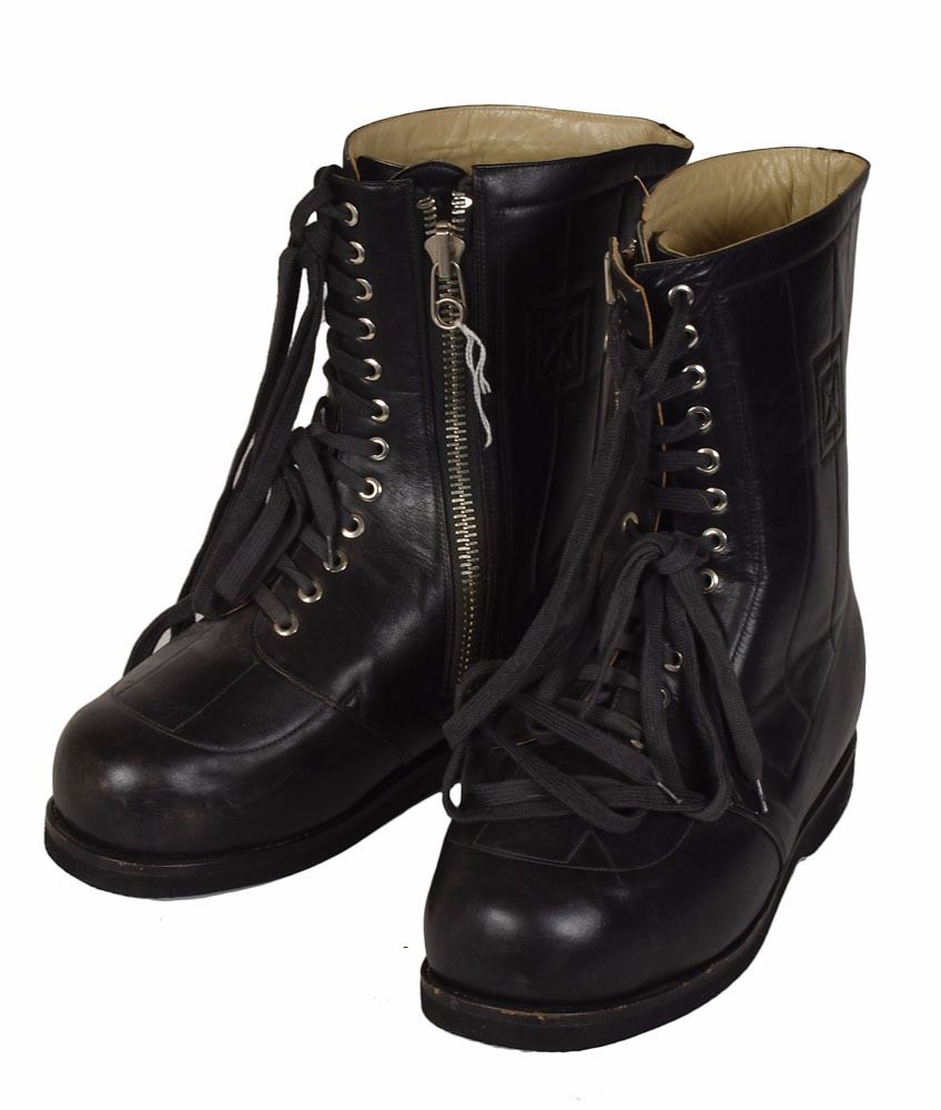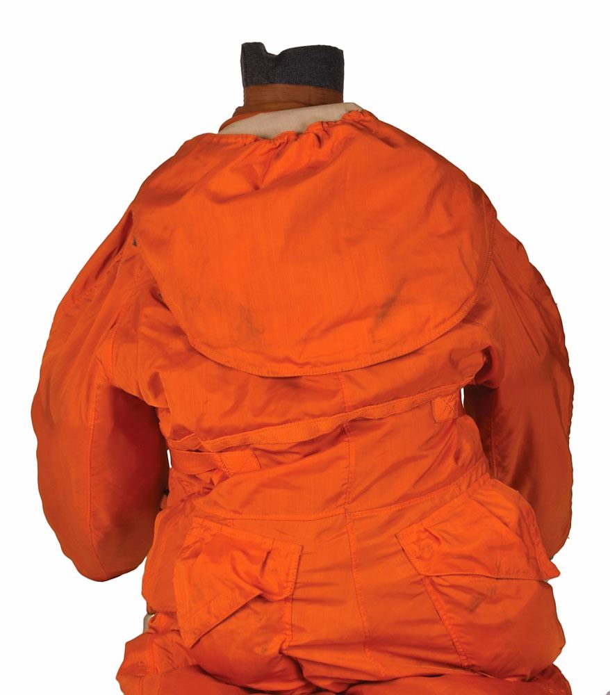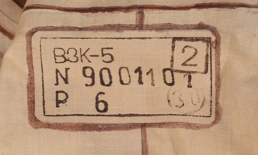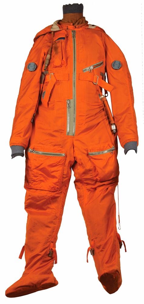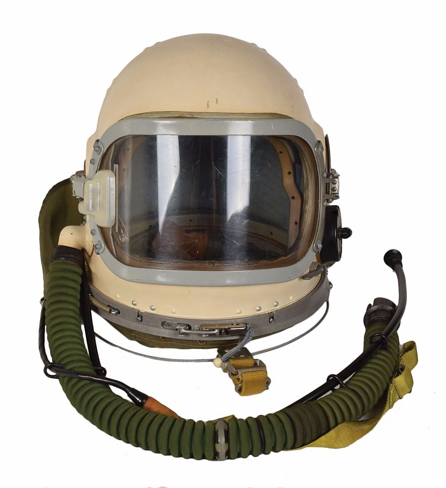 Outer shell of a Russian VMSK-4-15 sea survival high altitude flight suit. This suit is designed to provide individual life support to aircraft crews operating over ground and sea at high and low altitudes. Suit has its rubberized neck drape, numerous pockets on the front side and two pockets on the back with GP-2M-1 gloves inside, which are tethered to the suit. Back of hood stamped “MCK–5, N 9001101, P 6,” with inner collar similarly stamped “3K–5, N 9001101, P 6.” Also includes the Soviet flight helmet with connecting collar and breathing tube, with neck skirt bearing parts tag, “N0892491,” and a pair of black leather boots, with laced front, side zippers, and identification stamps. In overall fine condition, with the sole of right boot featuring a hole that extends to boot interior. An uncommon full suit relating to oceanic cosmonaut recovery.