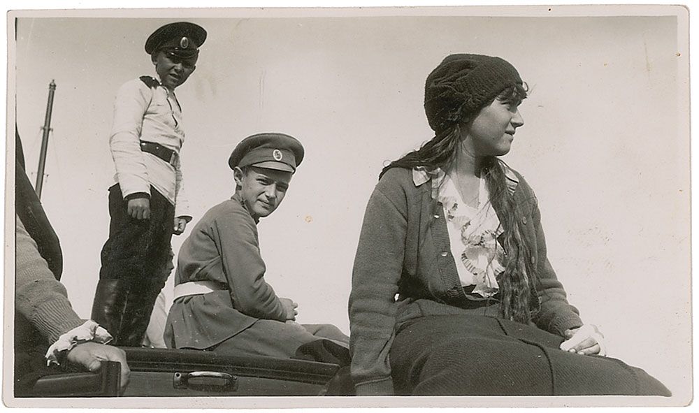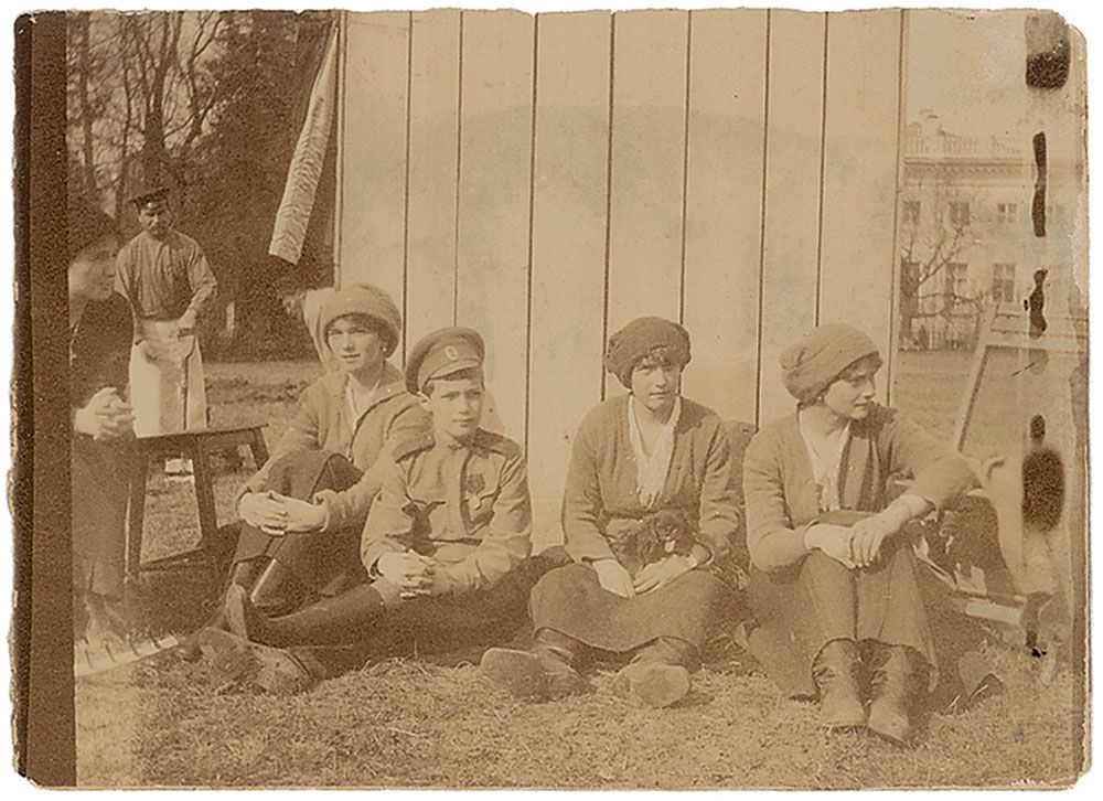 Rare original 3.5 x 2.5 photo of the members of the Russian Imperial Family seated outdoors, showing (left to right): Grand Duchess Olga Nikolaevna, Alexei Nikolaevich, Grand Duchess Anastasia Nikolaevna, and Tatiana, with Anastasia holding her dog, a King Charles Spaniel named Jimmy, in her lap. Reverse bears an ink notation in an unknown hand that reads, “1917 Tobolsk.” Also includes an original 4.25 x 2.5 photo of Anastasia seated outdoors alongside Alexei and another young boy. In overall fine condition. Both seem to date to 1917 while the family was in captivity, probably during August while being held at Tobolsk in Siberia; the building in the background of the first image appears to be the Governor's mansion in Tobolsk, where they were held in relative luxury before being moved to Yekaterinburg.