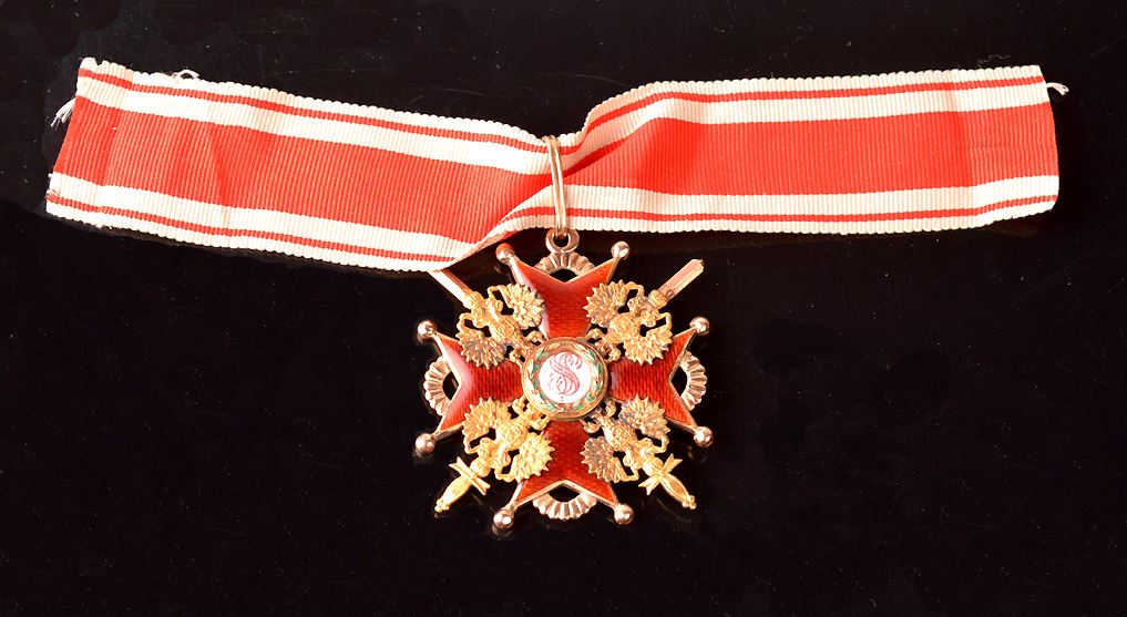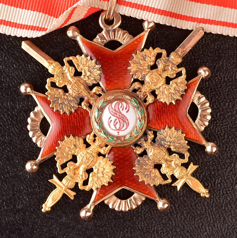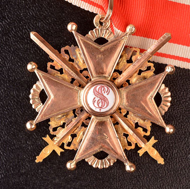 Imperial Russia, Order of Saint Stanislas, Military Issue, 2nd Class, Gold, with enamel. Hallmarked on back, "56" on ring. 53mm, 14K, by Edouard. VF, with ribbon. Very scarce.