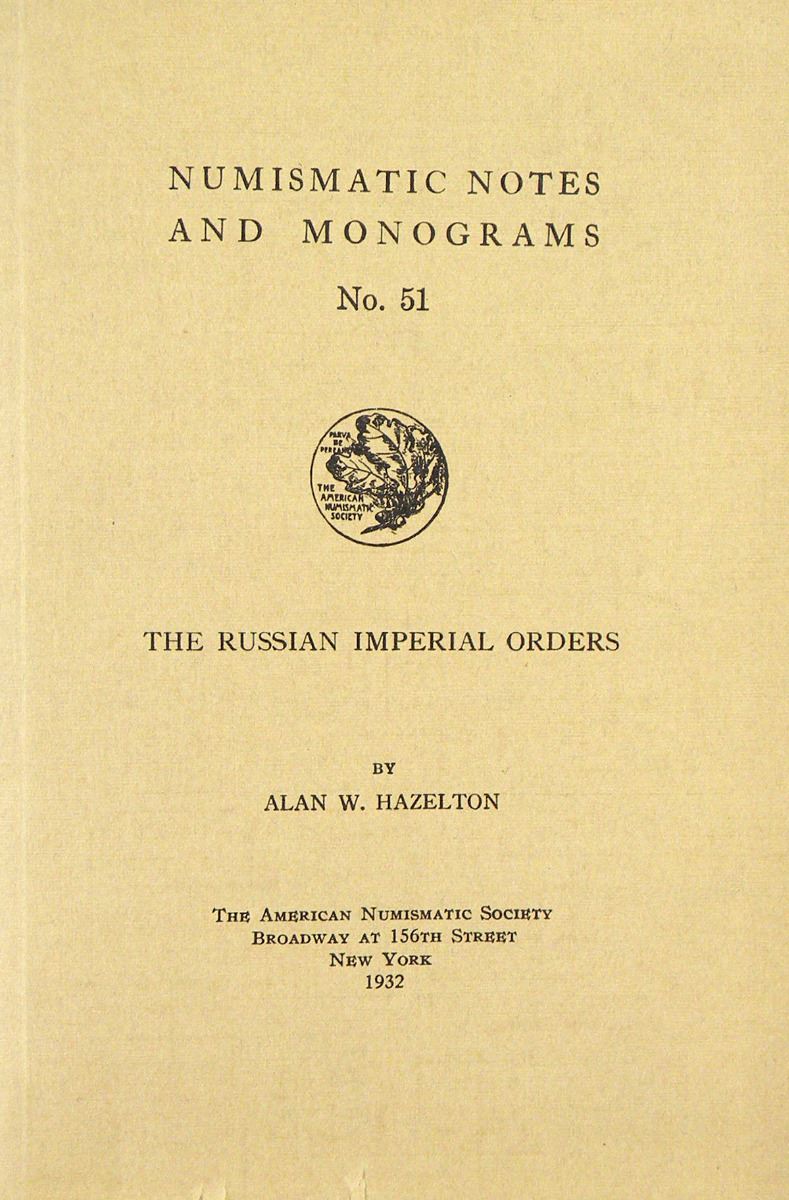 Hazelton, Alan W. THE RUSSIAN IMPERIAL ORDERS. New York: ANS, 1932. 16mo, original printed card covers. Color frontispiece depicting Imperial Order of St. Andrew; (4), 101, (3) pages including 20 plates, 3 of them also in color. Slight front cover scrape, else fine. Numismatic Notes and Monographs, No. 51. An unusually lavishly printed installment in the NNM series. A scarcer publication. Clain-Stefanelli 15637. Mulder and Purves 2032-1.