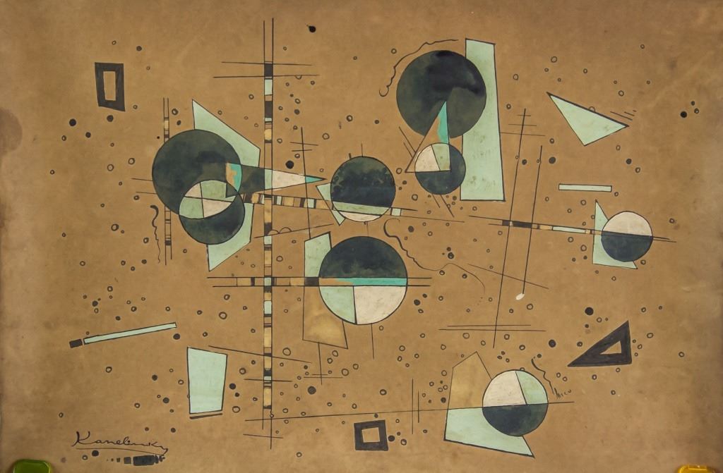 Ink and acrylic on paper. Featuring geometric abstract composition. Signed "Kandinsky" to the bottom left corner. Label on verso reads "TO Louis Berger PARIS". 35 x 49 cm (13.75 x 19.5 inches).