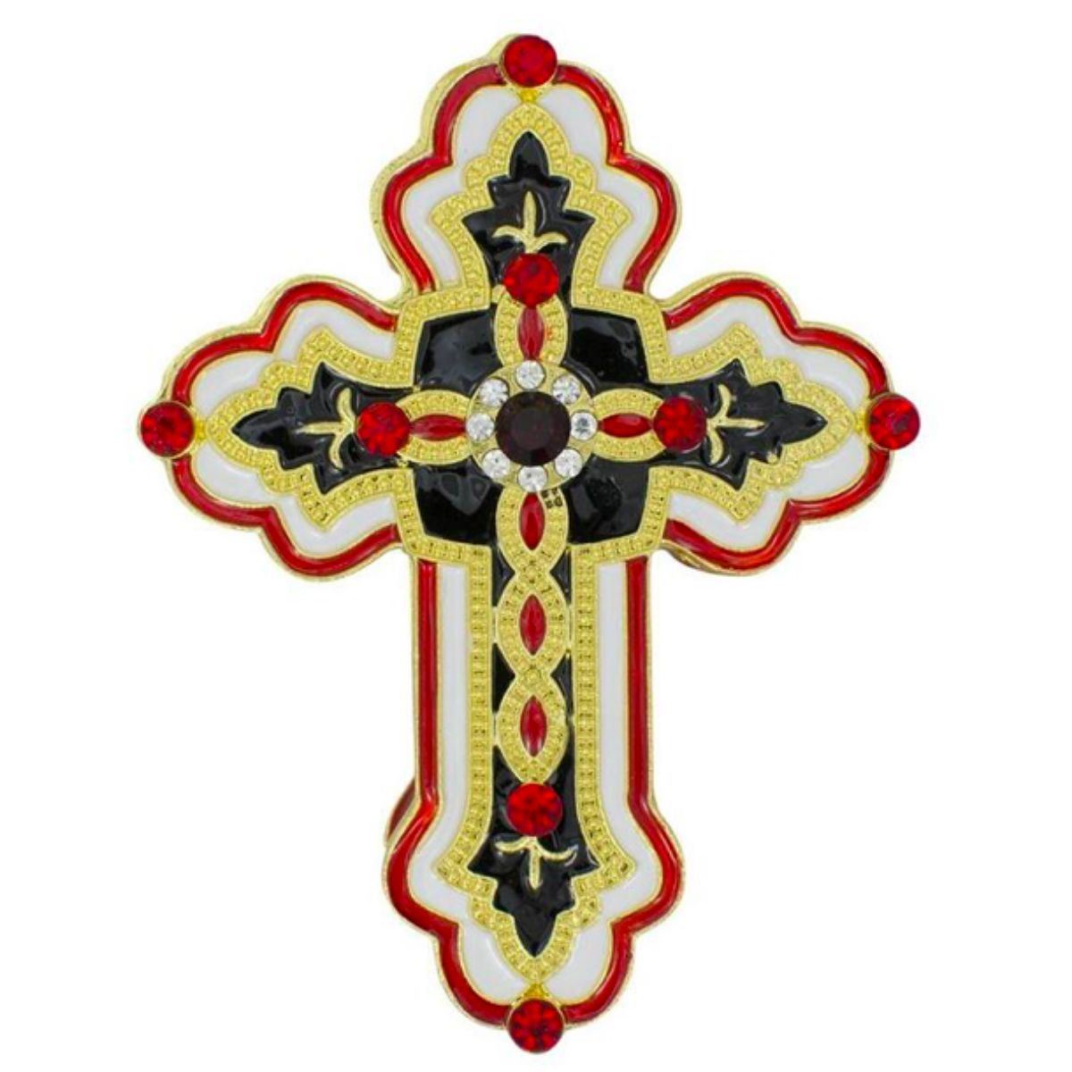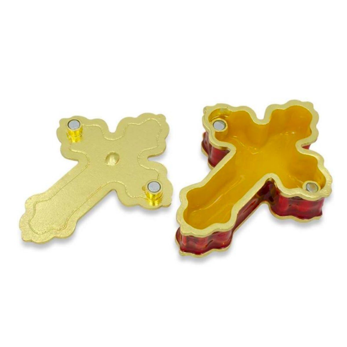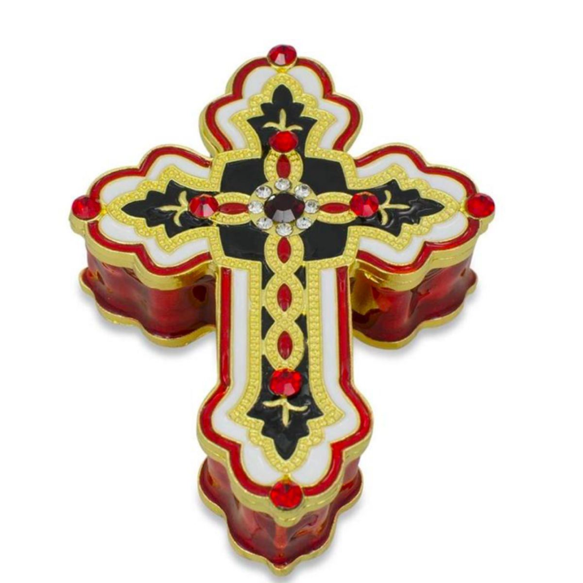 Russian Jeweled Cross-shaped rosary, trinket, jewel box. Enamel & gilt over pewter with embedded Austrian crystals. The lid of the cross box lifts up, with magnetic closure to reveal an enameled interior for storing a rosary, trinkets of jewels. 3 1/4" L X 2 1/2" W X 3/4" D. Â