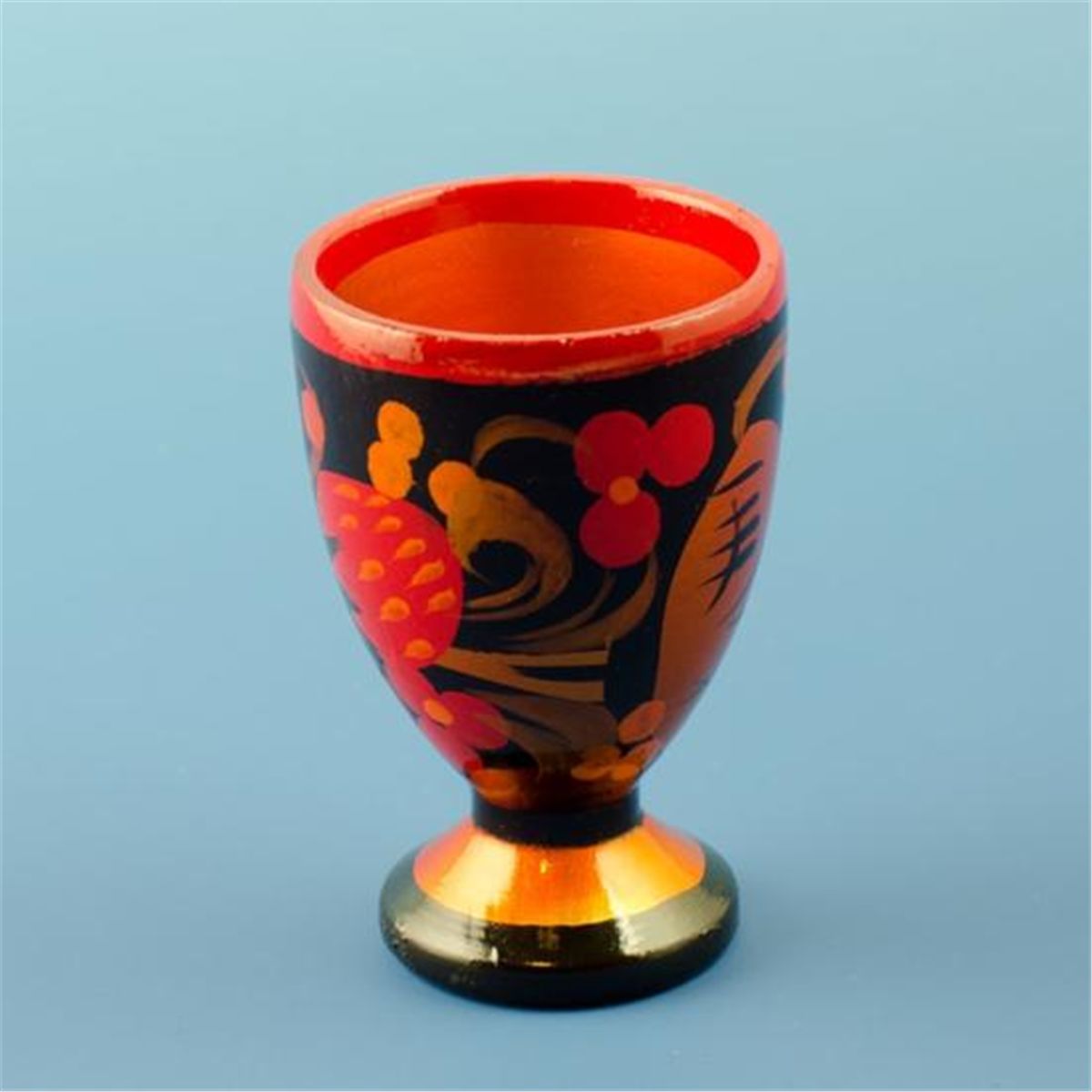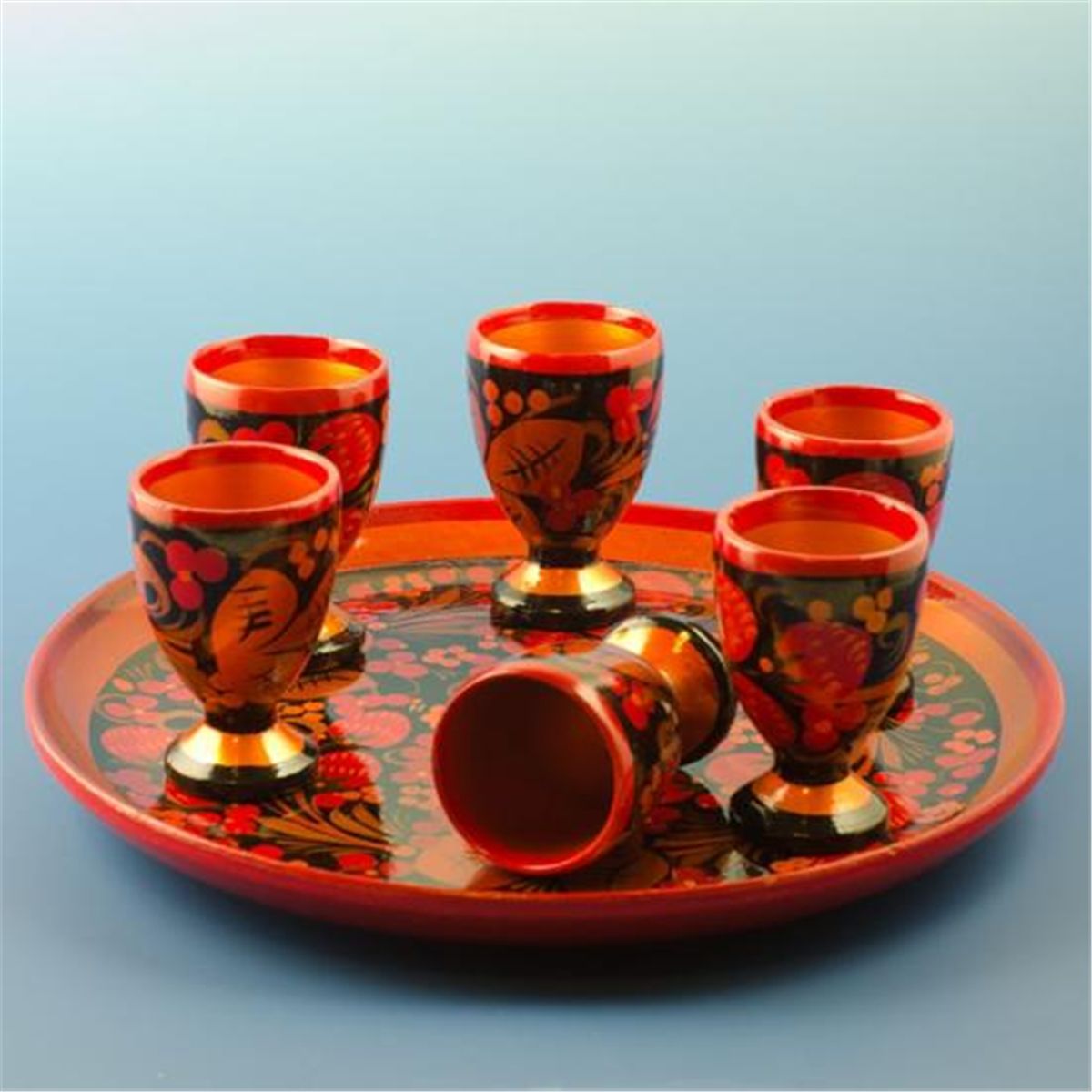Russian Khohloma Shots with Tray, Tray Dimensions: 7in (D), Set of 6 Hand Painted Wooden shots: 2.5 (H) x 1.5in (H). Khokhloma or Khokhloma painting is the name of a Russian wood painting handicraft style, known for its vivid flower patterns, red and gold colors over a black background, and the distinctive effect it has when applied wooden tableware or furniture, making it look heavier, metal-like, and glamorous.
