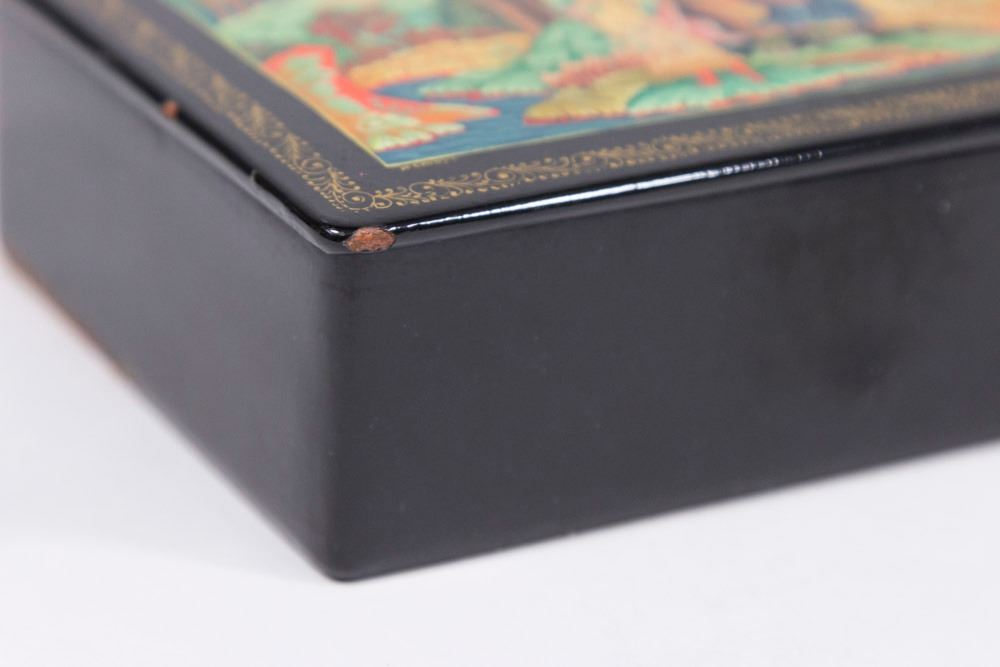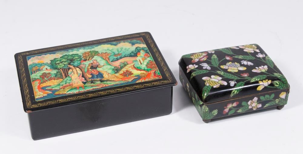 Russian box approx. 1 3/4" H x 6" W x 4 1/8" D. Chinese box floral design approx. 1 1/2" H x 3 7/8" W x 3 1/4" D. Property from a Manhattan townhouse.