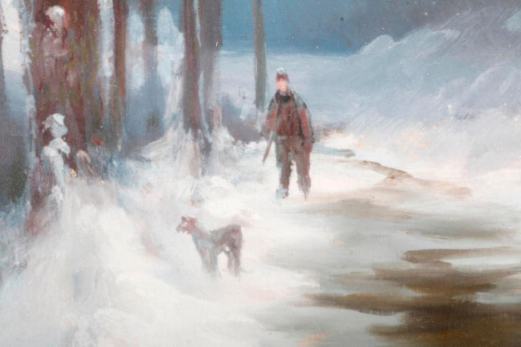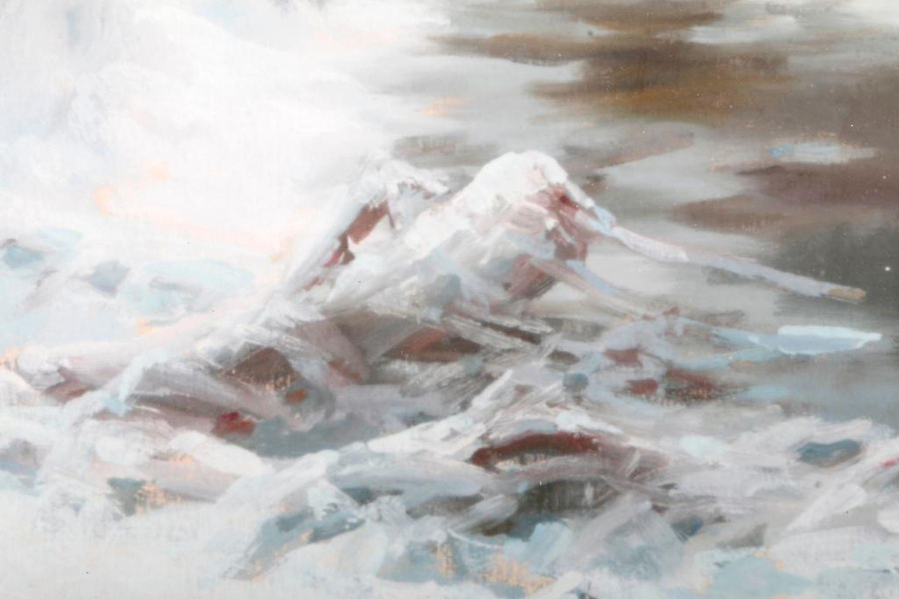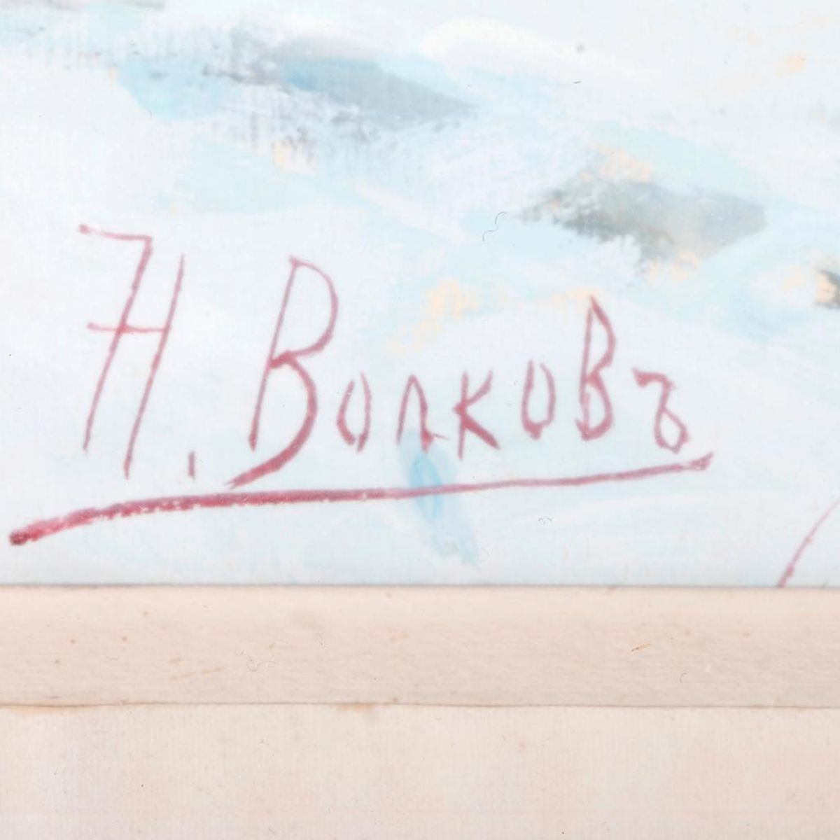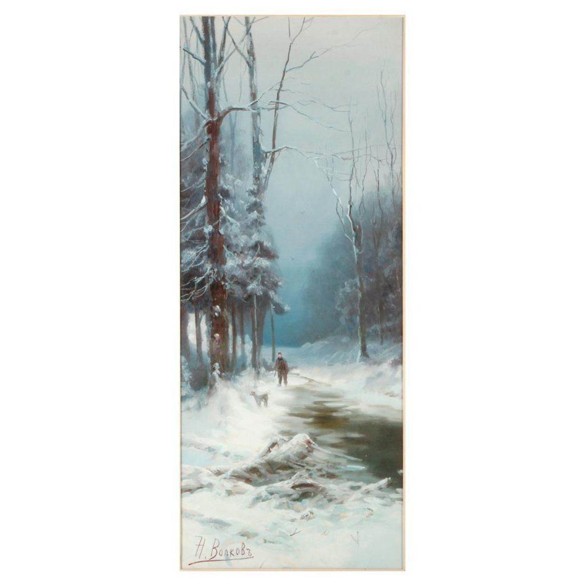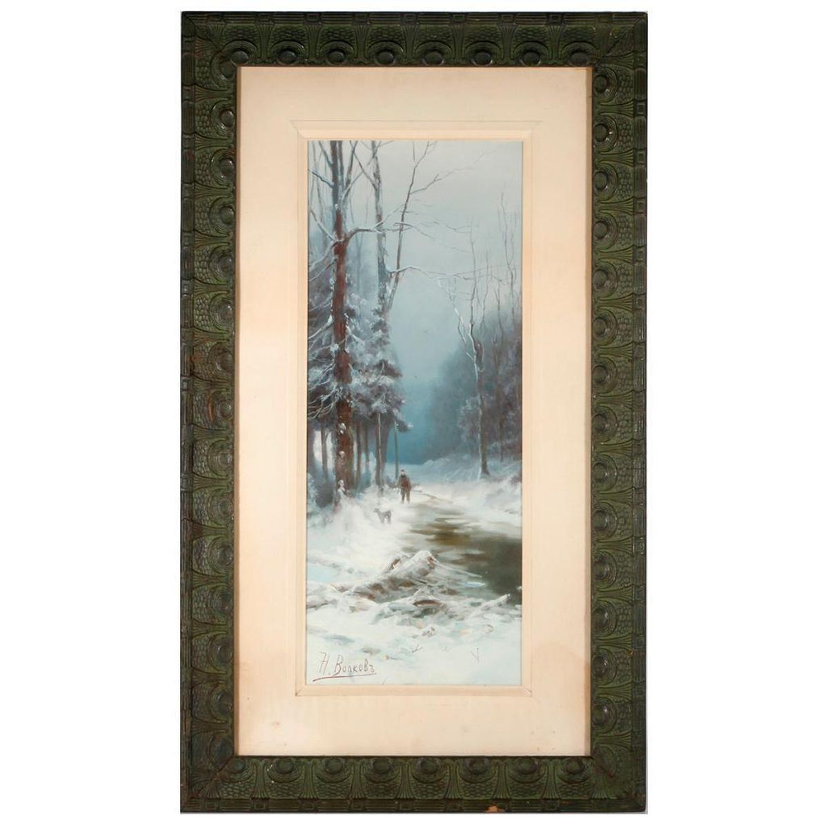 Artist: Signed in Cyrillic. Subject/Title: A Russian winter landscape. Date Created: Early 20th century. Medium: Watercolor and pastel on paper. Size Image: 22 inches high x 9. Size Frame: 32 inches high x 19. Condition: Good, slight loss to frame.