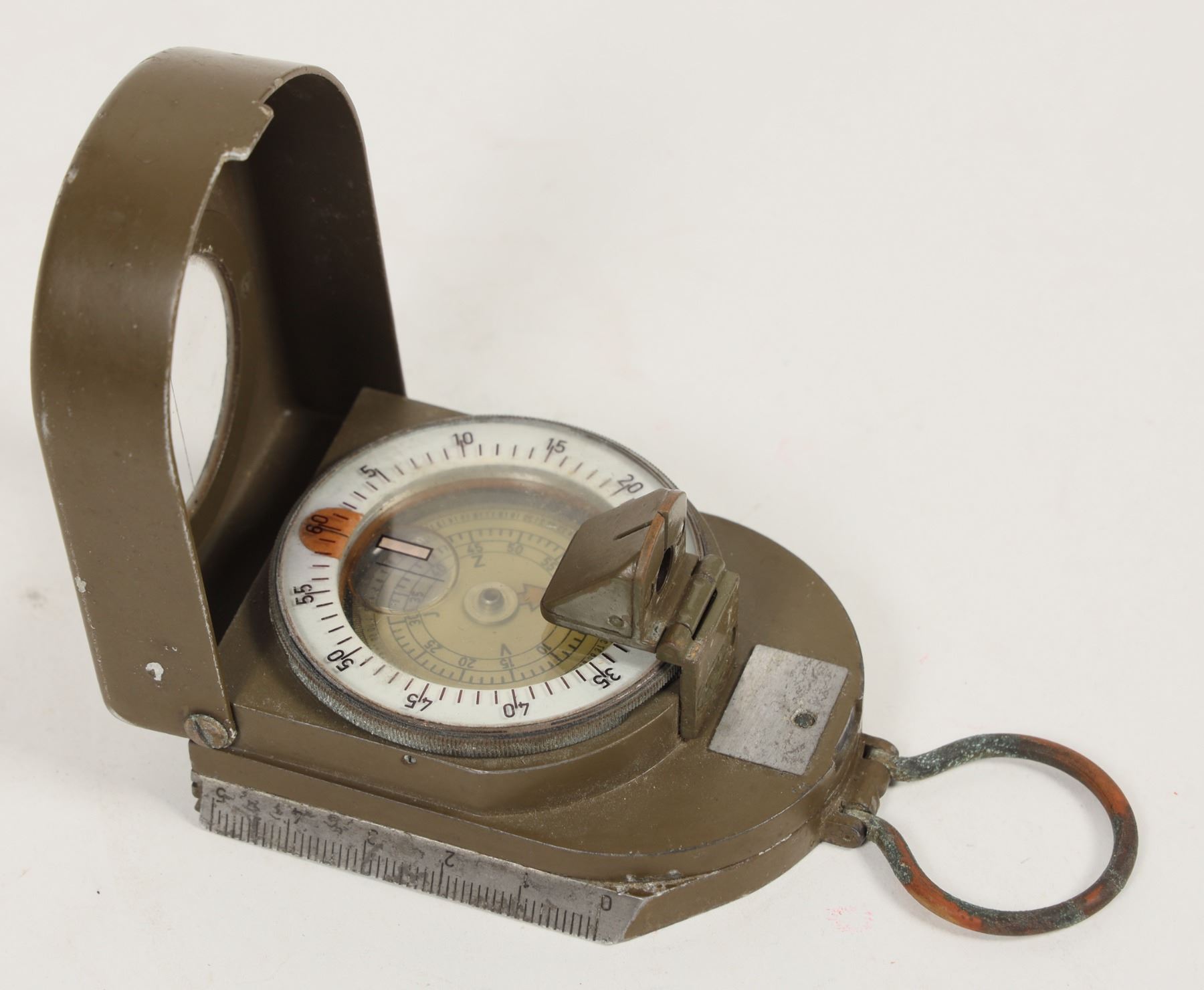This compass is a Russian marching compass marked in cyrillic points S, V, J, Z for north, east south and west. 3 in. X 2.25 in. with inclination side window. Star A manufacture with leather case. From the Popovich collection. In good condition. Please see photo for details.