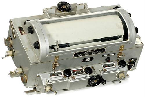 Russischer militärischer Datenschreiber, um 1960 Bezeichnet 1W44, Hersteller nicht bekannt, mit großer Walze zur Papieraufnahme, diverse Skalen, Zahlenreihen und Einstellmöglichkeiten. Ungetestet. Maße: 65 x 35 x 35 cm.