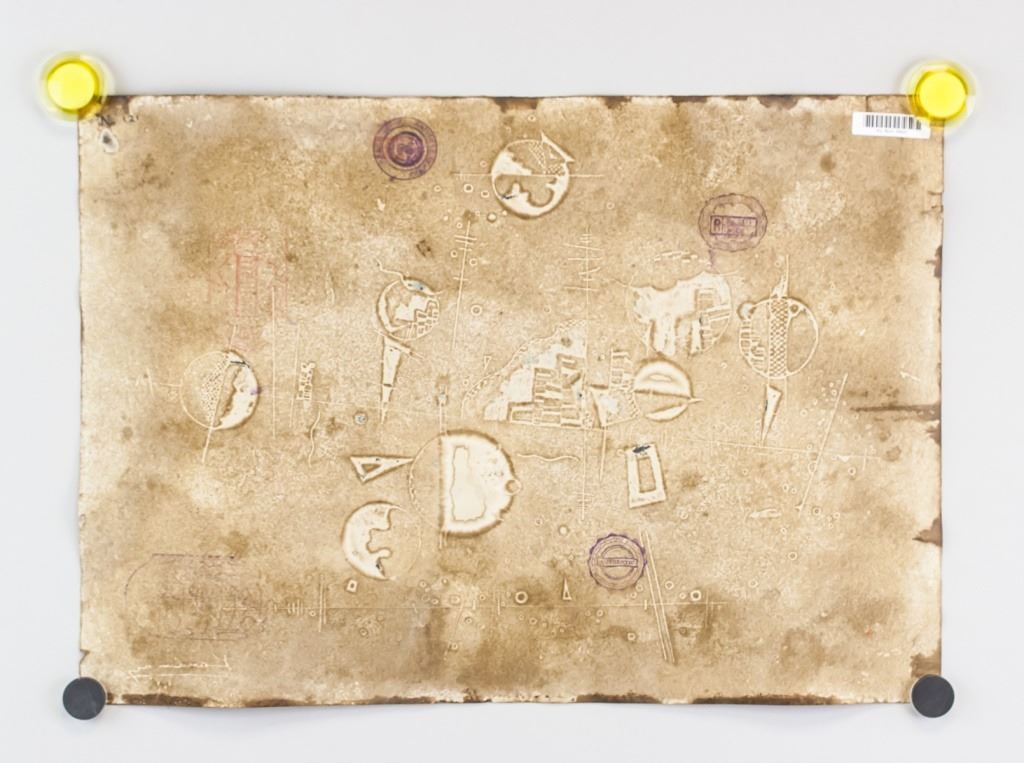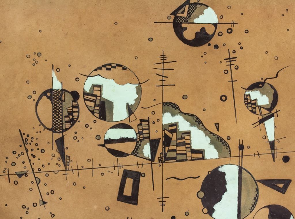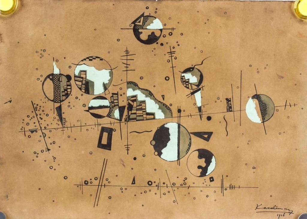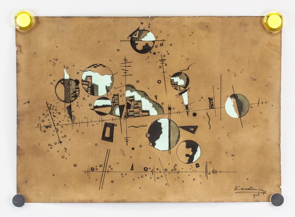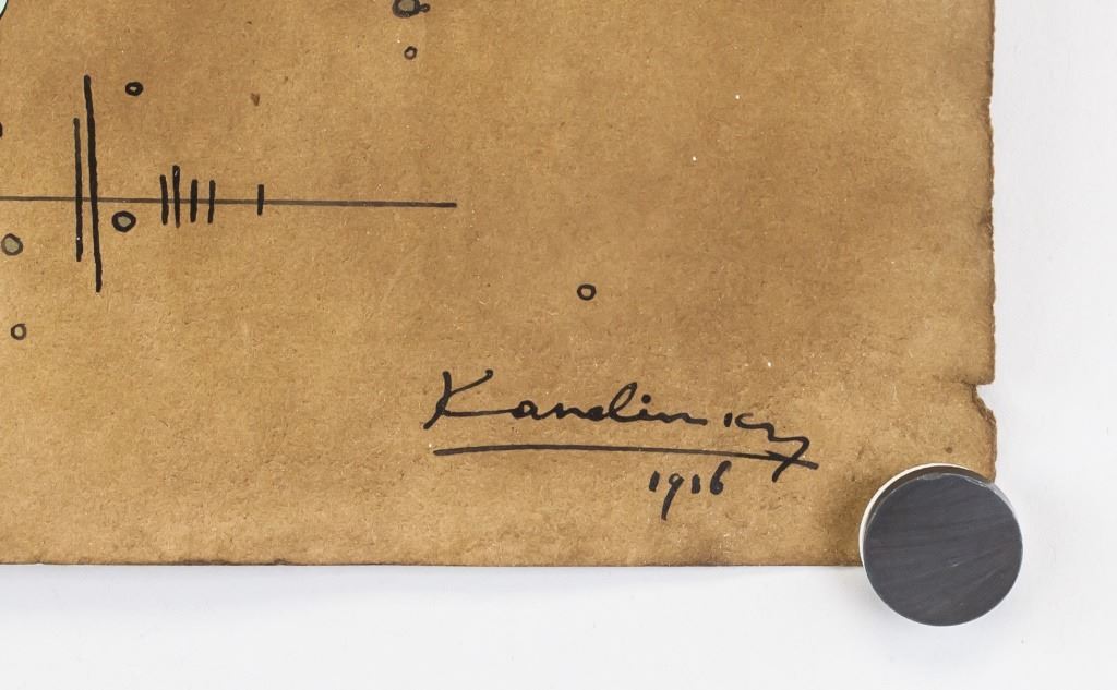 Mixed media on paper. Featuring geometric abstract composition. Signed "Kandinsky" to the bottom right corner. 1916 inscribed beneath the signature. Three stamps on verso. 35 x 50 cm (13.5 x 19.5 inches).