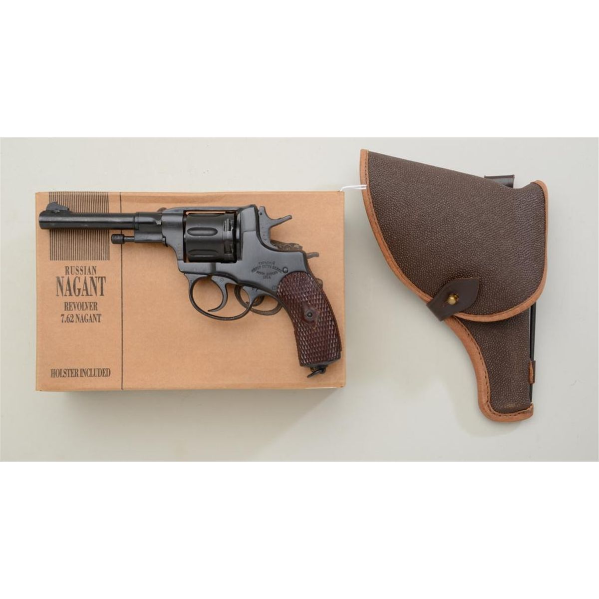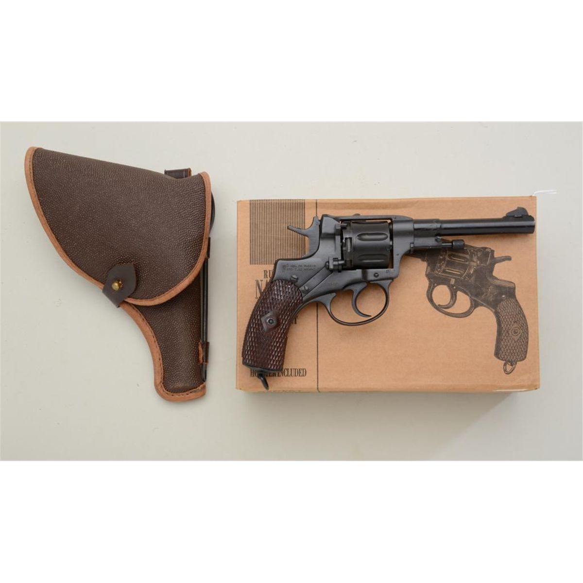 Russian Model 1895 Nagant DA revolver, import-marked, 7.62mm cal., black finish, checkered brown plastic grips, #53707 with modern flap holster, cleaning rod, screwdriver, leather lanyard and in importcardboard shipping box. This gun is in overall very good condition as restored and refurbished showing the majority of its military black finish, good bore, action and early markings in Cyrillic and dated 1914 onleft side of the frame; holster is overall very good. Est.: $100-$200.