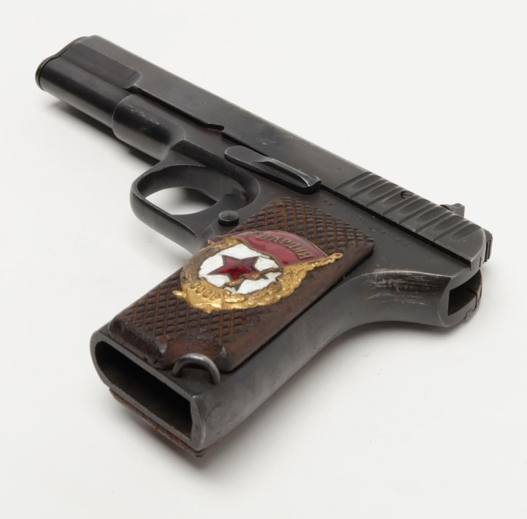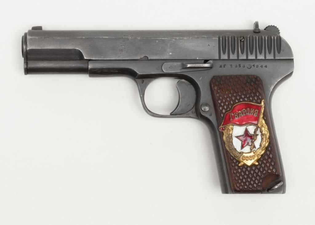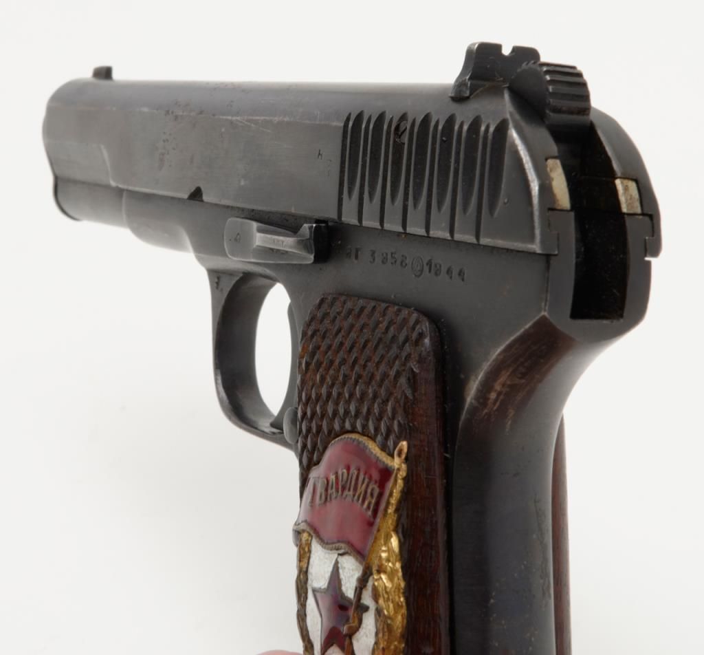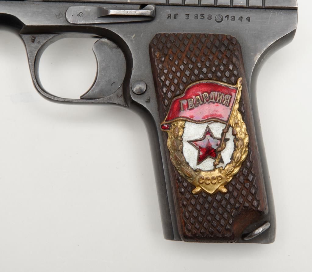 Russian Model T T–33 Tokarev semi-automatic pistol in .30 caliber showing enamel emblem inlaid into the left grip from 46th Russian Taman Guards Division known as “The Night Witches”. The Night Witches were female aviators and this unit was the most decorated female unit in the Soviet service during World War II. The Night Witches flew canvas and wood biplanes armed with six bombs and could only reach speeds of under 100 miles an hour. These brave and ingenious women devised tactics to evade German night fighters and anti-aircraft. This unit was extremely successful and each pilot who survived at the end of the war had flown over 800 missions and 23 were awarded the title of “Hero of the Soviet Union” with 30 of its membersdying in combat. This pistol is accompanied by a letter on headquarters stationary 102 D infantry division, Office of the Commanding General, Addressed to Mr. Bob Hope at USO camp shows where the Commander states, “Dear Bob : I am sendingunder separate cover a pistol presented to me by the Commander of the 46th Russian Guards Division in appreciation of the superb entertainment you and your troupe gave the Ozarks yesterday in Passau, Germany. Thanks from all of us.