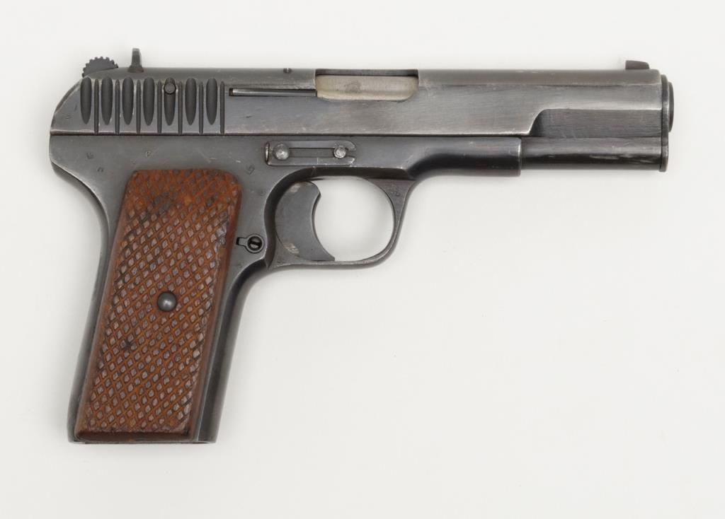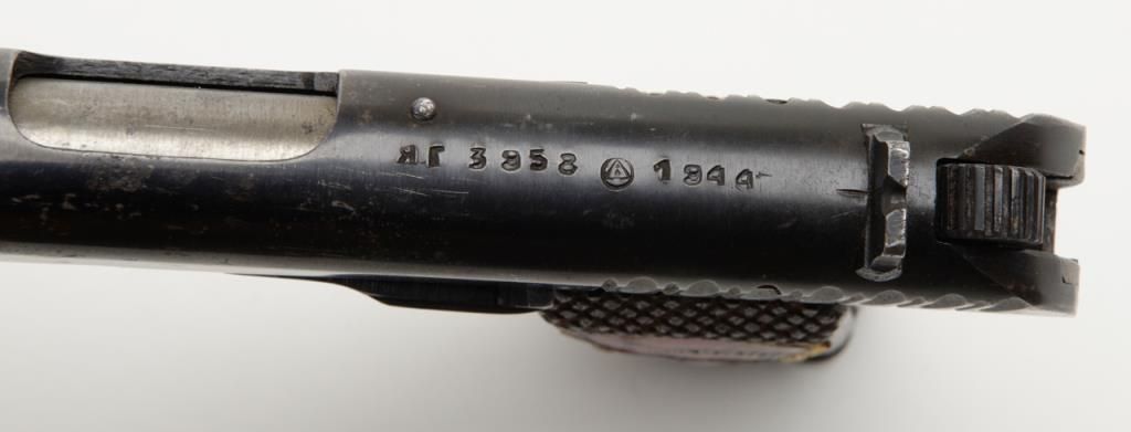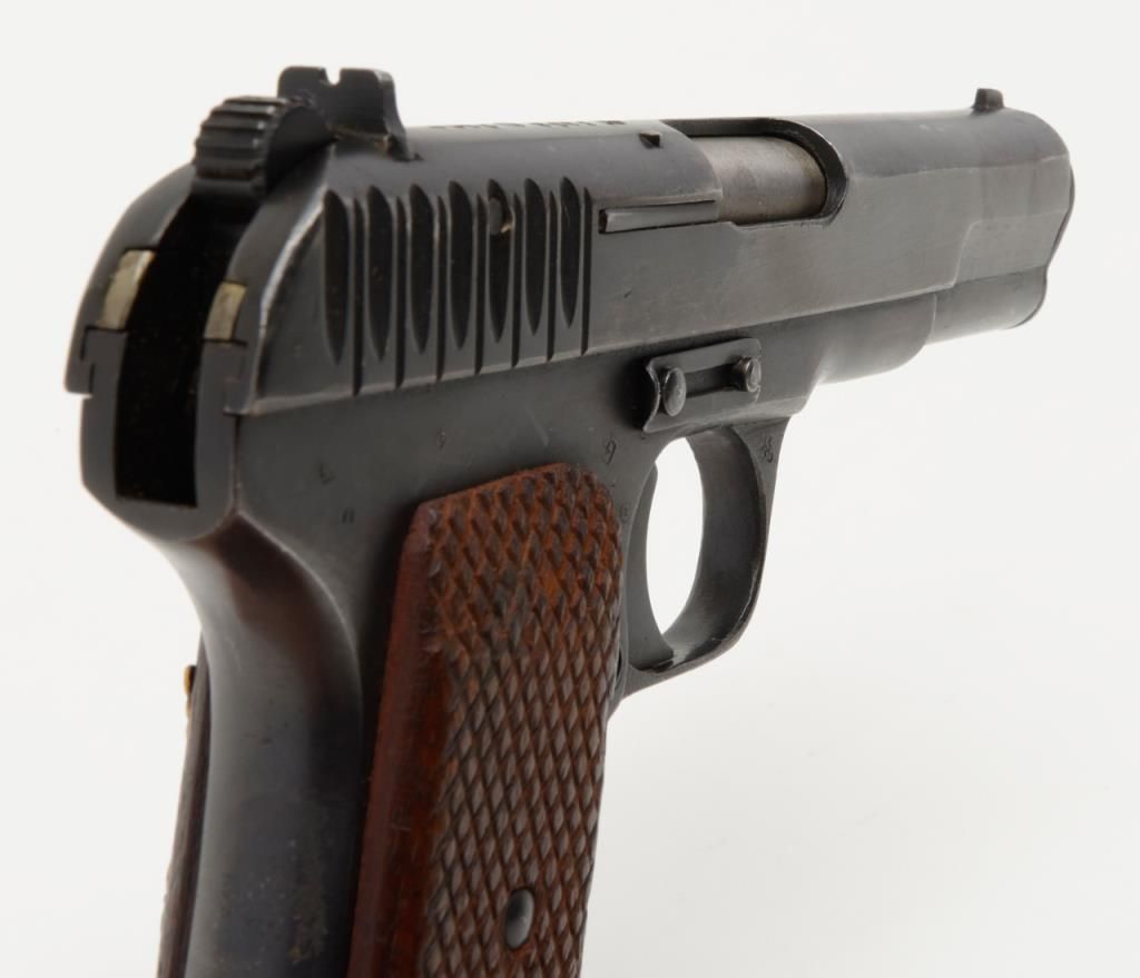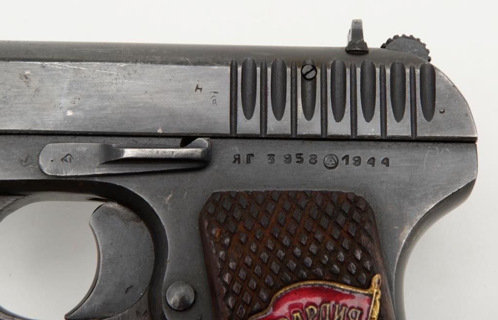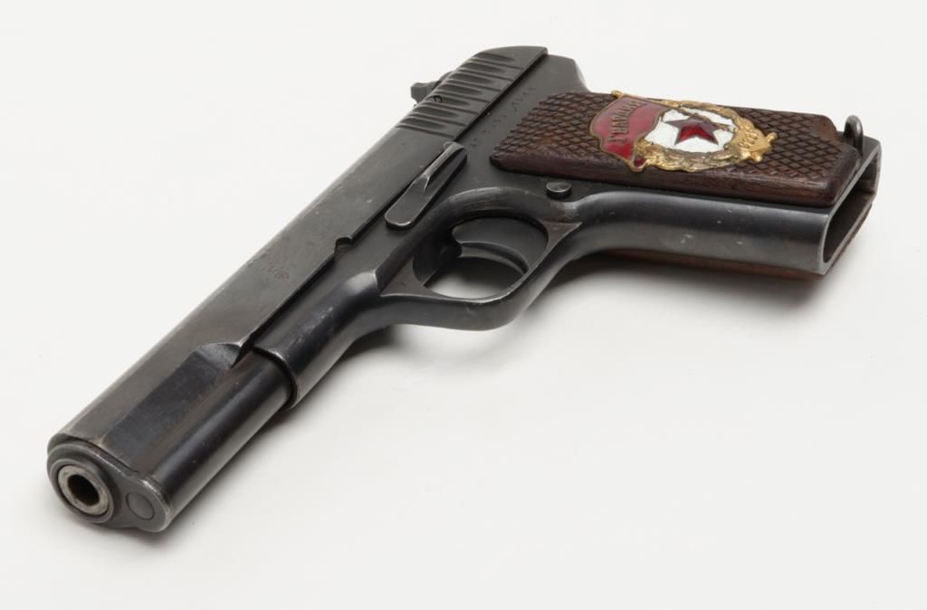 Russian Model T T–33 Tokarev semi-automatic pistol in .30 caliber showing enamel emblem inlaid into the left grip from 46th Russian Taman Guards Division known as “The Night Witches”. The Night Witches were female aviators and this unit was the most decorated female unit in the Soviet service during World War II. The Night Witches flew canvas and wood biplanes armed with six bombs and could only reach speeds of under 100 miles an hour. These brave and ingenious women devised tactics to evade German night fighters and anti-aircraft. This unit was extremely successful and each pilot who survived at the end of the war had flown over 800 missions and 23 were awarded the title of “Hero of the Soviet Union” with 30 of its membersdying in combat. This pistol is accompanied by a letter on headquarters stationary 102 D infantry division, Office of the Commanding General, Addressed to Mr. Bob Hope at USO camp shows where the Commander states, “Dear Bob : I am sendingunder separate cover a pistol presented to me by the Commander of the 46th Russian Guards Division in appreciation of the superb entertainment you and your troupe gave the Ozarks yesterday in Passau, Germany. Thanks from all of us.