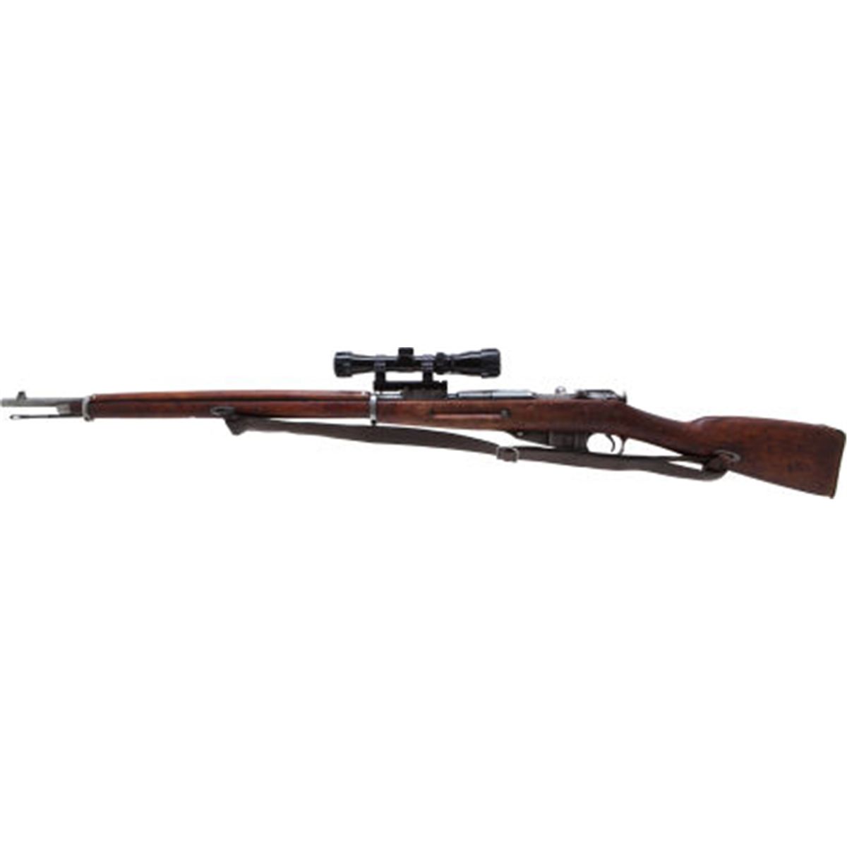 Russian Mosin-Nagant Bolt Action Rifle Mounted with Telescopic Sight. Serial no. N49673, 8mm, 31 1/2-inch barrel with standard sights. Mounted with a Tasco telescopic sight. Blued finish. Import stamps. Walnut stock and armguard. Sling mounts. Leather sling. Condition: Good as configured. Retaining approximately 30-40% finish with scattered wear and patina. Wood with dents and bruises. Action good. NRA FIREARMS FOR FREEDOM PROGRAM