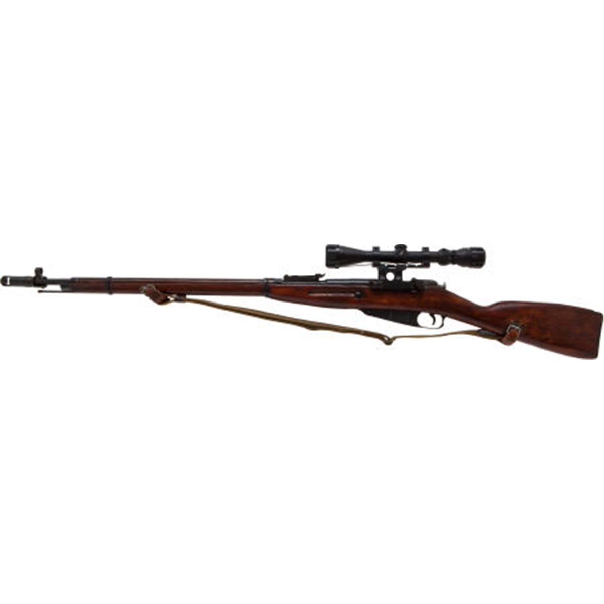 Russian Mosin-Nagant Bolt Action Rifle with Telescopic Sight. Serial no. 9130-3795, 8mm, 31-inch barrel with aftermarket muzzle break and standard military sights. Import stamps. Blued finish. Mounted with aftermarket Tasco 39 X 40 telescopic sight. Varnished walnut stock and armguard. Sling mounts and green web sling. Condition: Very good as redone. Retaining approximately 85-90% of a reblued finish with light wear. Wood with wear and bruises. Action crisp.NRA FIREARMS FOR FREEDOM PROGRAM