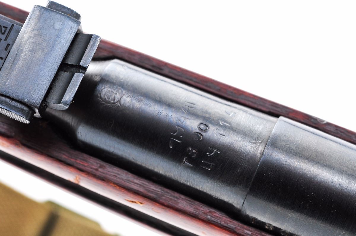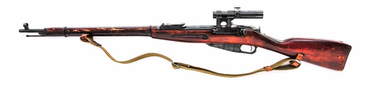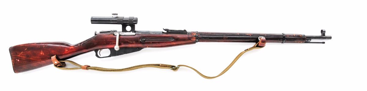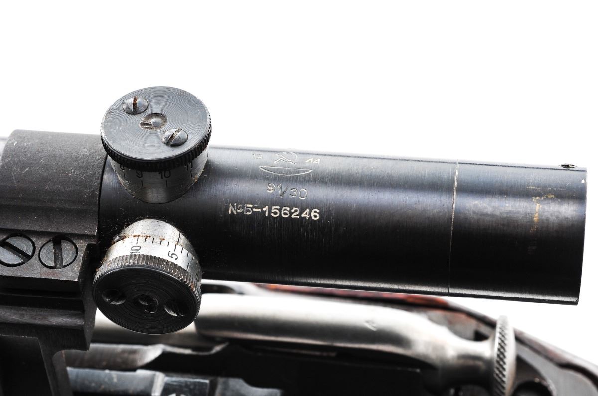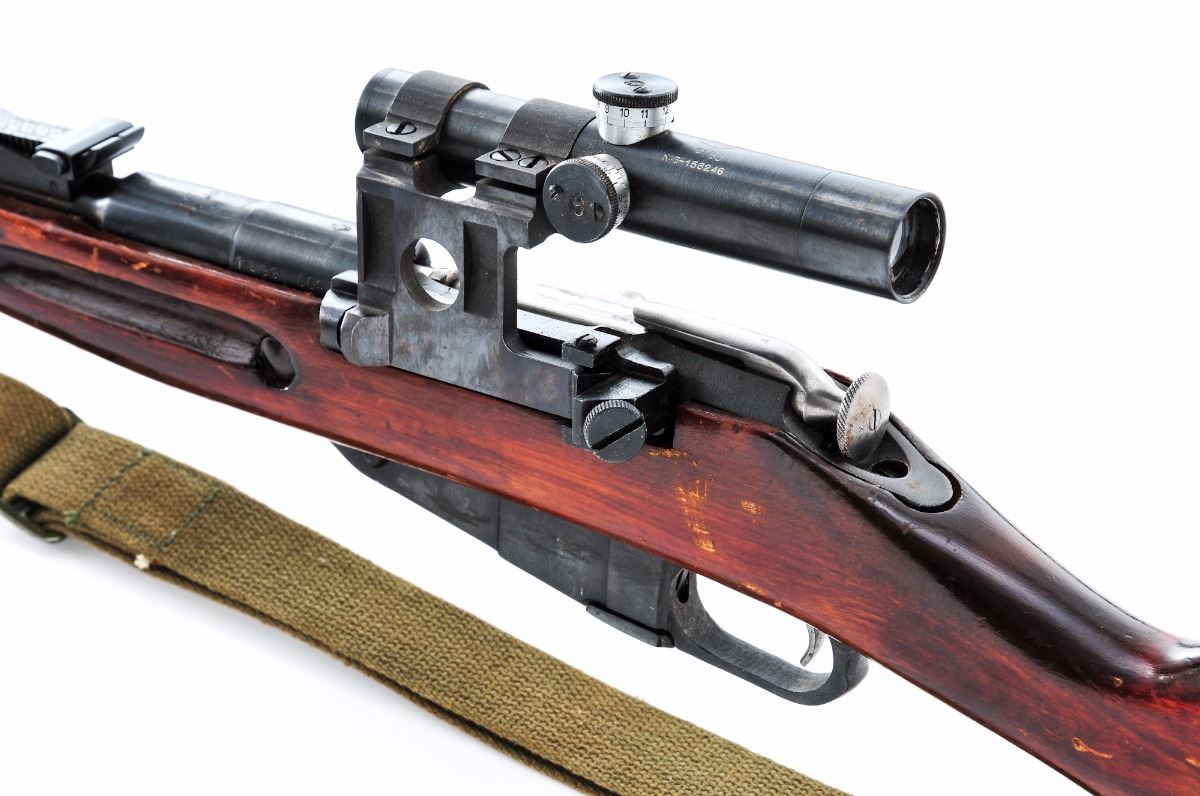 Russian Mosin-Nagant Model 91/30 Bolt Action Sniper Rifle, #TS00114, 7.62x54Rmm, 29'' barrel, blue finish, turned-down bolt handle, Russian hardwood stock, with green canvas sling. Topped with a Russian scope with hammer & sickle over ''91/30'' and lens covers. Bolt, buttplate and triggerguard are matching to receiver. Dated 1944 with faded hammer & sickle, as well as barely visible maker's mark that appears to be Izhevsk with arrow and triangle. Condition is very good as arsenal refinished. Stock with general thinning and flaking to finish overall, as well as hairline crack to right side near bolt handle. Import marked to left side of barrel. Action is crisp, bore is excellent with sharp rifling, scope optics are slightly cloudy but are most likely in need of a thorough cleaning. Est.: $700-$900. (C&R)