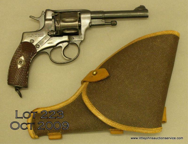 Russian Nagant Model 1895 DA revolver, 7.62 mm cal., 4-1/2” barrel, mat black finish (1941 dated) checkered maroon plastic grips, #N0551. This gun is in overall very good condition as arsenal refinished showing approx. 95% of that finish,good action, bore and grips; with military style flap holster in excellent condition. Est.: $80-$160.