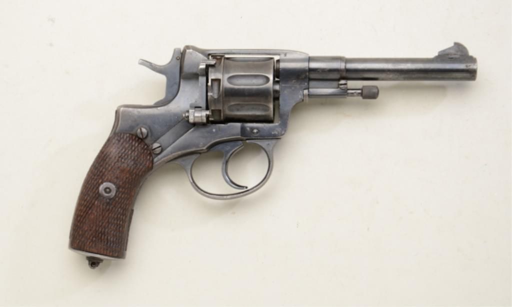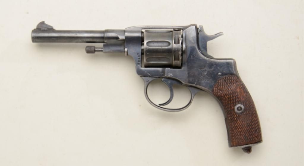 Russian Nagant double-action military issue revolver, 7.62 caliber, Tula Arsenal marked, dated 1938. Serial #467, blued finish, checkered wood grips, with Russian flap holster, cleaning rod. The revolver retains85-95% original arsenal finish. Some minor pitting and erosion, grips very good plus, action tight, bore excellent. Collectors tag attached states “GI bringback, GI captured from German soldier who took it from aRussian soldier”. Dr. Sterling Fenn collection. Est: $400 - $800
