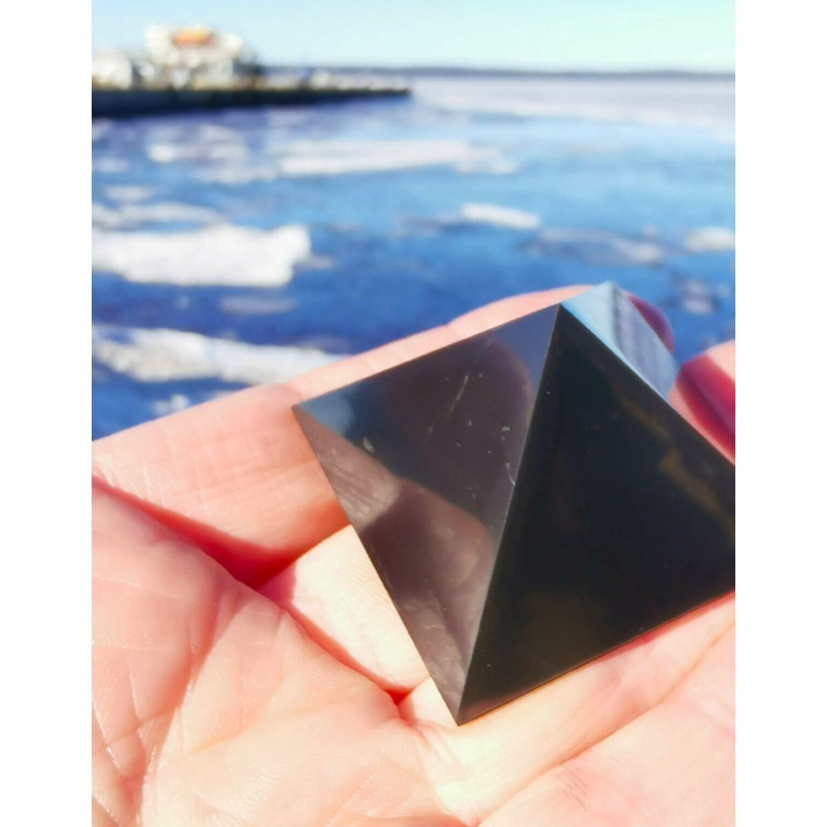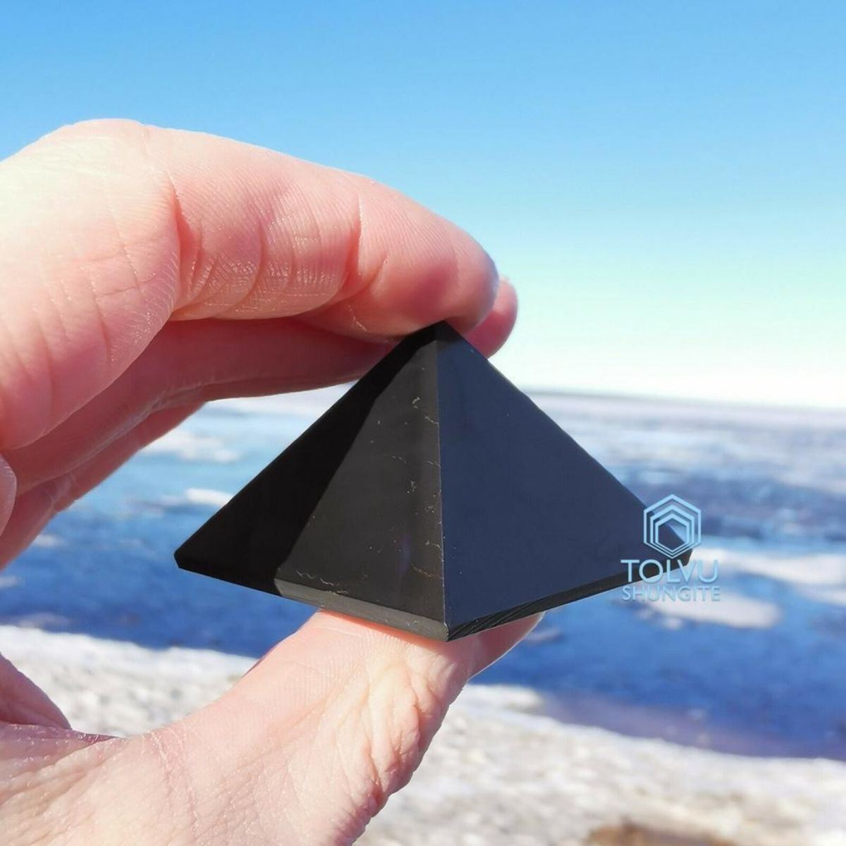 Rare, Russian natural gemstone, black Shungite, cut in the form of a pyramid, direct from Karelia, the only region where real shungite stone is extracted. Not a pressed factory stamped mold, but hand-cut from a monolithic piece of shungite stone, the veins of pyrite and quartz exposed. The surface has not been polished, but has been treated for smoothness on all four faces of the pyramid. 1 1/2" size. 1.4oz. weight. Shungite gets its name from the town of Shunga in the Karelia region of Russia. The stones are made mostly of carbon. Specifically, the stones are made up of clusters of carbon atoms called "fullerenes"  also containing many micro- and macrominerals. Some of these are quartz, mica, albite, and pyrite. The stone is prized as a natural alternative medicinal used to: sooth insomnia, relieve pain, improve energy levels, detoxify the mind, body, and spirit & protect against protect against electromagnetic frequency. Â