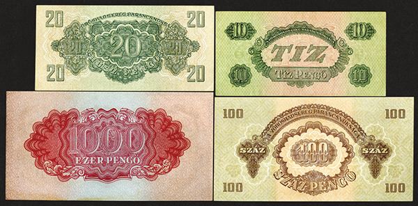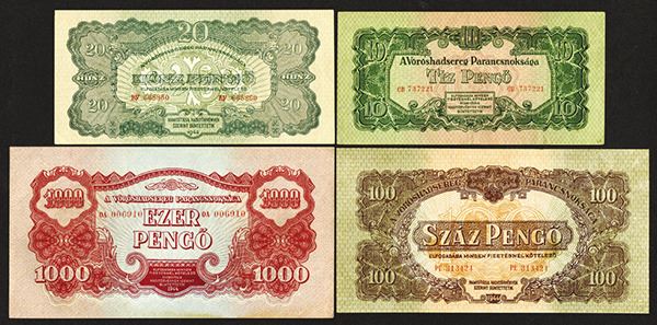 Hungary. 10, 20, 100, 1000 Pengo. P-M5; M6b, M8, M9. First a Nice VF others are Choice Uncirculated, the last with some paper tone. 4 pieces.