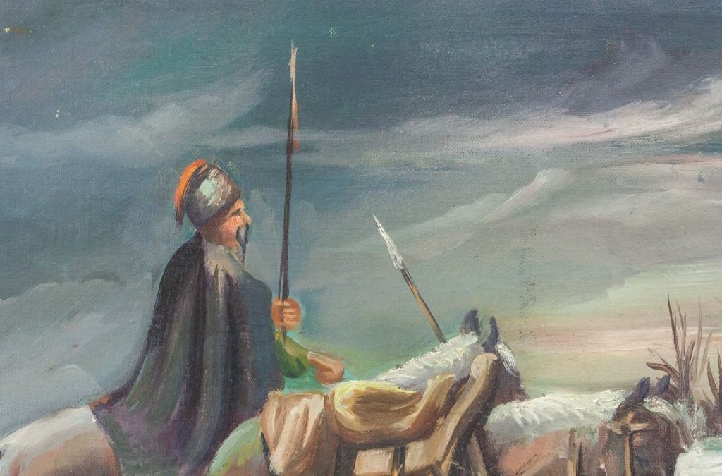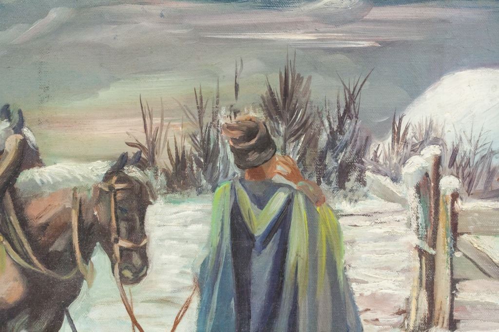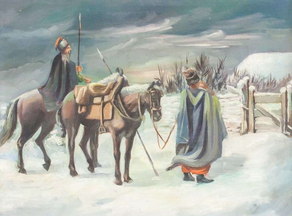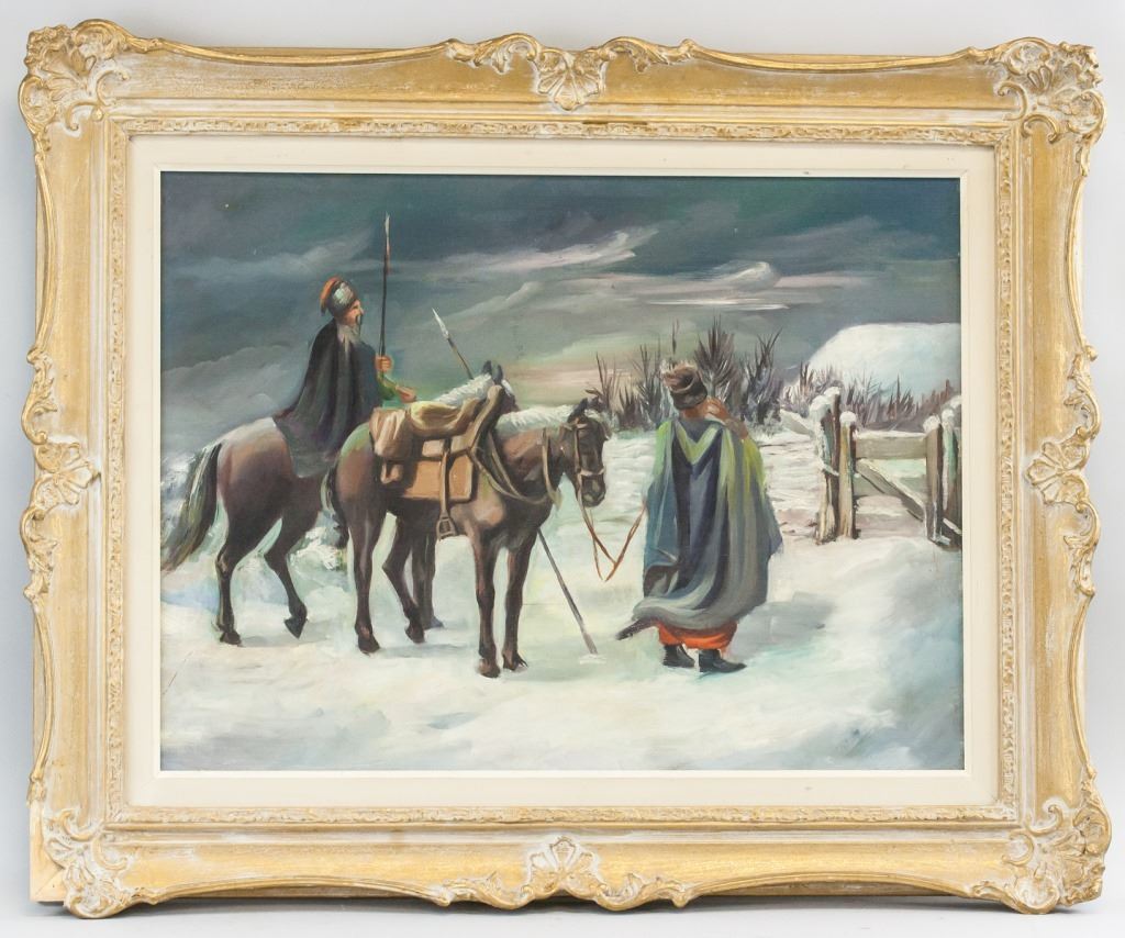 Oil on board, framed. Featuring two men carrying spears riding through the snow. Illegible stamp on verso. 46 x 61 cm (18 x 24 in), Frame: 63 x 78 cm (24.75 x 30.75 in).