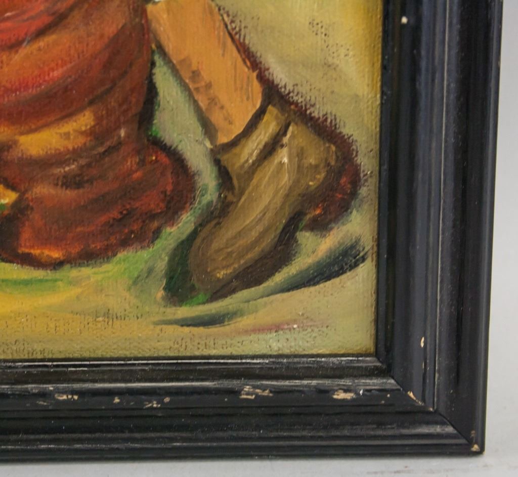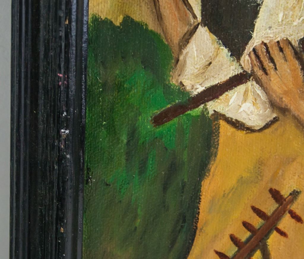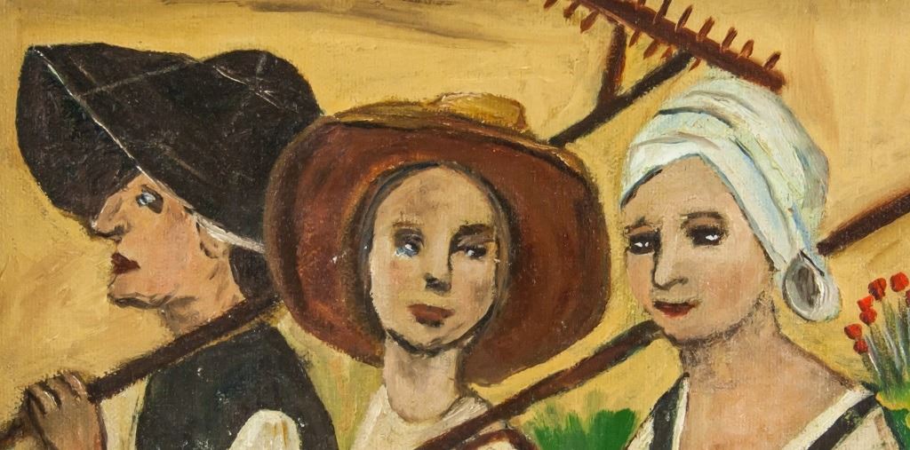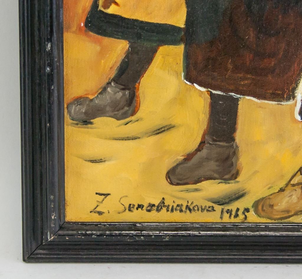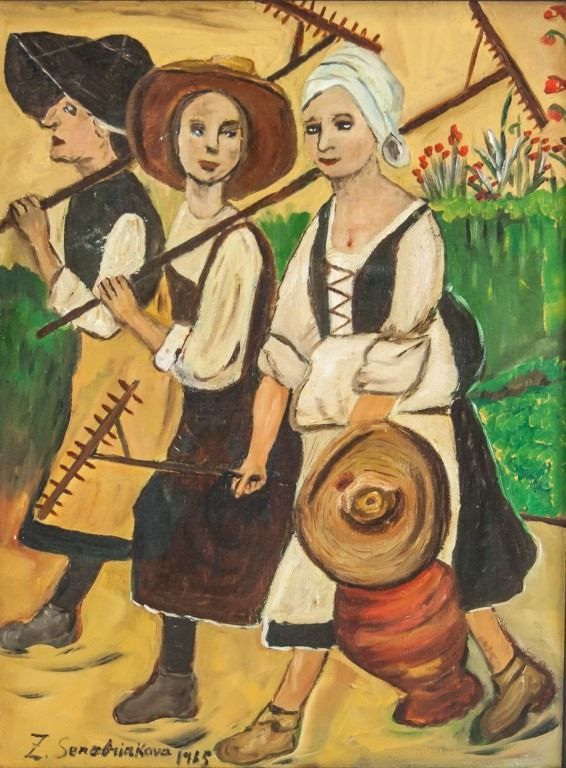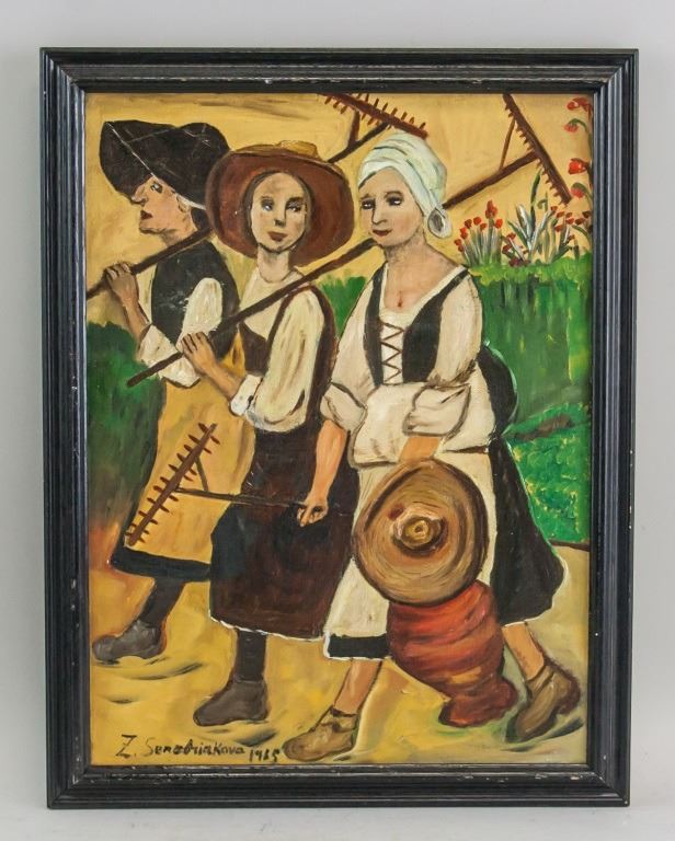 Oil on canvas, framed. Featuring three woman in farmer's smocks carrying tools and pots. Signed "Z. Senebriakova" to the bottom left, with "1965" inscribed beside the signature. 39 x 29 cm (15.5 x 11.5 inches), Frame: 44 x 35 cm (17 x 13.5 inches).