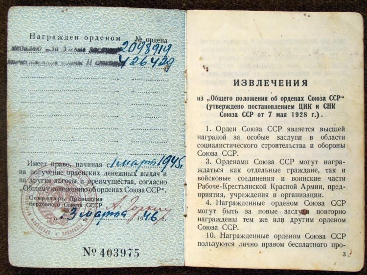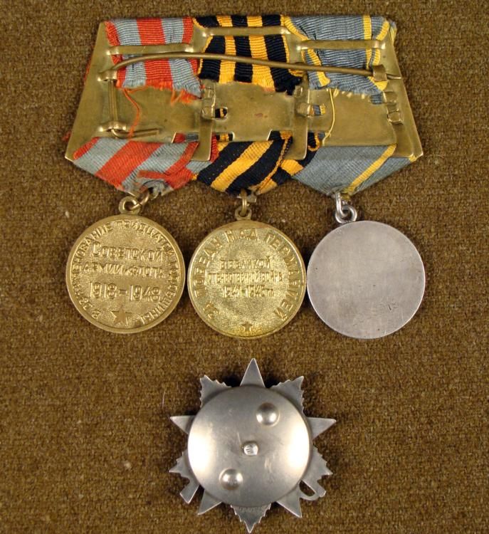Here is a Russian passport, plus four military medals. * The passport is hand-dated from 1946, and has pen and ink writing. It has a linen cover, and is in very good condition. * There is a trio of medals with folded ribons on a single metal backing with pin-back. The medals, from left to right, represent the following: * BraveryVictory in WII- Beat Germany30 Years of the Russian Army, showing Stalin and Lenin * There is a single enameled medal with hammer and sickle. It has a screw-back. * This is a great collection for any Russian military collector.