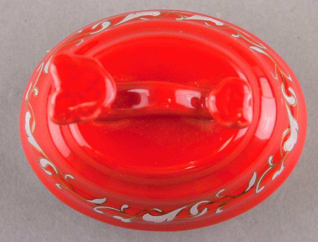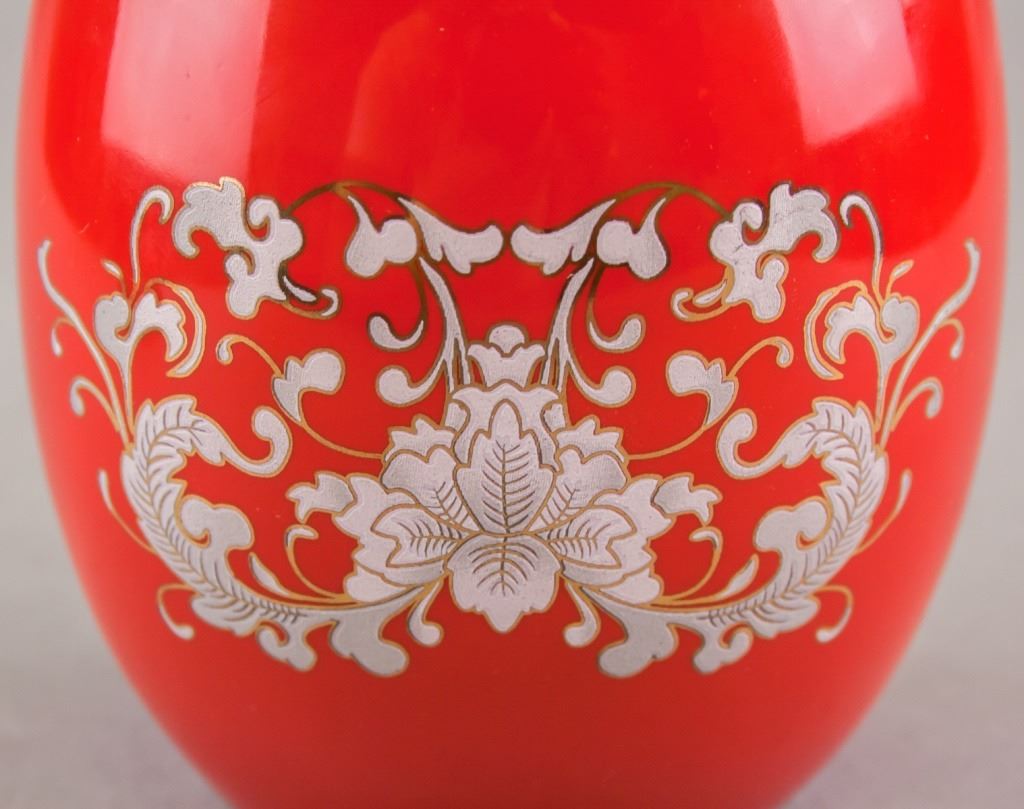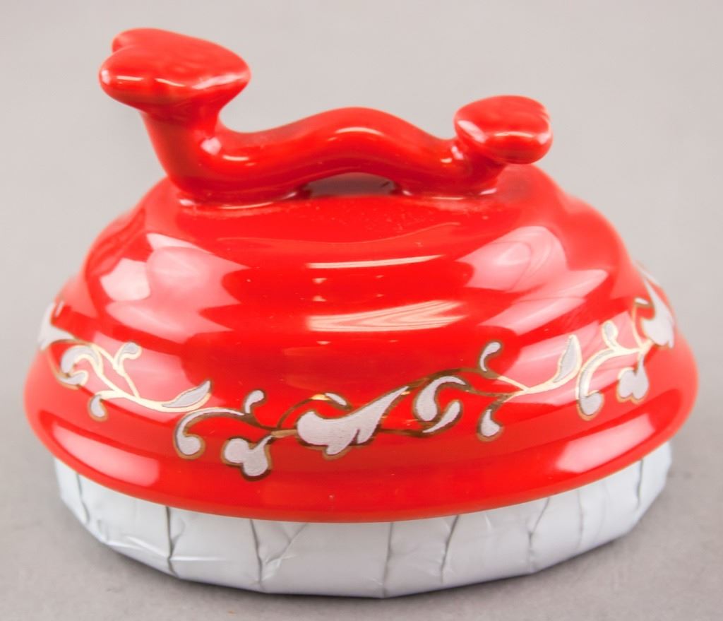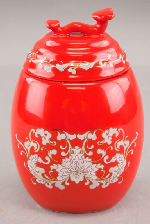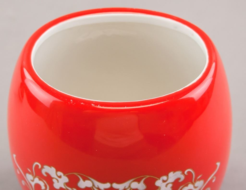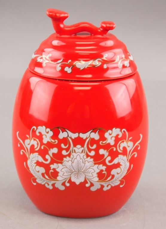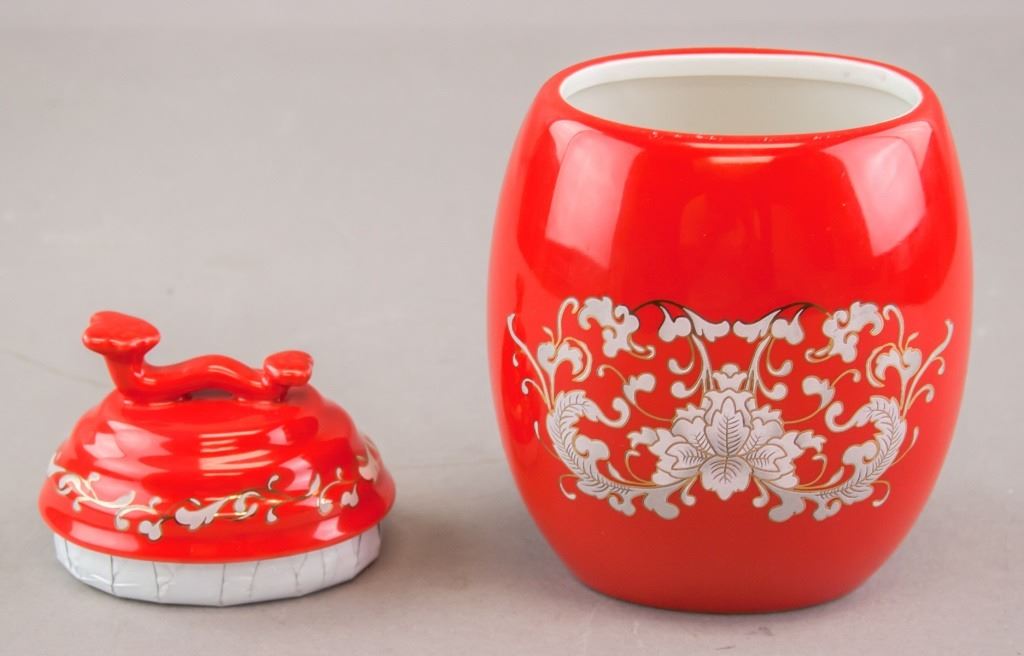 Russian porcelain jar. Of red tone with white and gold pattern. 18 x 12 cm. 513 grams.