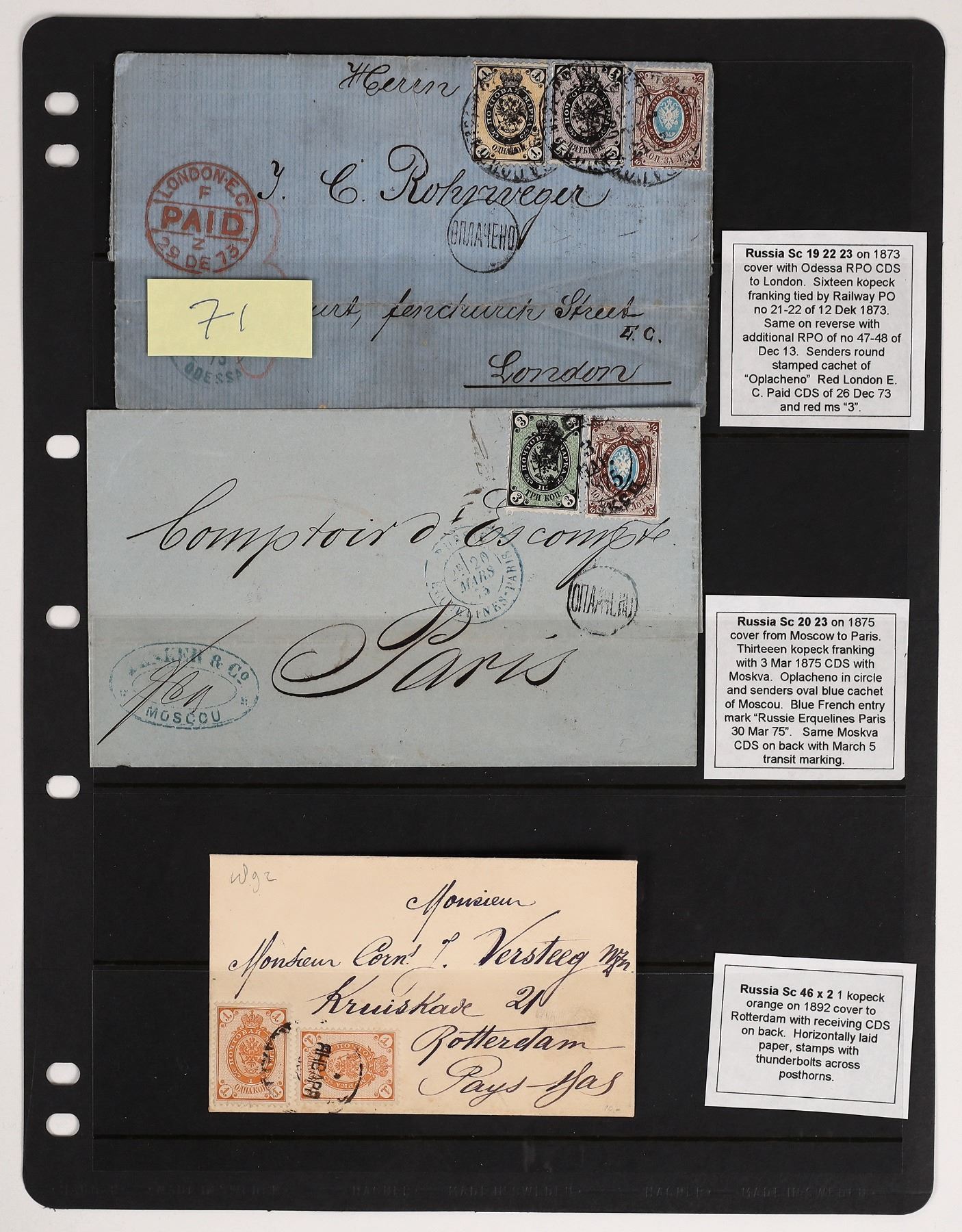 Russia. 1873 lettersheet to London franked with 10k, 5k & 1k tied by POCHTOVI VAGON No. 21-22 railway P.O. date stamps with No. 47-48 transit on reverse, pretty three-color franking; 1875 lettersheet to Paris with 10k & 3k tied by Moscow date stamp; and 1892 petite cover to Rotterdam with 1k (x2).