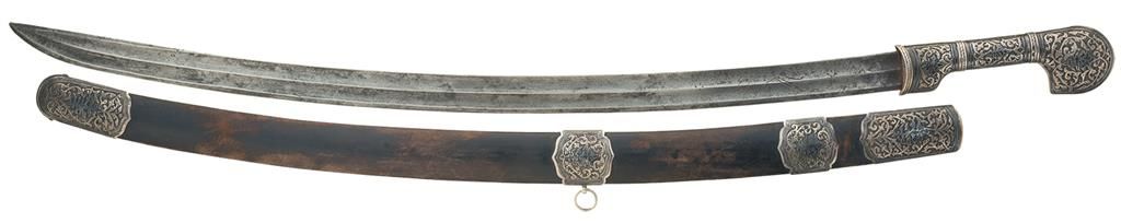 Measuring 35 1/2 inches overall, with a 28 3/4 inch long curved double fuller blade, which is engraved on the left side with two sets of four stars flanking an animal (a copy of a running wolf of Soligen). The hilt is silver, with engraved and selectively darkened scroll designs, a flared and split pommel, and a set of small proof marks reading "(delta symbol, woman's head)84" and "(inverted V) * K", indicating production in Moscow circa 1908-1926. With a leather sheath, outfitted with silver furniture which is proofed and decorated to match the hilt.