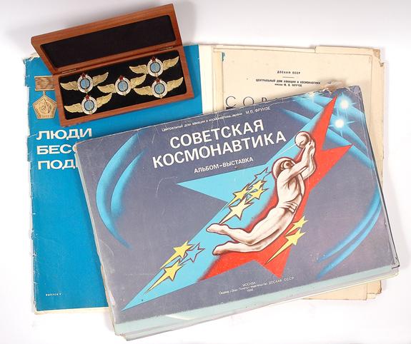 Russian Program, Autographed Color Photos. Lot of 13 color photos (10x8" and larger, most on Kodak paper) signed by Dezhurov, Krikalev, etc and picturing MIR as seen from various flights (including one of the Shuttle docked with MIR. ALSO a set of Cosmonaut Wings mounted in a wooden presentation box, a group rare set of 117 35mm. Color Slides of early AND late Soviet space flights, and sets of Propaganda Prints including 1) a 1976 set of 34 different black and white prints/posters (16x12") of the first cosmonauts, each with a photo and biography, 2) a 1976 set of 90 different black and white/color prints/posters of the early space program with complimentary explanatory booklet and 3) a 1986 set of 82 different plack and white prints/posters showing the "History of Soviet Cosmonautics". All three sets are in their original paper folders/covers and are quite scarce.